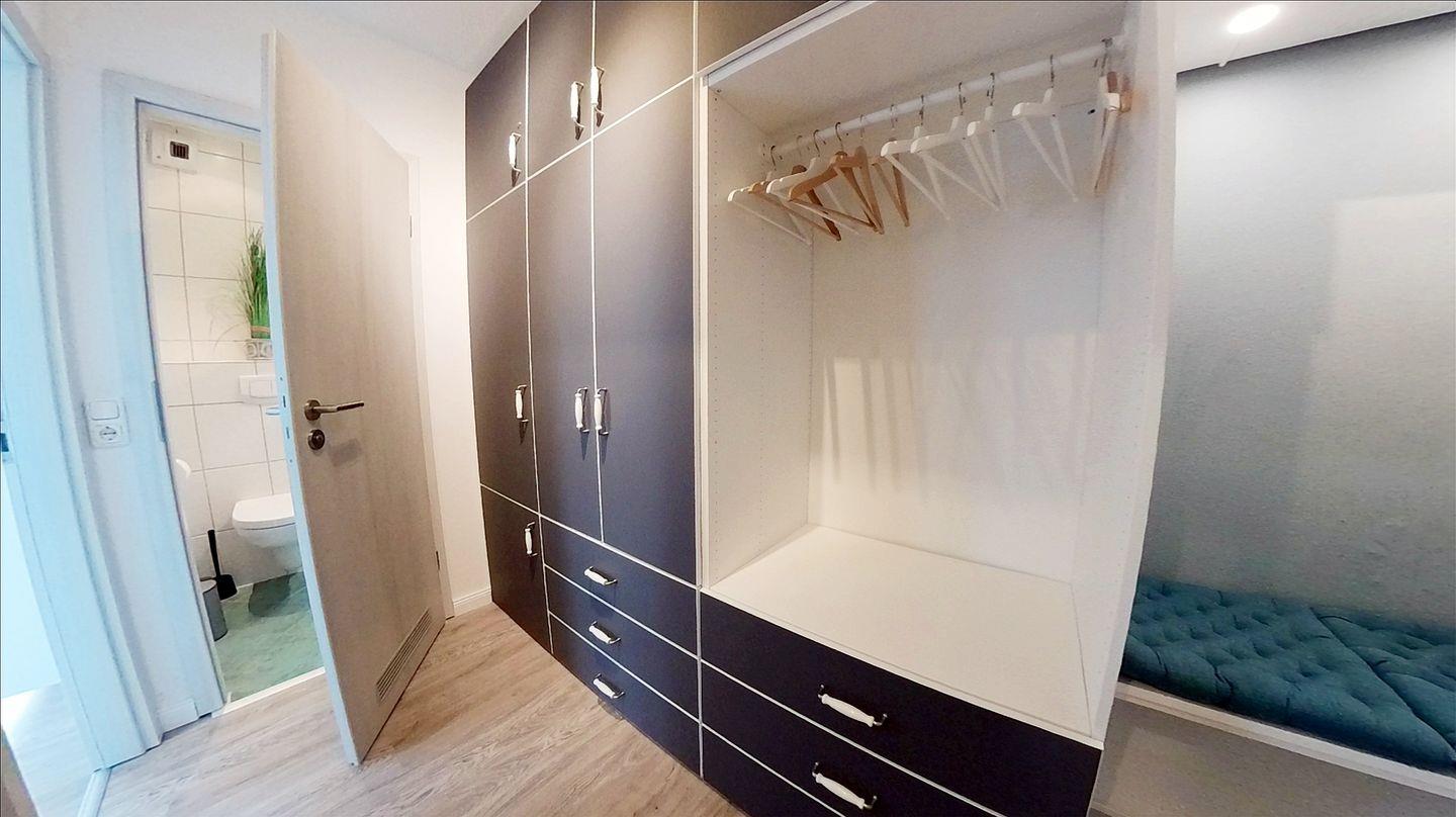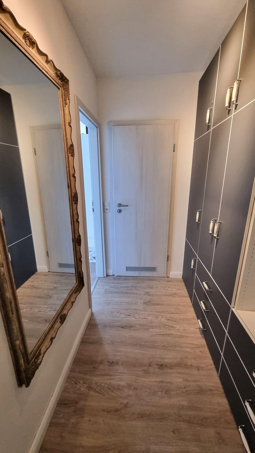 Im Flur befindet sich ein geräumiger Schrank für viel Stauraum mit einer Sitzgelegenheit im Eingangsbereich, um seine Schuhe bequem an- und ausziehen zu können oder auch als Abstellmöglichkeit zu nutzen.