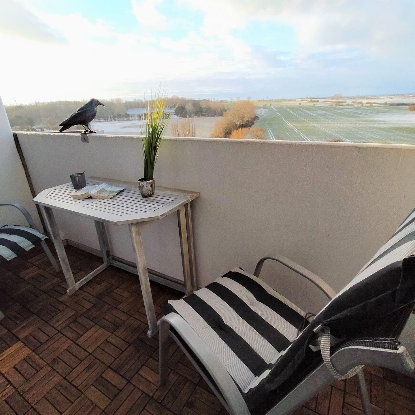 Die Tagessonne vom Balkon genießen mit einem TOP-Blick über die Salzwiesen und Felder zur Ostsee in Richtung Hohwachter Bucht.