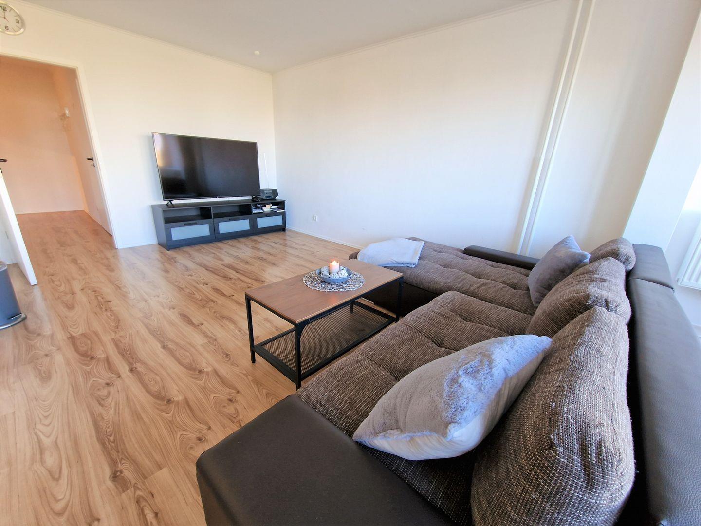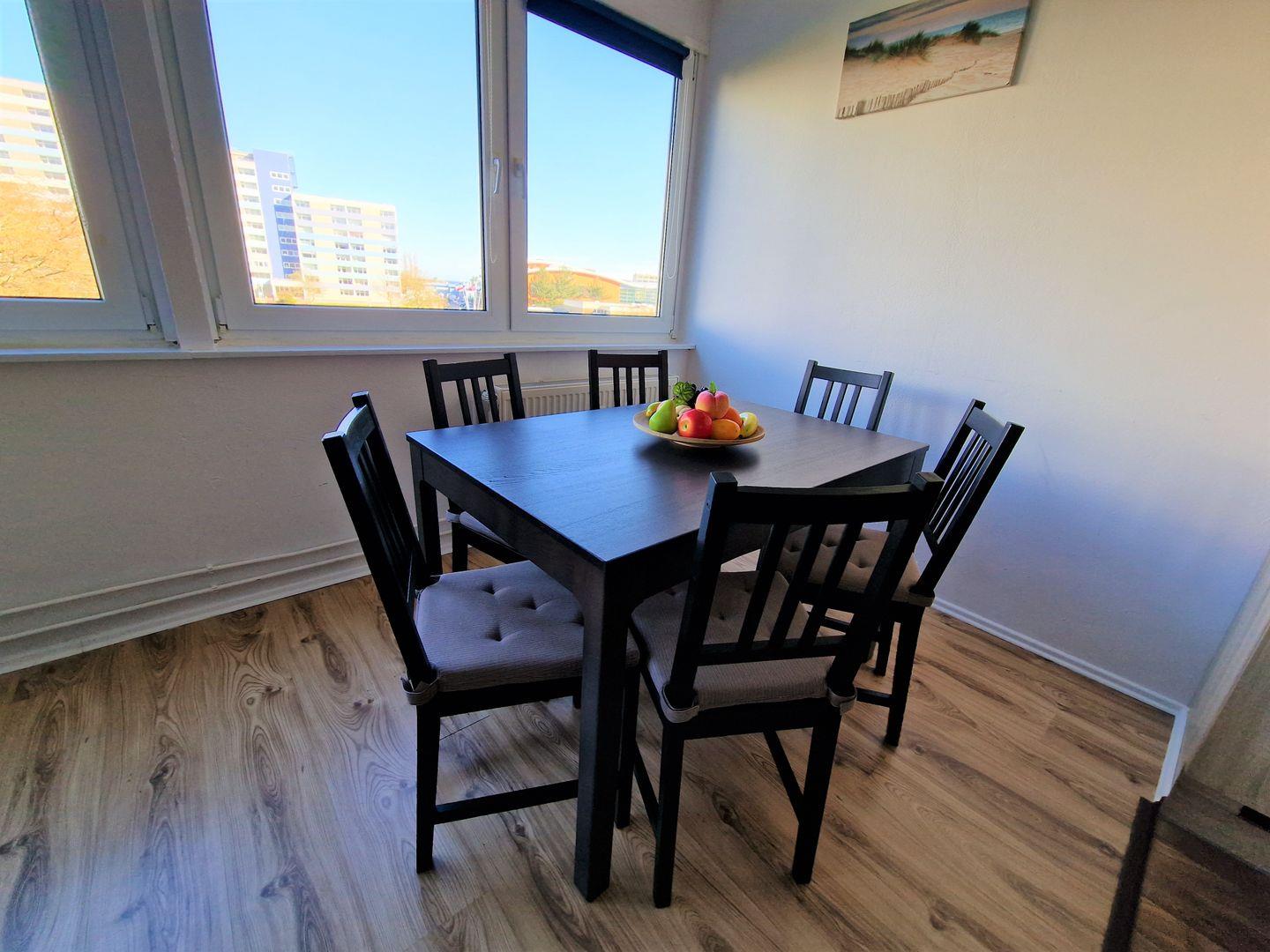 Durch den geräumigen Eingangsbereich der Wohnung erreichen Sie den lichtdurchfluteten Wohnbereich mit offener Küche. Durch die Panoramafenster haben Sie einen direkten Blick in den parkähnlichen Innenhof und können bei klarem Wetter bis zur Ostsee schauen.