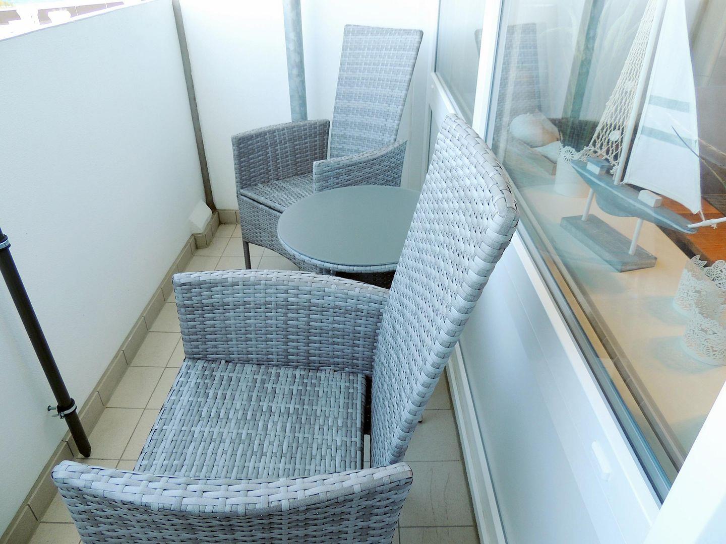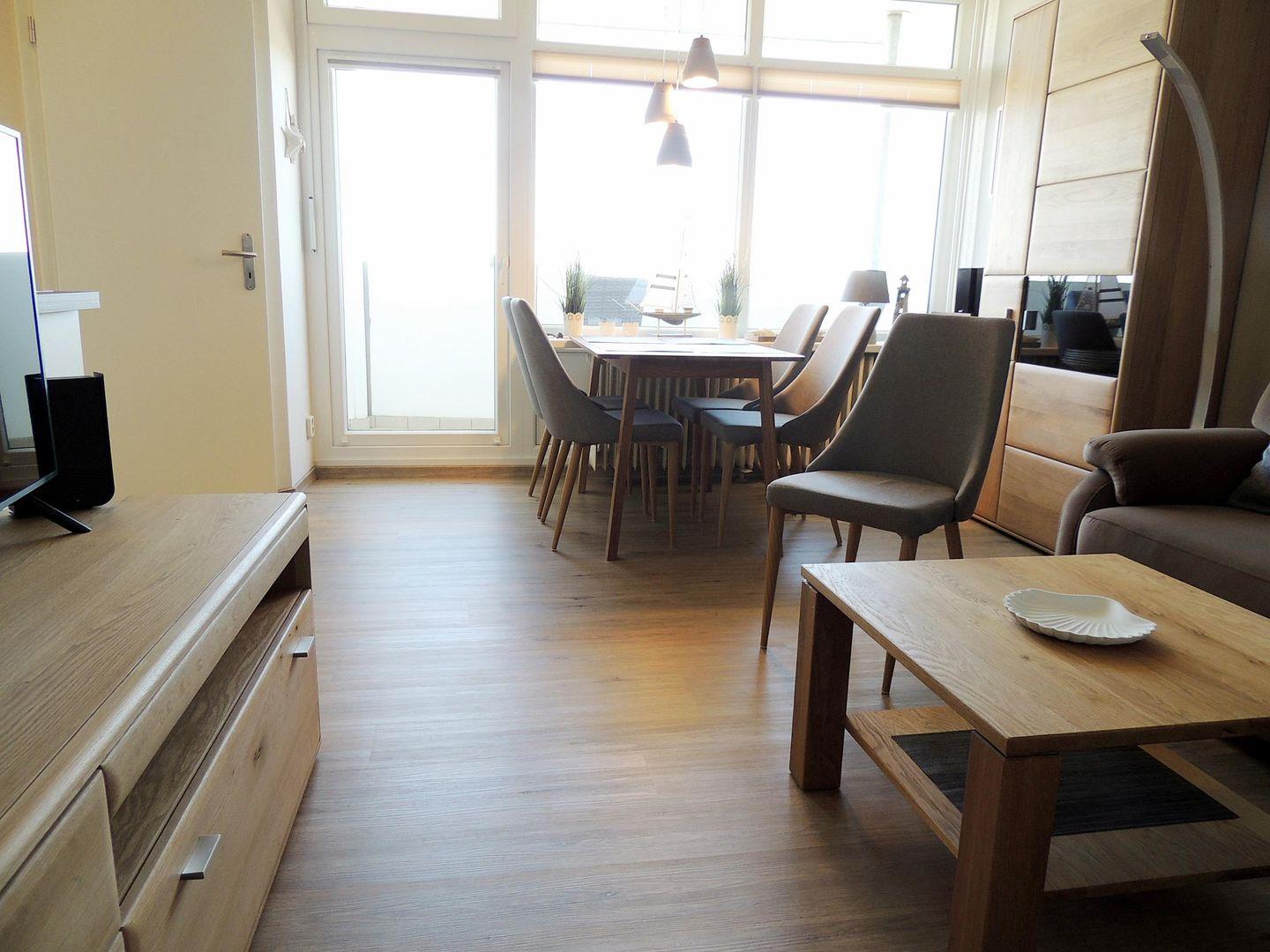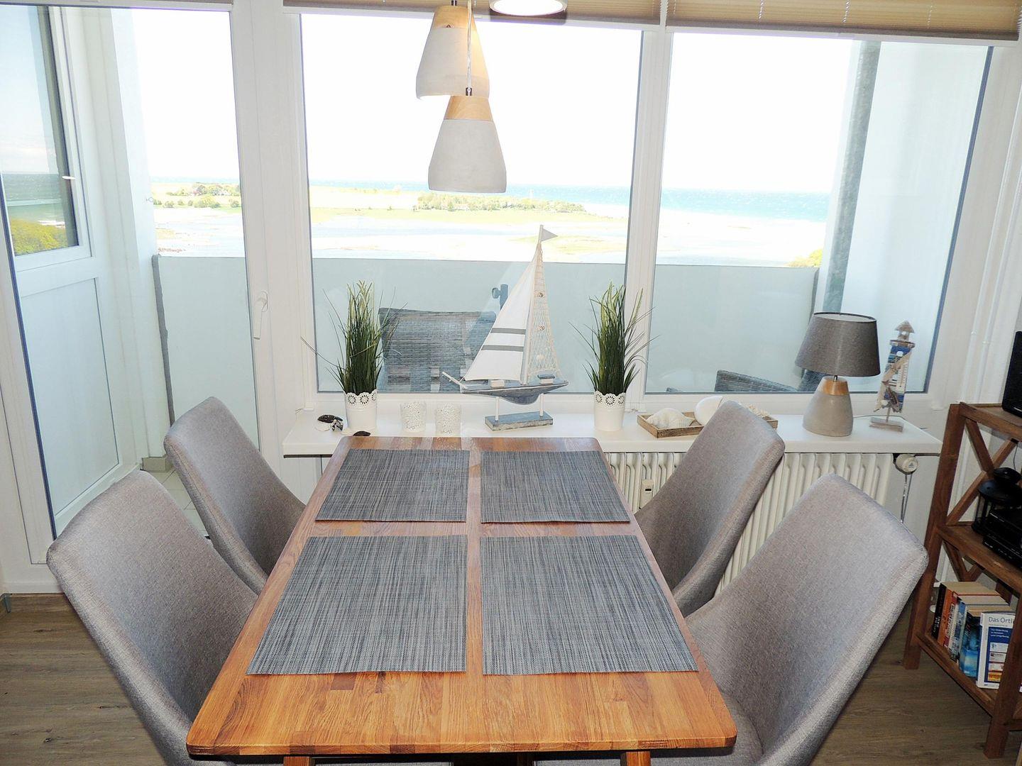 Genießen Sie vom Essbereich einen traumhaften Blick zur Ostsee. Hier finden bis zu 4 Personen Platz. Direkt und offen angrenzend ist der Wohnbereich.