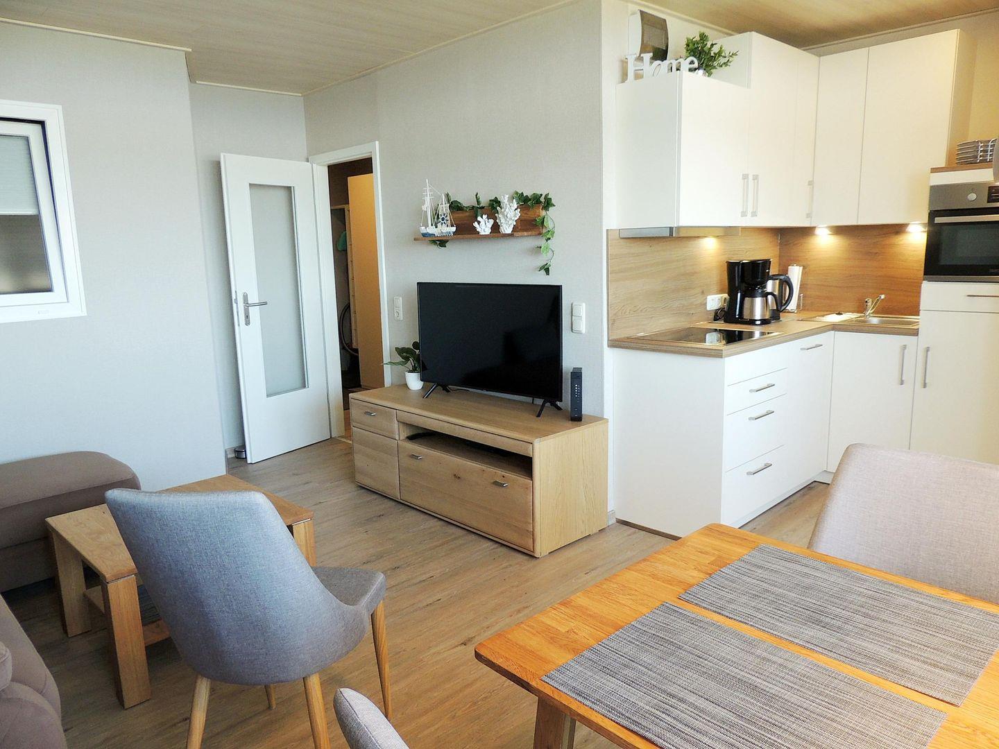 Die angrenzende Küche, ebenfalls offen zugänglich, ist komplett ausgestattet und verfügt über Extras wie Backofen und Spülmaschine. Kaffeemaschine, Wasserkocher, Toaster und Eierkocher runden den Komfort ab.