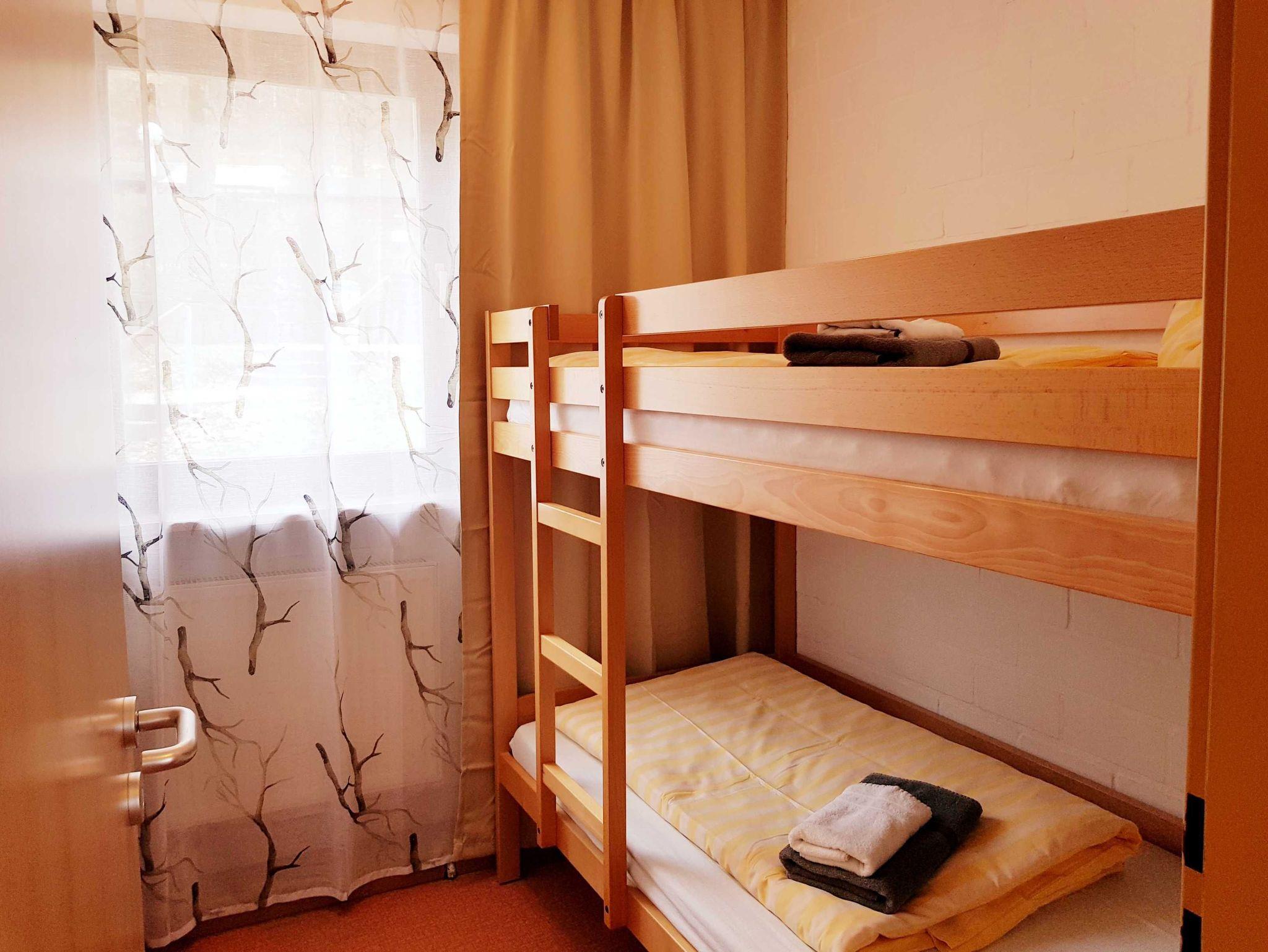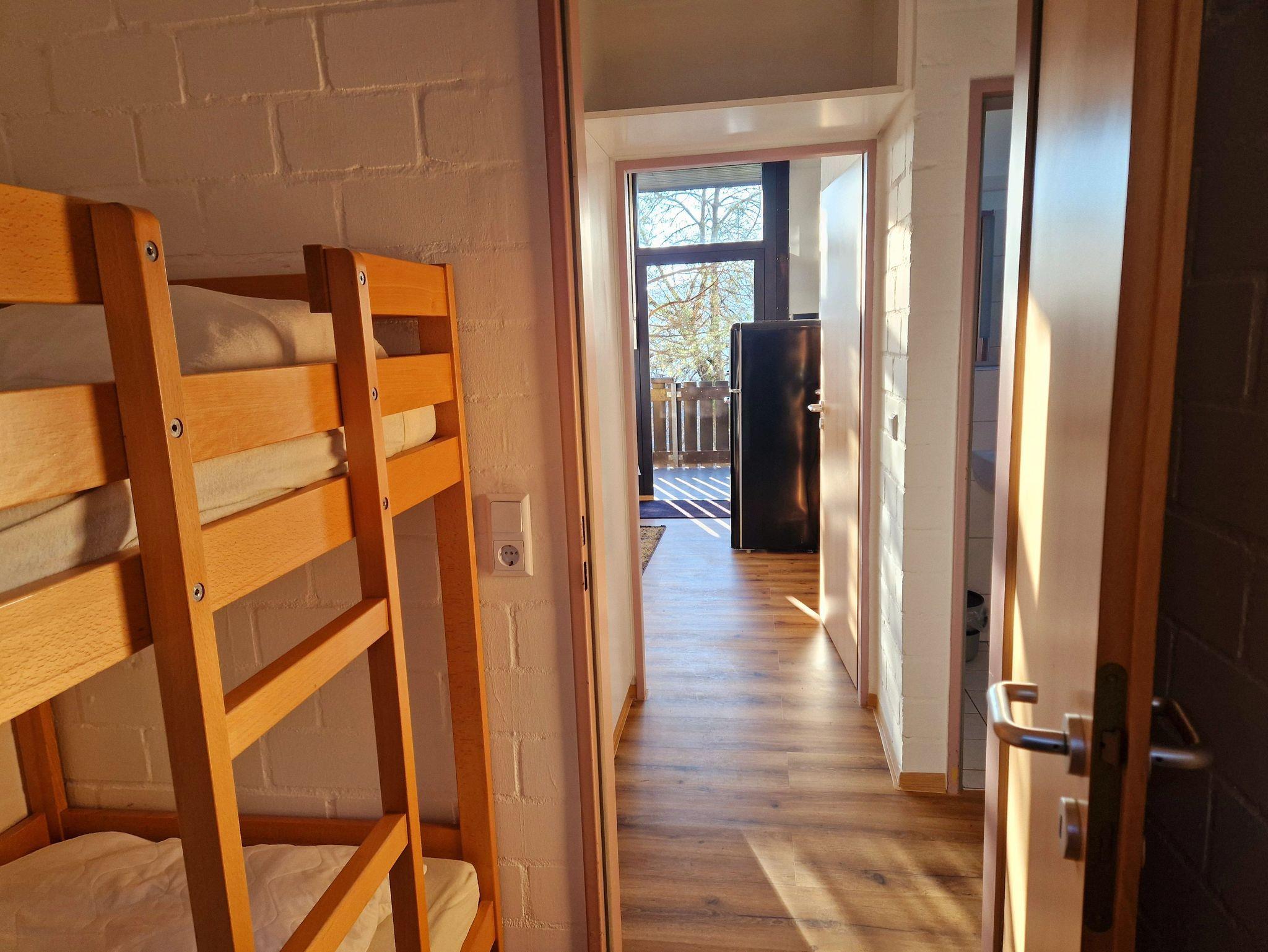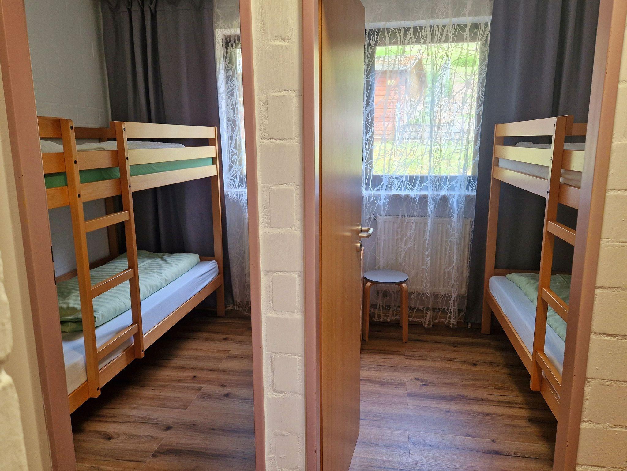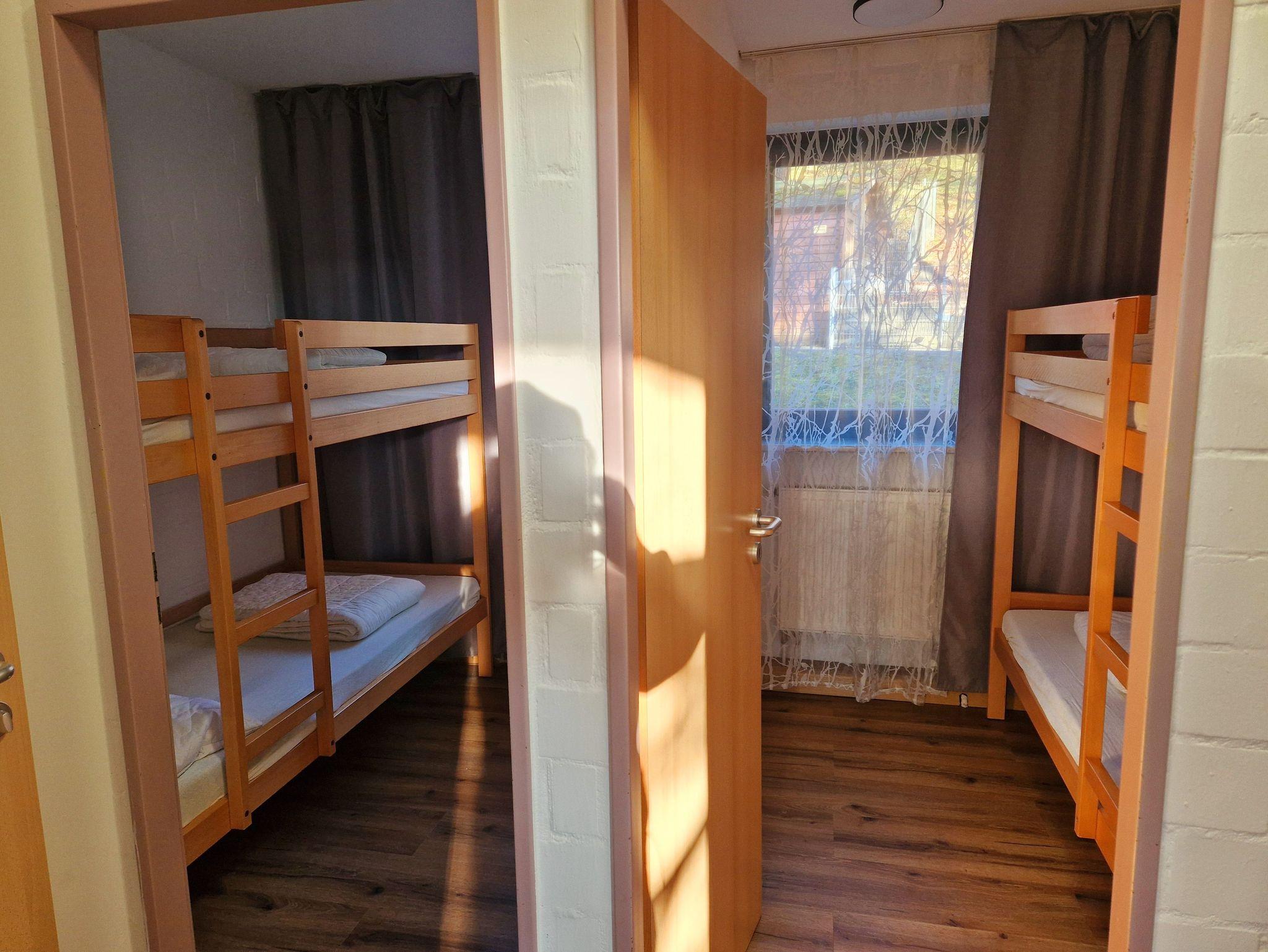 Zimmeraufteilung: 1 Schlafzimmer mit Doppelbett, 2 Schlafzimmer mit Etagenbett.