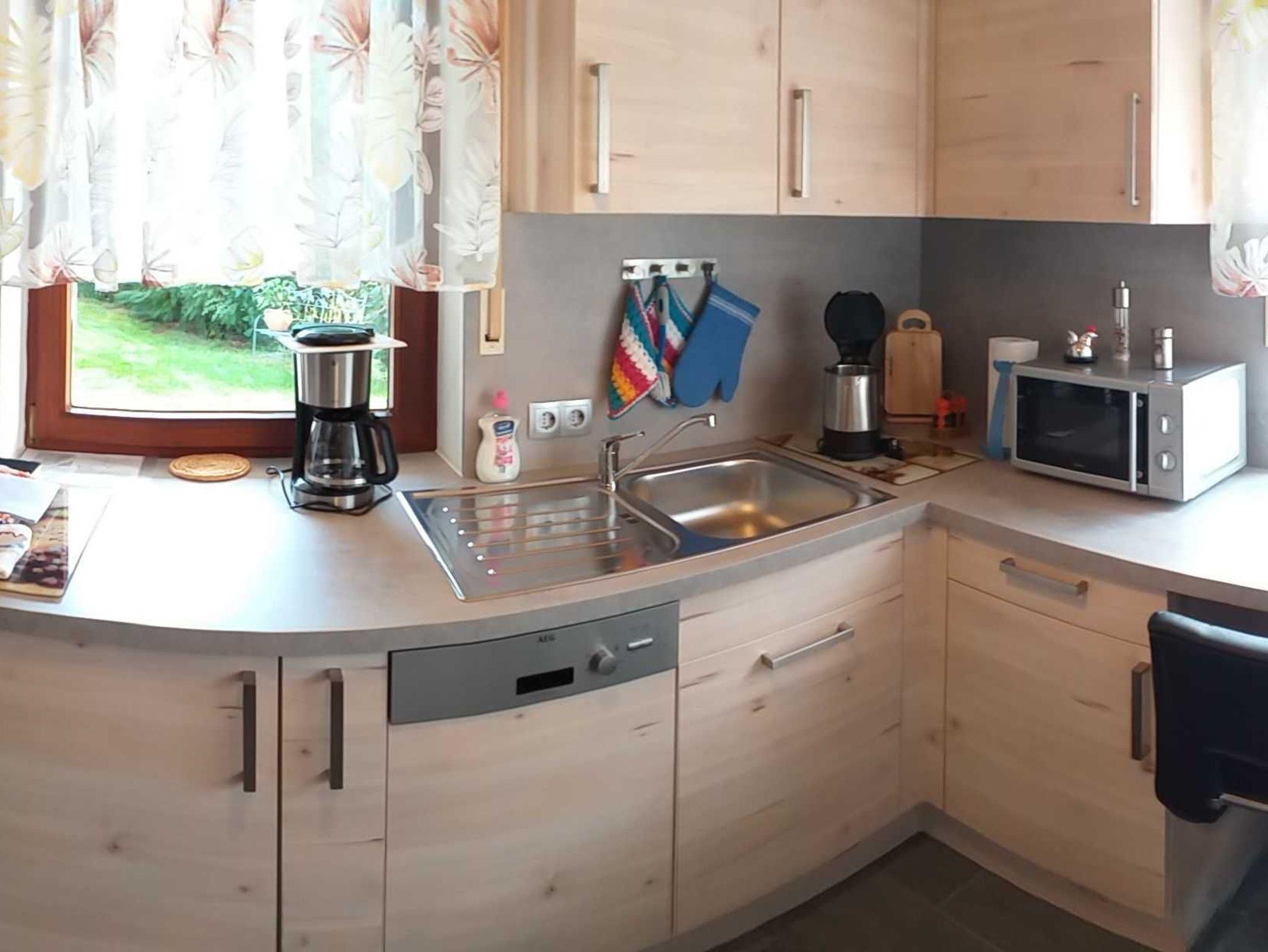 Die Küche ist voll ausgestattet mit Geschirr, Kaffeemaschine, Toaster, Gewürzen, Kühlschrank, Kochfeld, Backofen und Mikrowelle. Der Essbereich bietet Sitzmöglichkeiten für 4 Personen und auf Wunsch einen Kinderhochstuhl. Das Badezimmer mit Tageslichtverfügt über Dusche, Badewanne, WC, Bidet und Föhn.