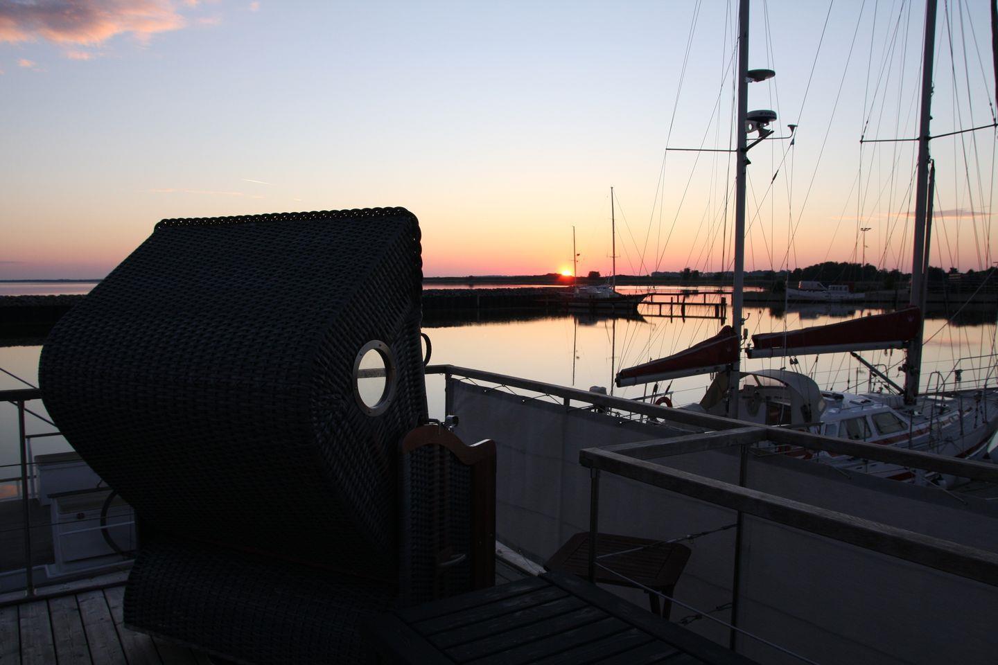 Das großzügige Sonnendeck erstreckt sich über die gesamte obere Etage und bietet einen Rundumblick über den Hafen und Bodden. Liegen, Deckchairs und Strandkorb laden zum Entspannen, zu Sundowner & Co ein.