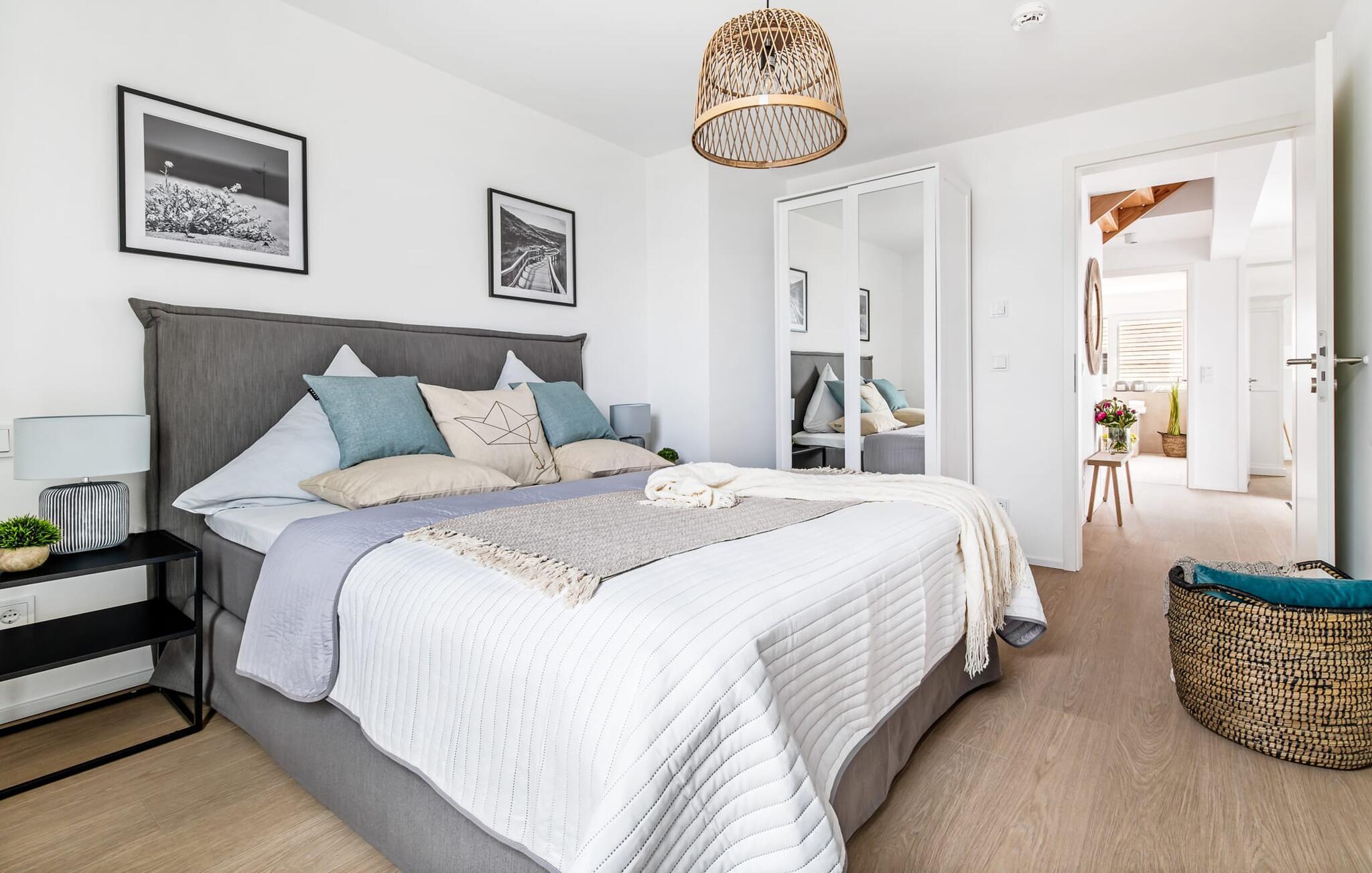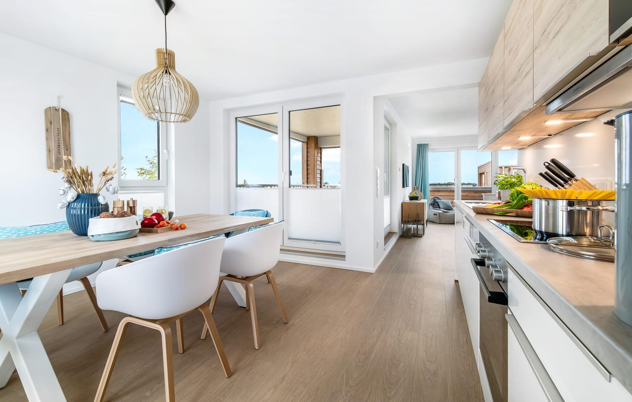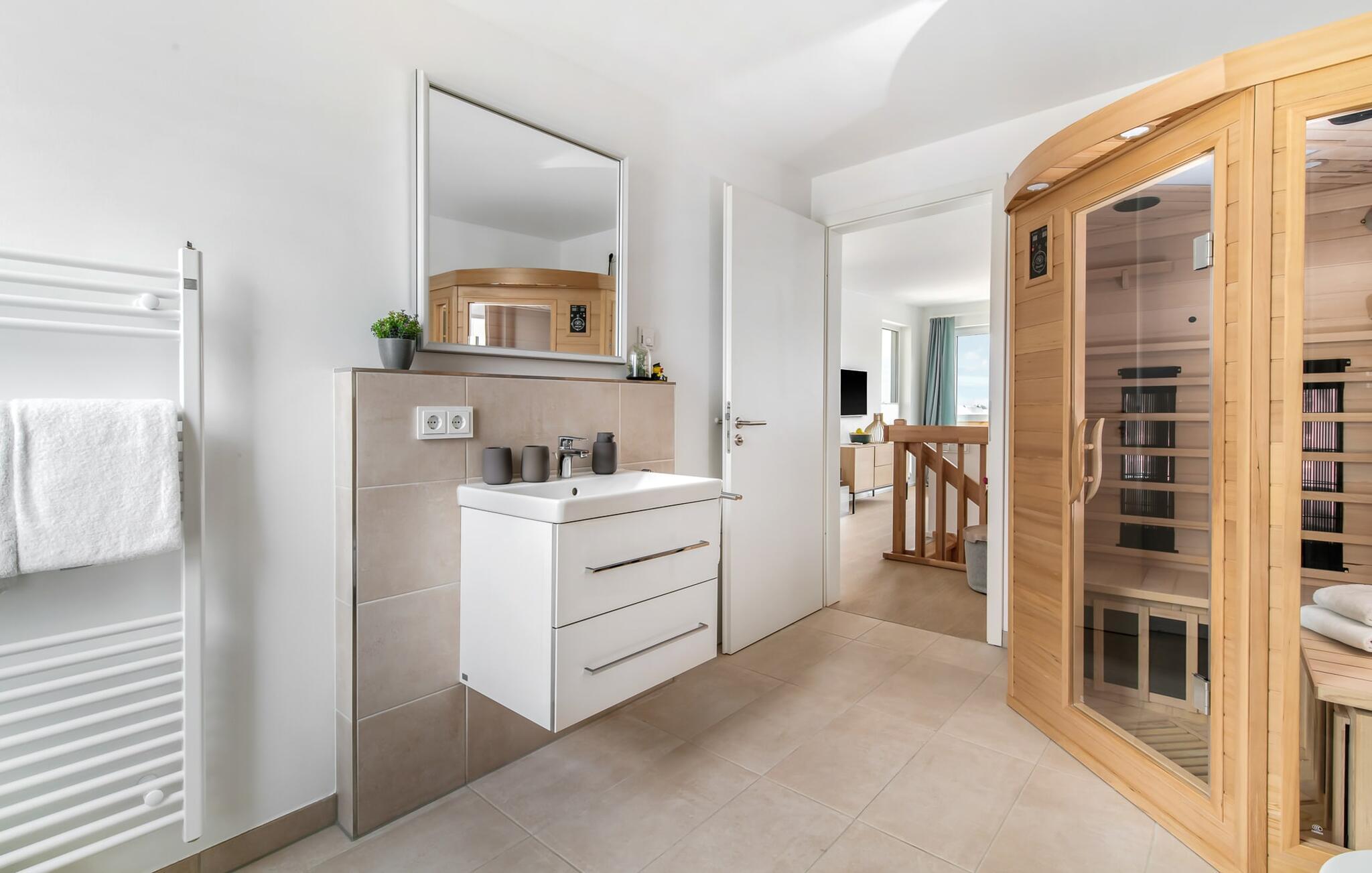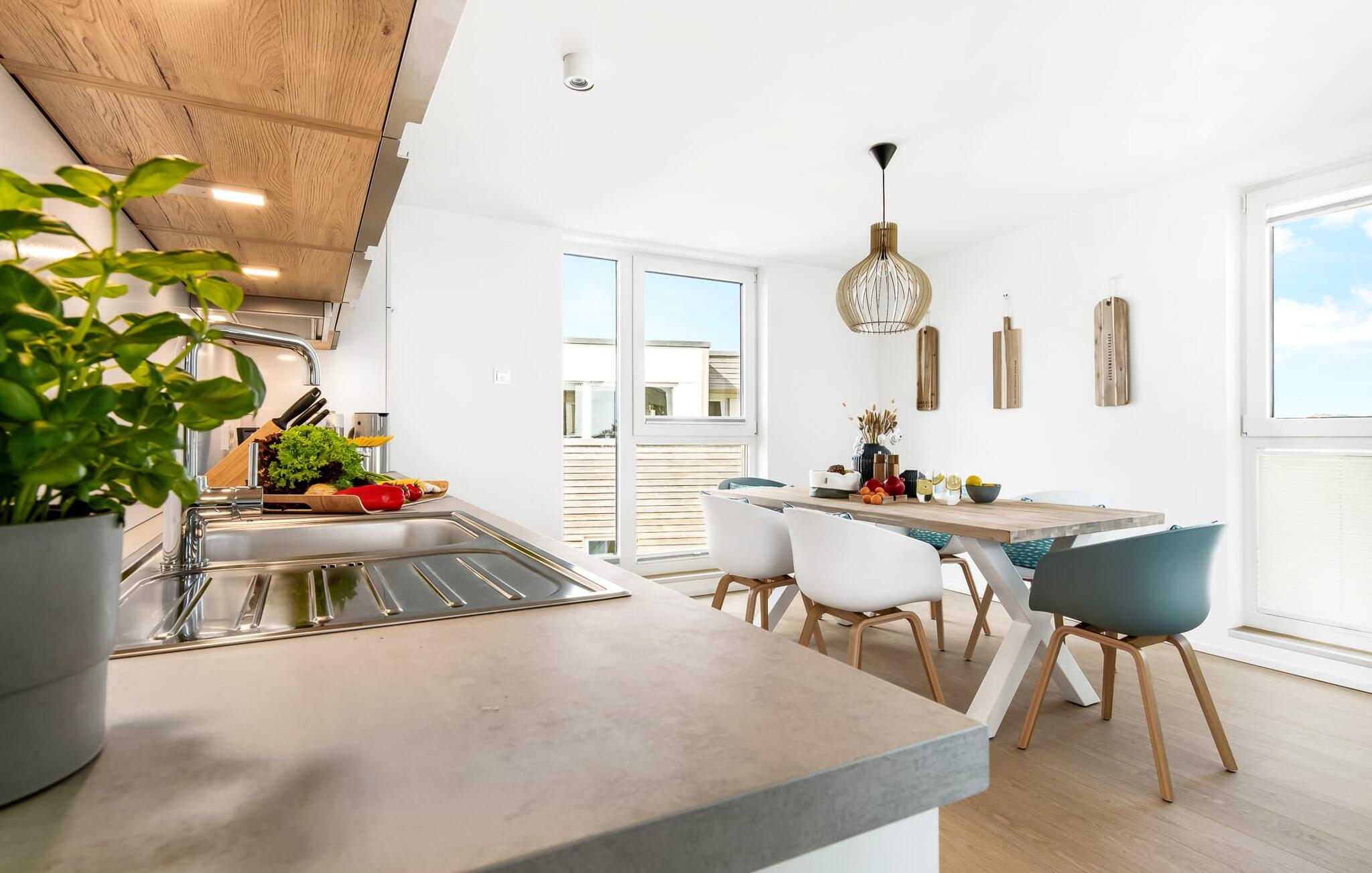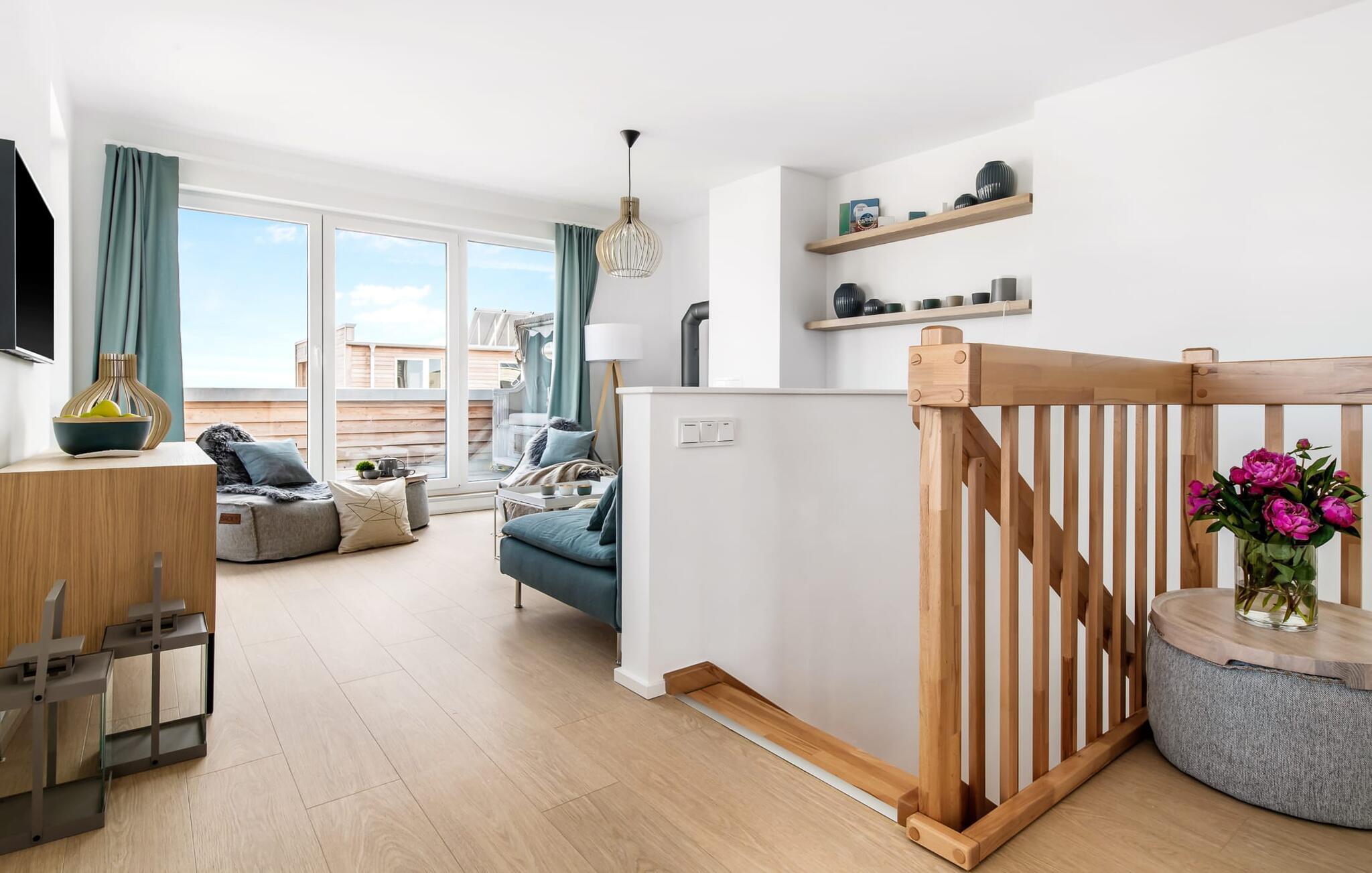Heimat Loft er en rummelig og rummelig maisonette ferielejlighed på første og anden sal. Med tre soveværelser, en stor terrasse og udsigt over havnen og Østersøen er Heimat Loft den perfekte ferielejlighed til jeres ferie ved Slei og Østersøen med hele familien. Havnepromenaden i OstseeResort Olpenitz med dets voksende udbud og indkøbsmuligheder samt sejl- og sportsbådshavnen i OstseeResort Olpenitz ligger i umiddelbar nærhed af ferielejligheden. Stranden Weidenfelder ligger kun 450 m væk og kan nemt nås til fods fra lejligheden. Den maritime minigolfbane ligger også i umiddelbar nærhed og byder på sjov for hele familien. Heimat Loft giver en feriefølelse med en karakter! Lejlighedens tre soveværelser ligger på første sal, med i alt tre dobbelte boxmadrasser. En 180 cm bred og to 160 cm bred. Uanset hvilket soveværelse I vælger, kan I være sikker på en afslappende søvn. Et af soveværelserne har desuden hjemmekontor og en lille altan med udsigt over havnen. Udover soveværelserne er der også et rummeligt badeværelse med badekar og vaskemaskine, samt et rummeligt depotrum, der også kan bruges som garderobe. Når I ankommer på anden sal, bliver I budt velkommen af vinduesfronten fra gulv til loft med en tilstødende terrasse. De lyse værelser, indrettet med sans for detaljer, en hyggelig opholdsstue og pejsen skaber en atmosfære. Her siger navnet det hele, og I føler jer straks hjemme! Det åbne køkken-alrum er indrettet til høj standard og sikrer sjov madlavning sammen med udsigt til havnen også på ferie. I har adgang til den store, delvist overdækkede terrasse med syd-vest orientering og en flot udsigt over ferieparken mod Østersøen direkte fra opholdsstuen eller køkkenet. Der er et terrassebord og, for en ægte Østersø-feriestemning, en strandstol og en elektrisk grill til jeres rådighed. Her kan I tilbringe afslappende timer i solen hele dagen og se fantastiske solnedgange. Et andet komplet badeværelse med wellnesskarakter, en rummelig panoramabruser på gulvniveau og infrarød sauna afrunder hele pakken ideelt til en afslappende ferie. Der er også tænkt på de små: Ud over højstol og rejseseng har lejligheden også strandlegetøj til børnene. I finder jeres egen parkeringsplads foran ferielejligheden. Vores favoritsted: Efter sol, strand og sjov, afslutte dagen med en hyggelig grillaften og en vidunderlig solnedgang på terrassen... Bemærk venligst: OstseeResort Olpenitz er meget populært, og der bygges fortsat i parken. Ikke desto mindre kan I se frem til en 5-stjernet standard og et førsteklasses ophold. Byggeaktiviteterne kommer ikke til at forstyrre jer på ferien, og derfor gives der ikke yderligere afslag i prisen.