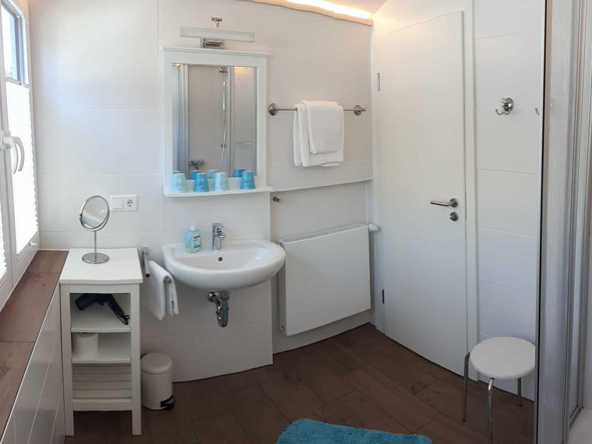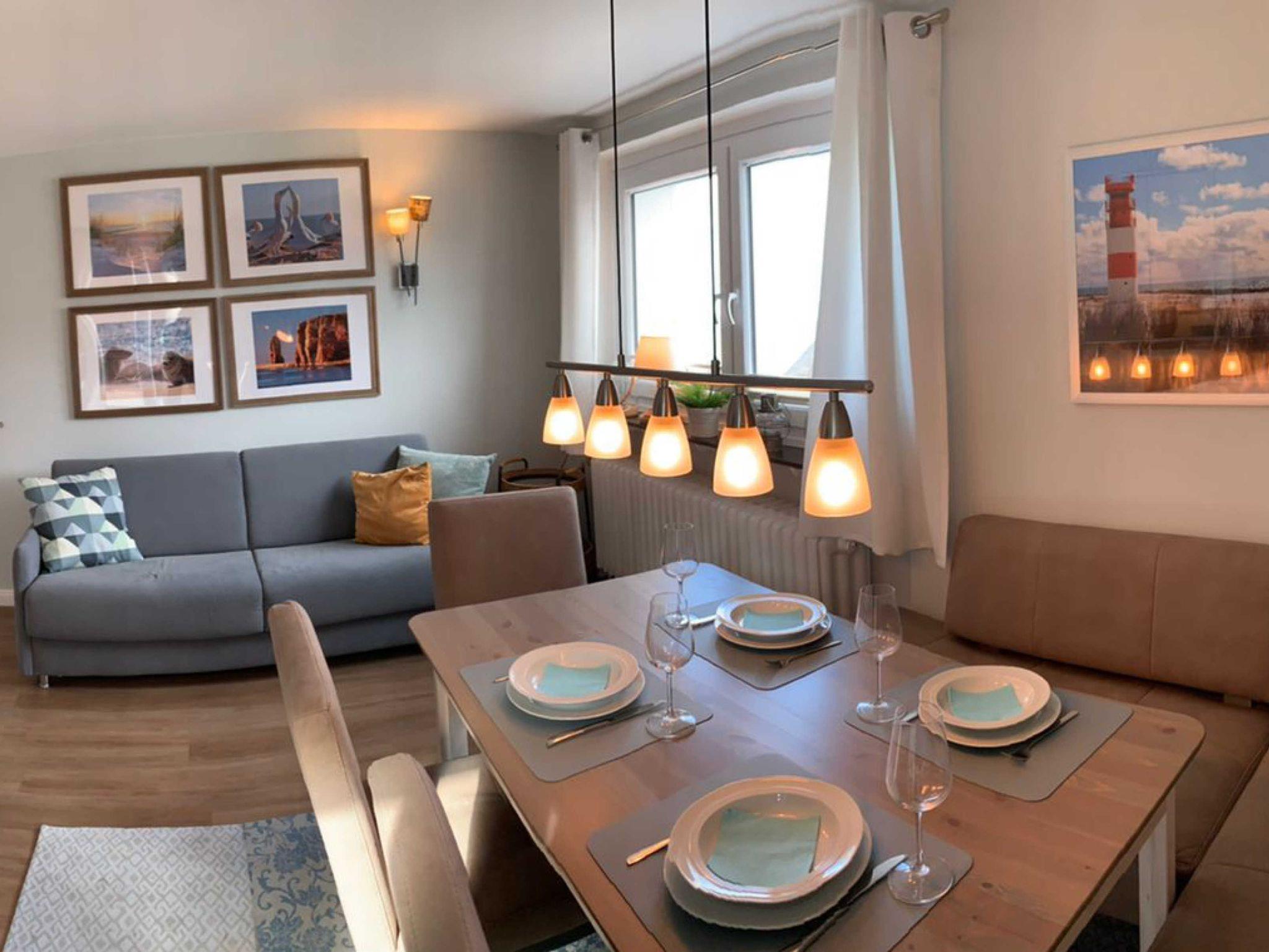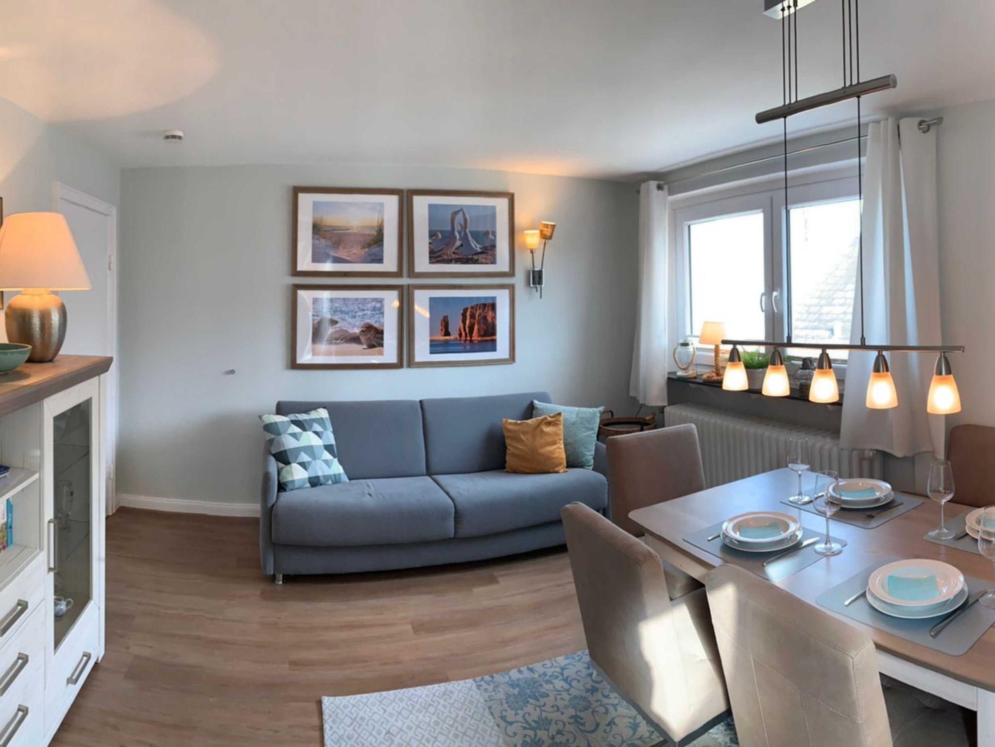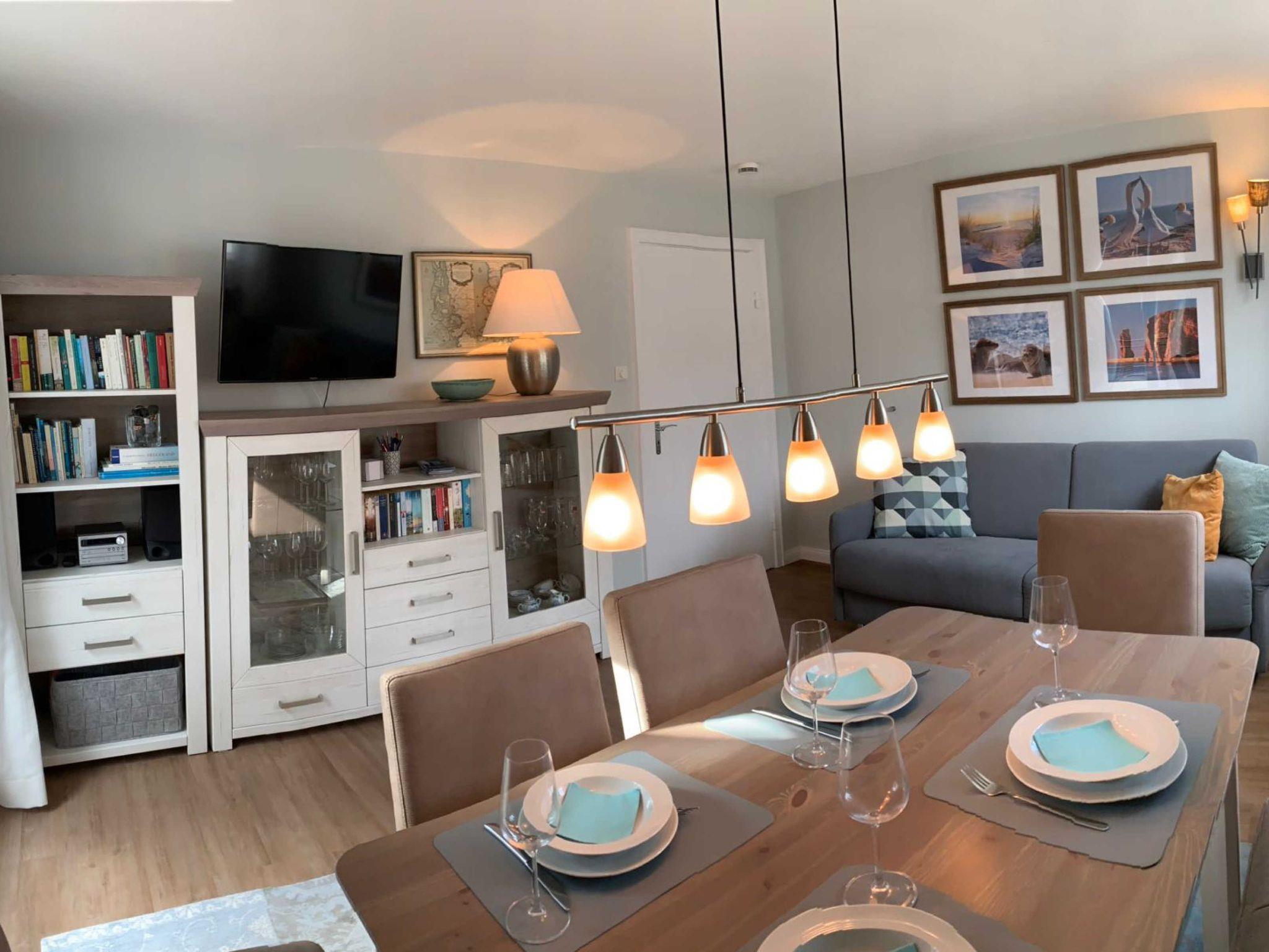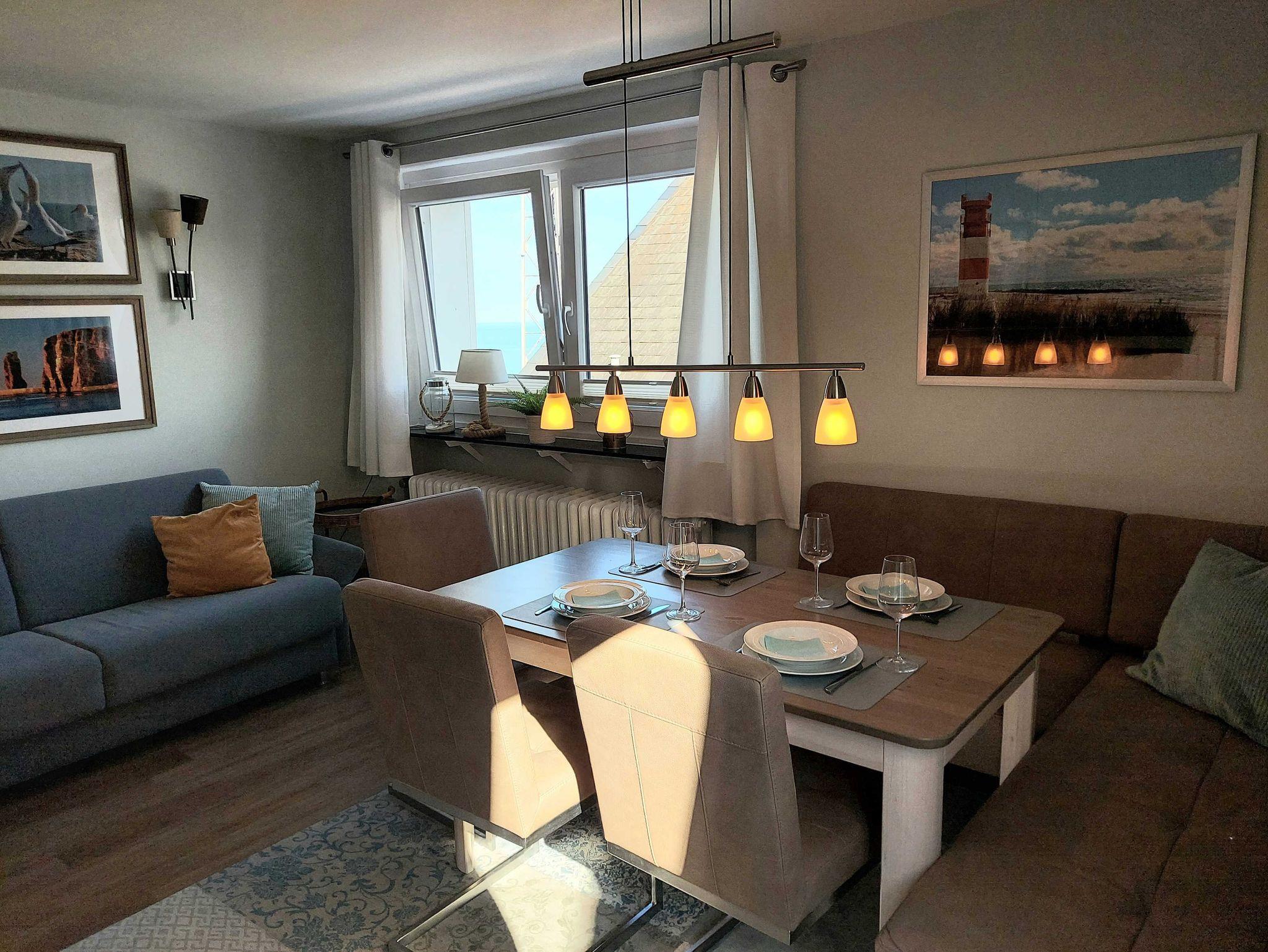 Die Wohnung im Obergeschoss hat 49 qm, zwei Zimmer, Küche und ein Bad mit Dusche/WC (neu in 2018). Das Schlafzimmer hat ein Doppelbett und einen kleinen Balkon mit seitlichem Seeblick. Ein zweiter Balkon befindet sich am Wohnzimmer. Dort gibt es auch eine Sitzecke mit Sofa, ein Essplatz, SAT-TV und ein Radio. Die komplett ausgestattete Küche hat einen Herd mit Backofen, Mikrowelle und Geschirrspüler.
