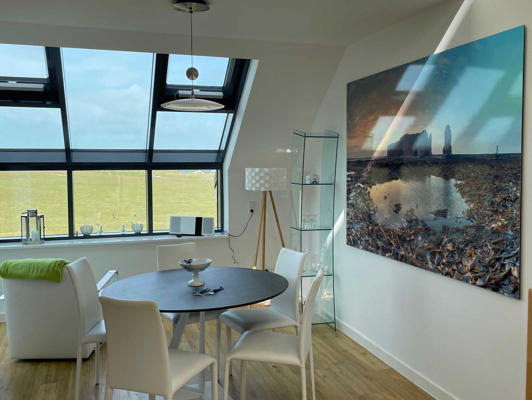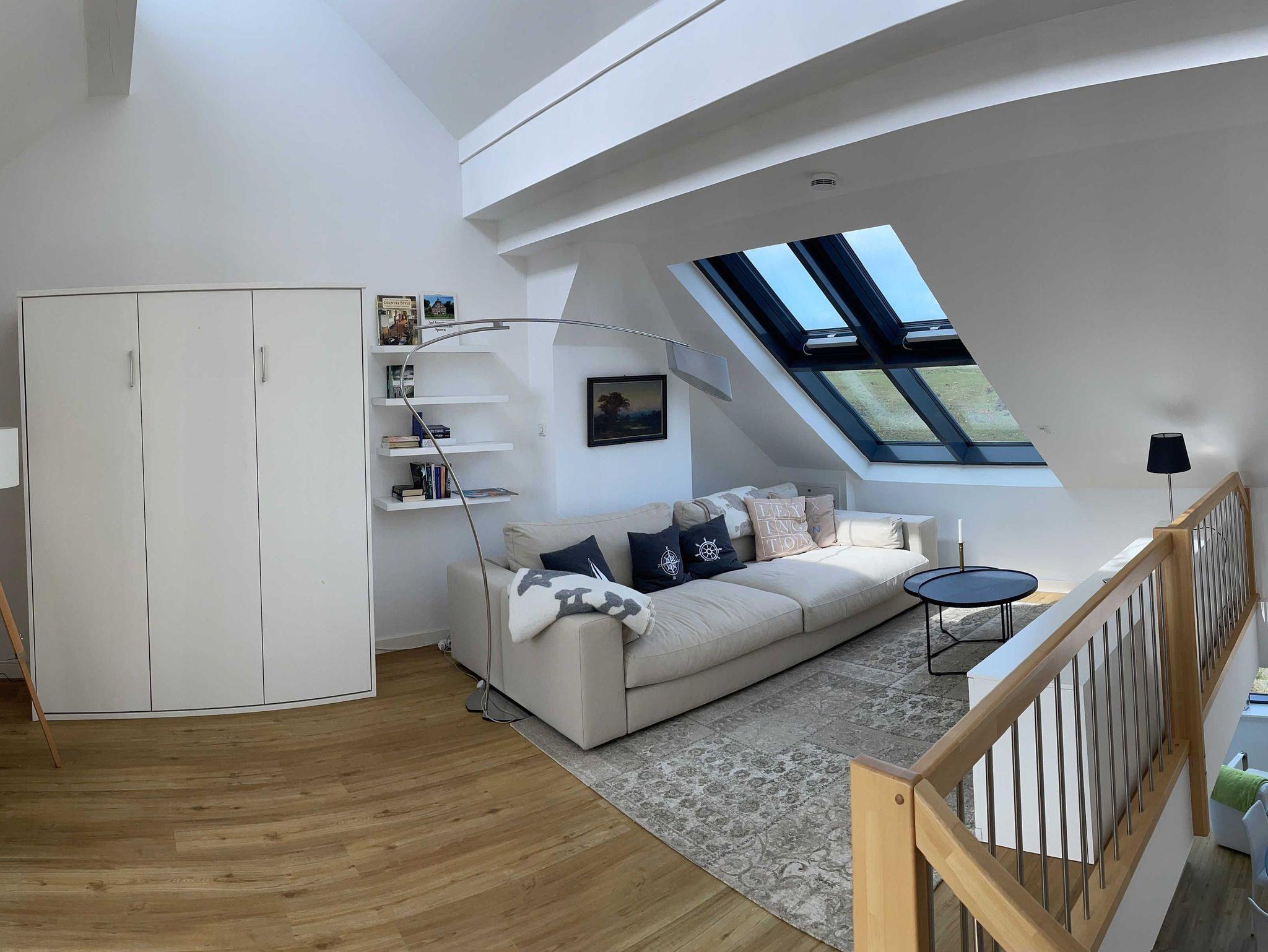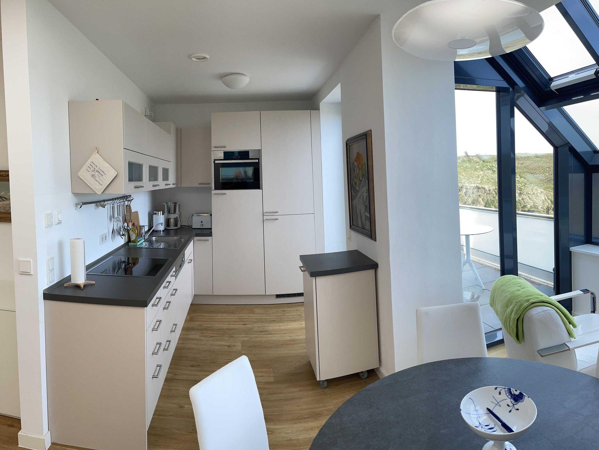 Die luxuriöse Wohnung hat ca. 70 qm Wohnfläche und verfügt in der unteren Etage über eine komplett ausgestattete Küche mit Geschirrspüler und Zugang zum Balkon, einen großzügigen Essbereich und Blick auf das Meer und ins Grüne. Bad mit Dusche und WC. Schlafzimmer mit einem komfortablen Doppelbett. Im Studio in der oberen Ebene befindet sich ein Wohn/Schlafbereich mit Blick auf die Nordsee durch das Panoramadachfenster und Zugang zur Dachterrasse mit Blick auf den Leuchtturm und die Düne. Als Schlafmöglichkeit ist im Studio ein sehr bequemes Doppelbett als ausklappbares Schrankbett vorhanden. Waschmaschine und Trockner befinden sich im Keller, nur nutzbar für Gäste dieser Wohnung. WLAN, TV und Radio/Dockingstation stehen zur Verfügung. Bettwäsche und Handtücher sind Inklusive und werden bei längeren Aufenthalten gewechselt.