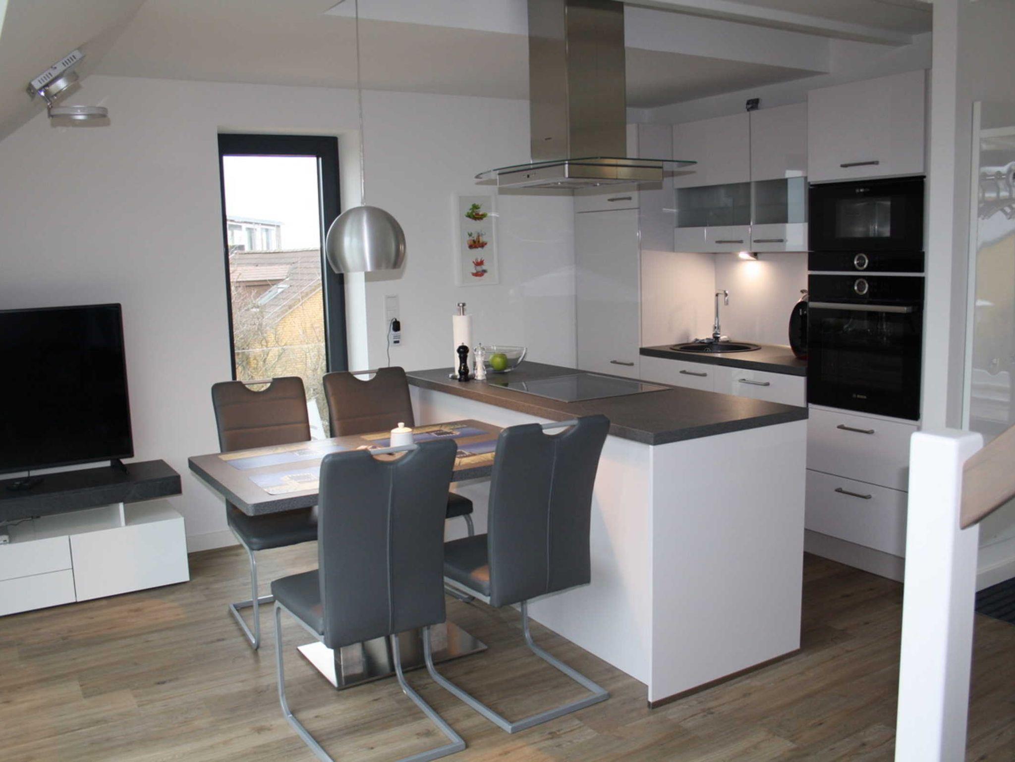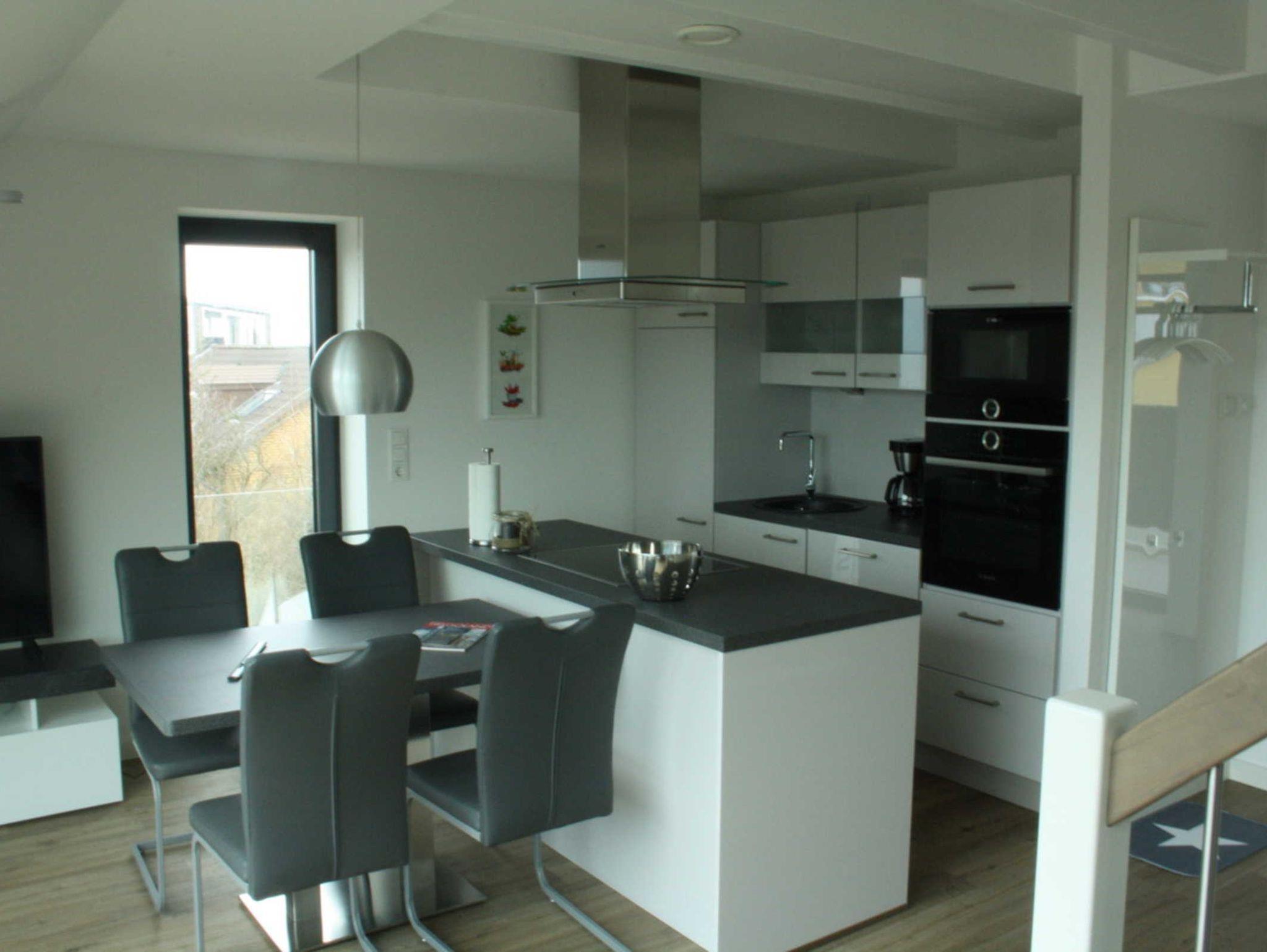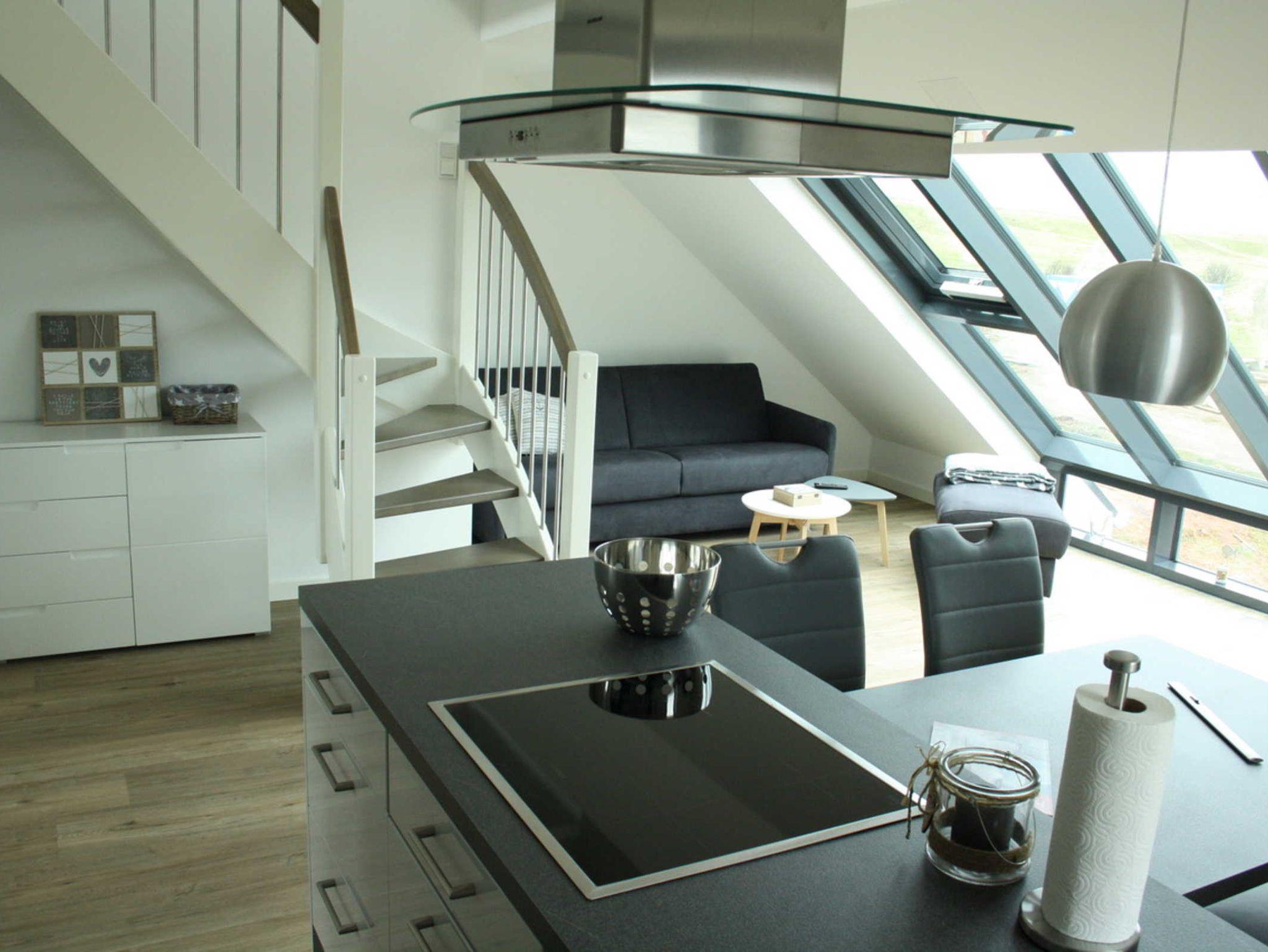 Sehr hochwertige Ausstattung. Schlafempore mit Blick auf die vorgelagerte Düne.