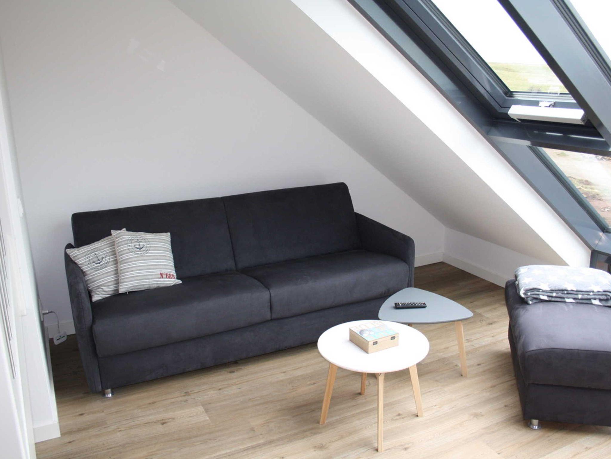 Schlafcouch mit hochwertigem Lattenrost. Großes Panoramafenster mit Blick auf die Nordsee und auf den grünen Teil der Insel.