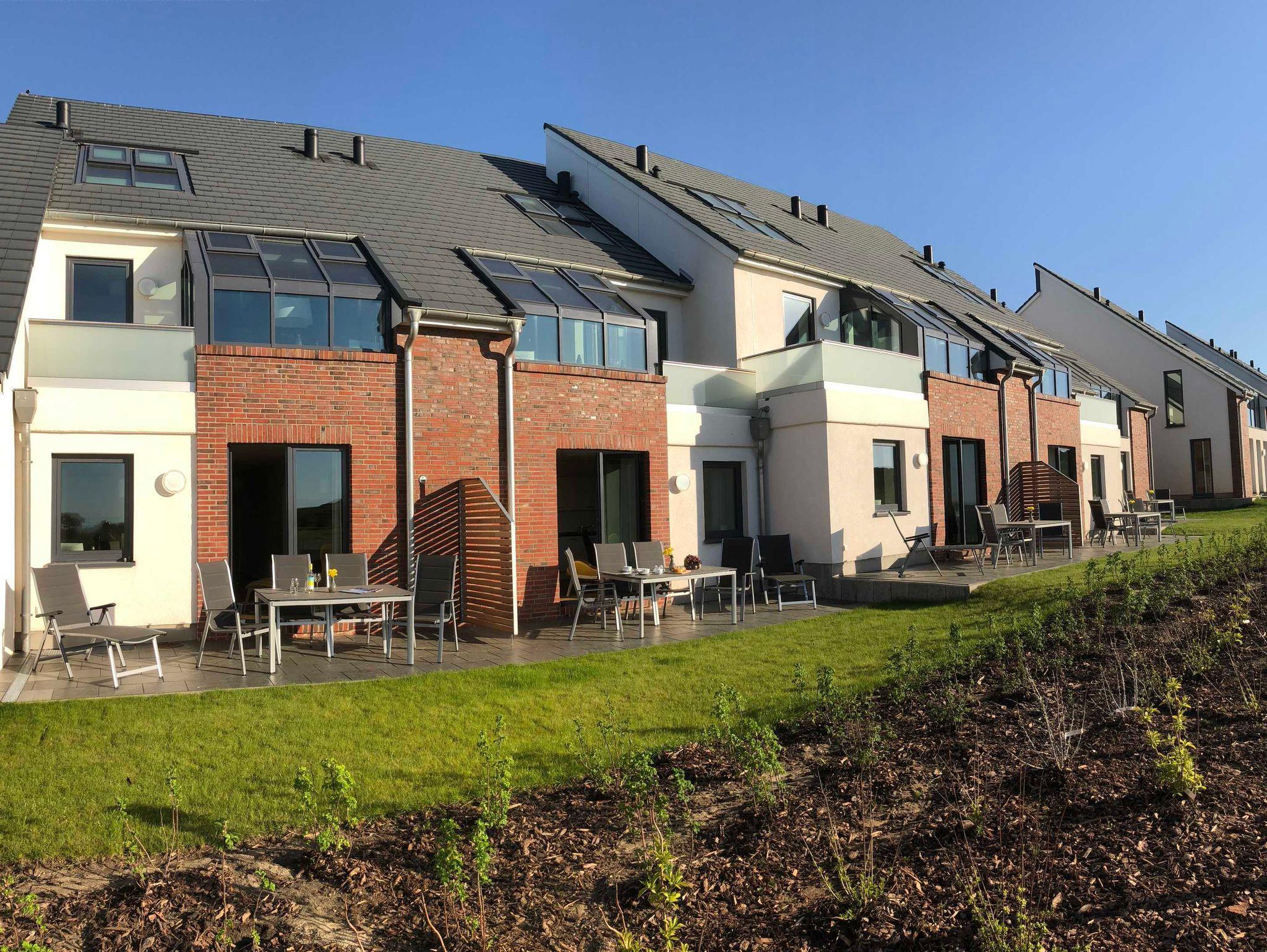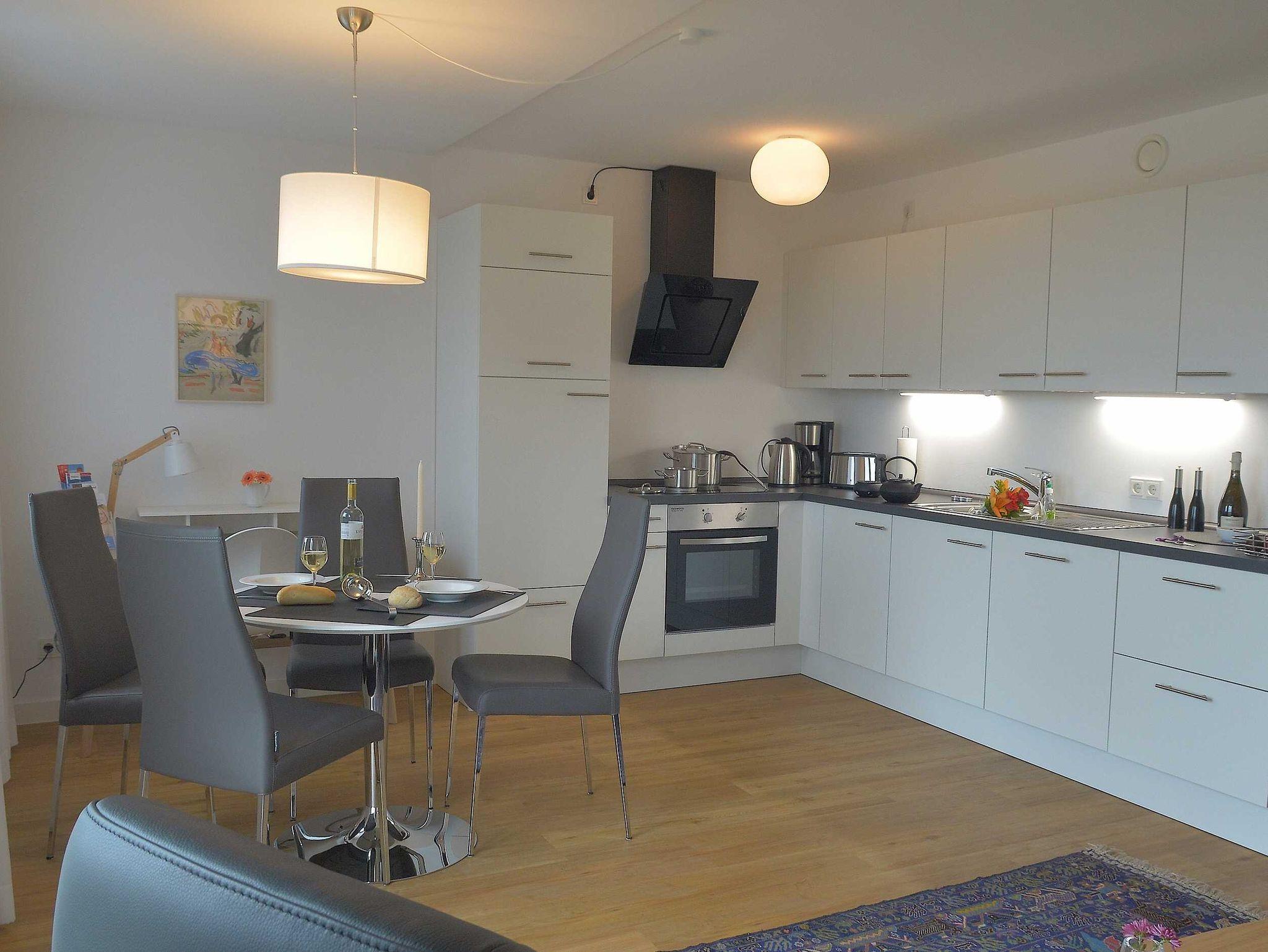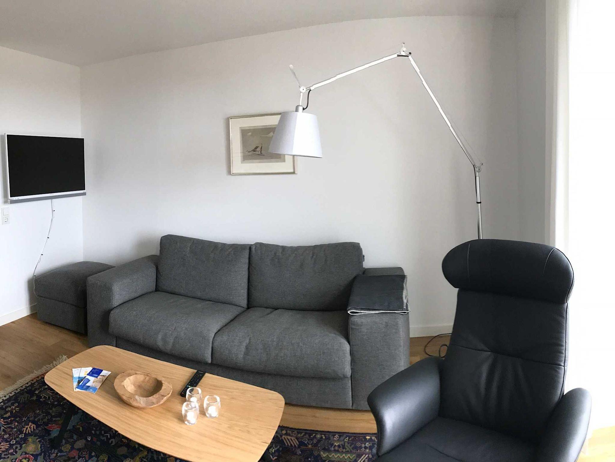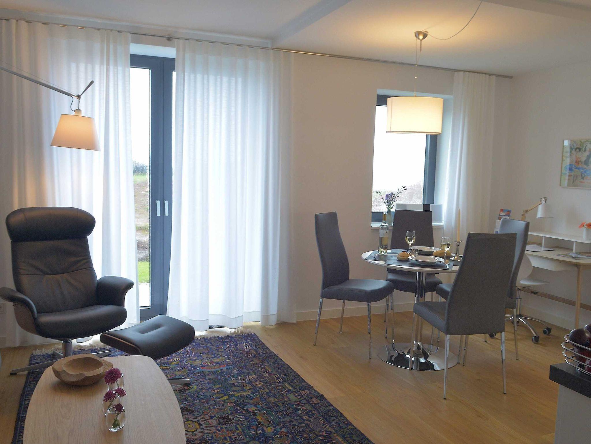 Die luxuriöse Wohnung hat ca. 55 qm Wohnfläche und befindet sich im Erdgeschoss. Der Wohnbereich mit offener, komplett ausgestatteter Küche und Essplatz hat einen Zugang zur Terrasse und einen unverbauten Blick auf die Nordsee und das grüne Oberland. Eine zweite Terrasse befindet sich auf der südlichen Sonnen-Seite der Wohnung.