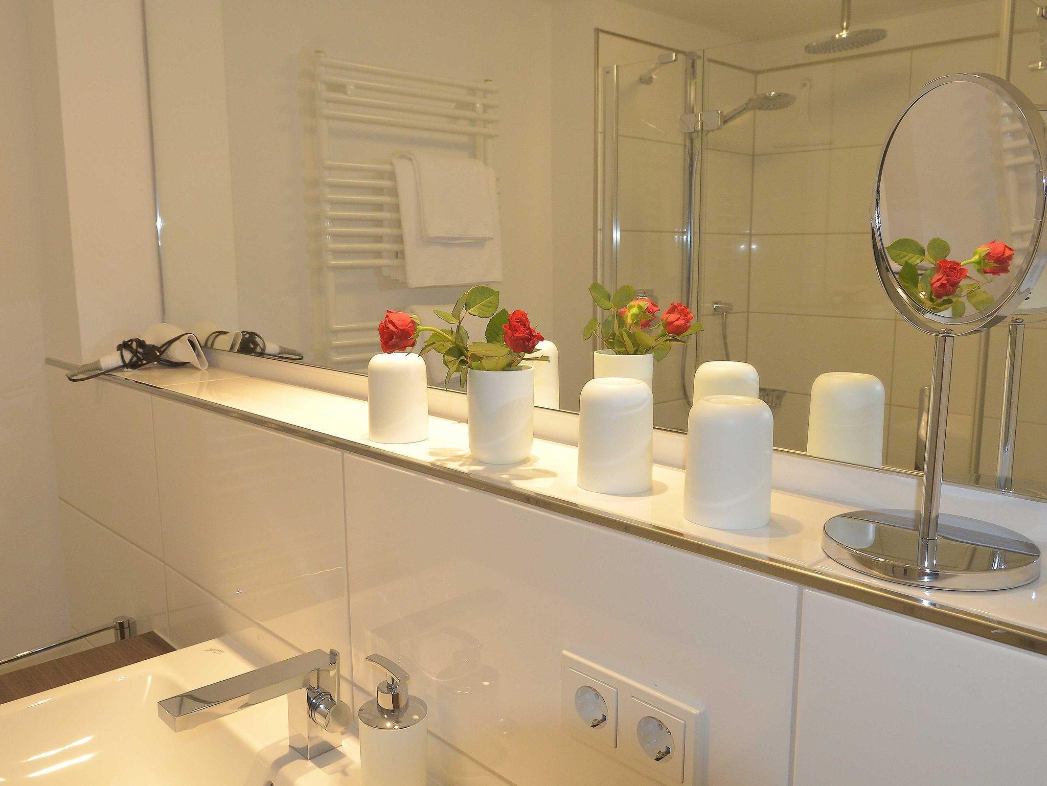 Schlafzimmer hat ein komfortables Doppelbett, Duschbad und WC sind separat.
