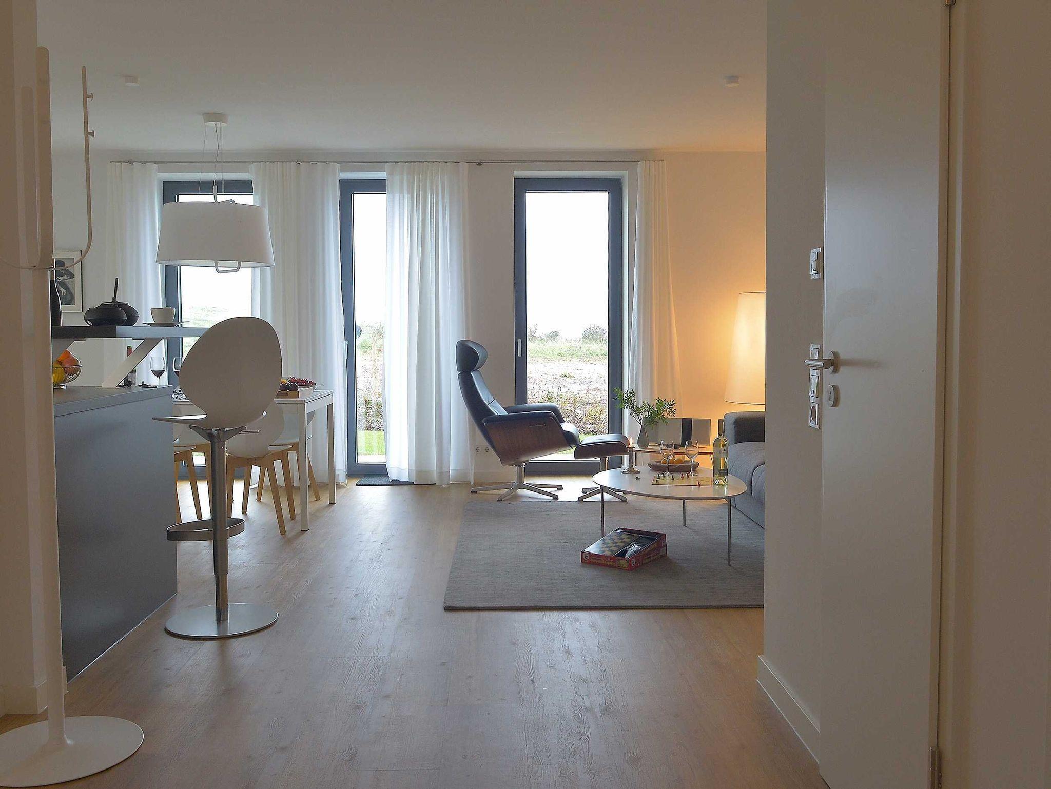 Die luxuriöse Wohnung hat ca. 59 qm Wohnfläche im Erdgeschoss. Der Wohnbereich über eine offene komplett ausgestattete Küche und Essplatz und Zugang zur Terrasse mit einem unverbauten Blick auf die Nordsee und das grüne Oberland. Duschbad und WC sind separat. WLAN, TV und Radio/Dockingstation sehen zur Verfügung. Bettwäsche und Handtücher sind inklusive und werden bei längeren Aufenthalten gewechselt.