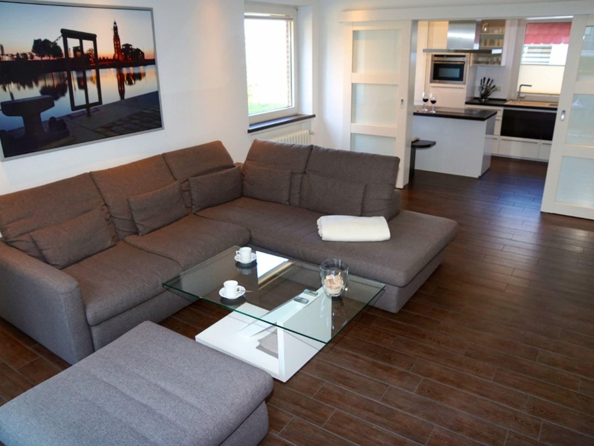 Das Wohnzimmer bietet durch Schiebe-Glastüren einen Zugang zur kleinen Sonnenterrasse.