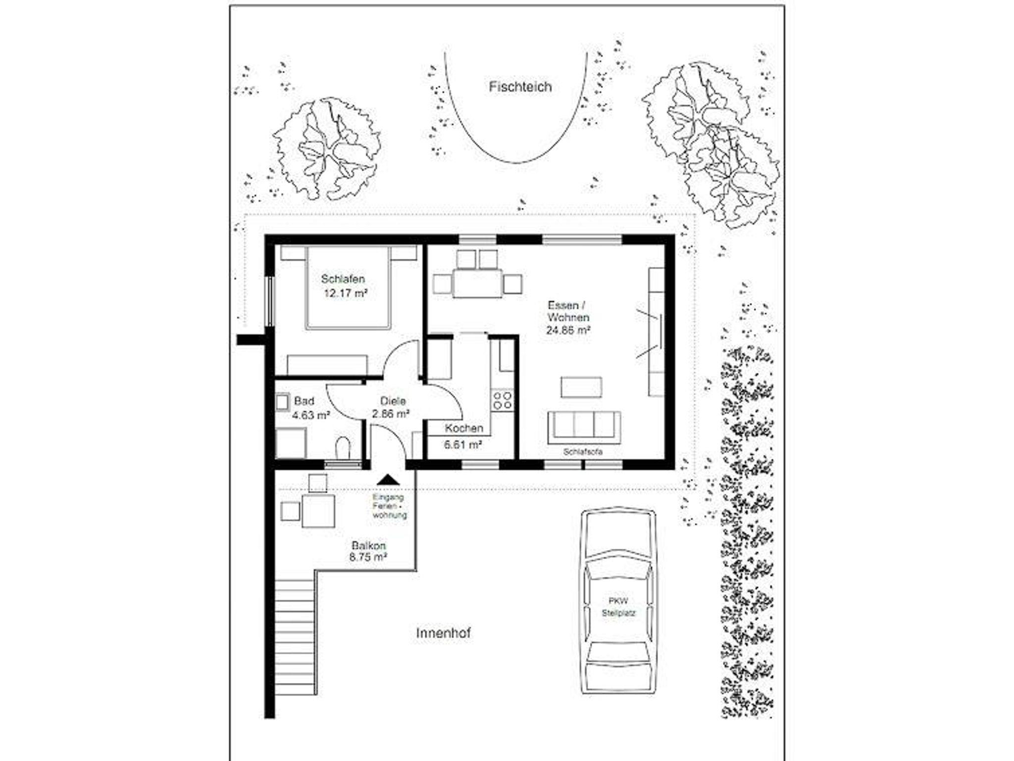 Ein Ruheplatz beim Gartenteich kann mitgenutzt werden.