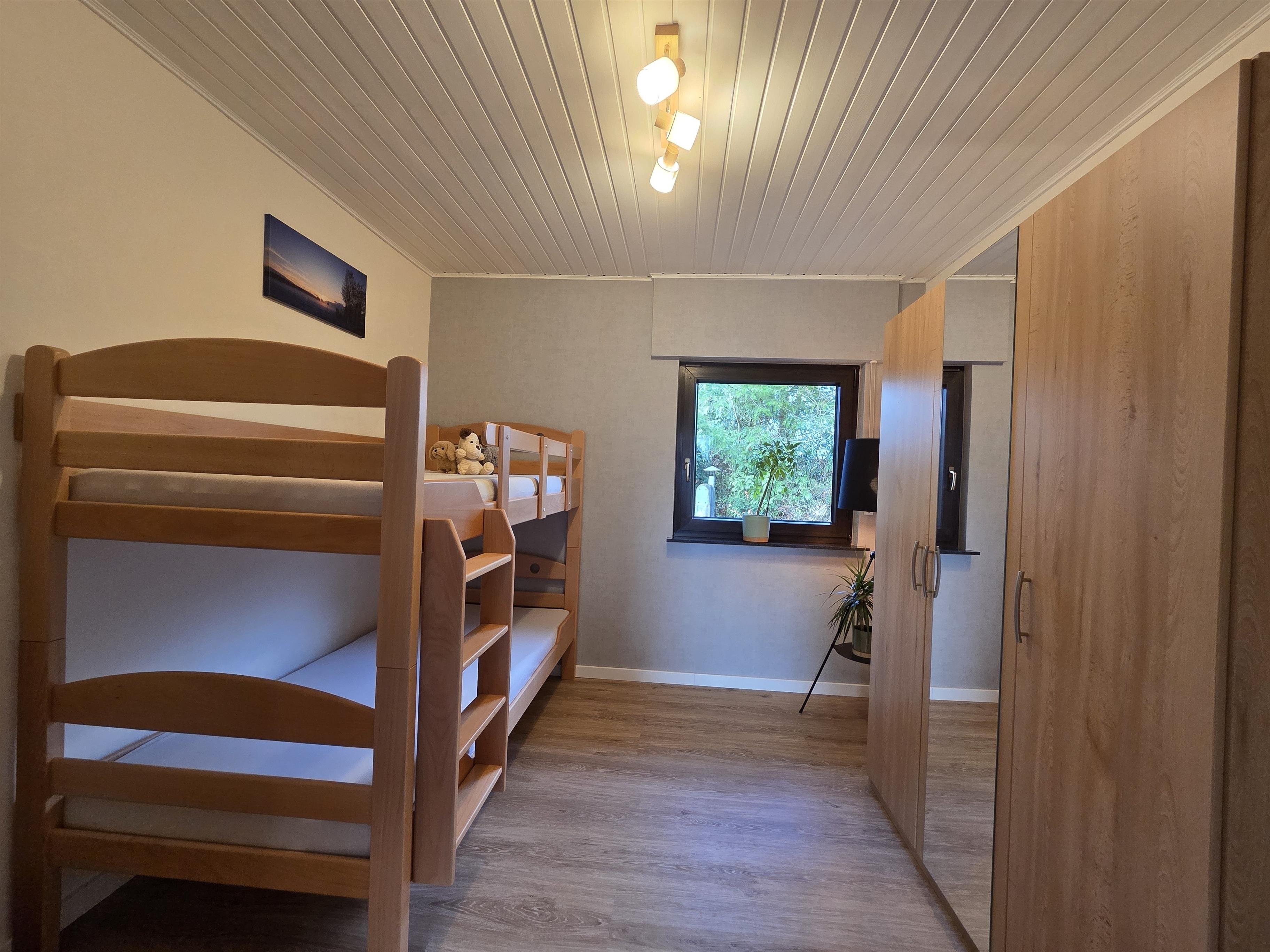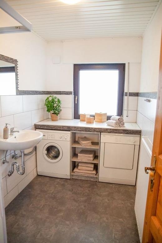 Im Erdgeschoss befinden sich sowohl ein großes Badezimmer mit begehbarer Dusche, einer Badewanne und einem WC als auch eine Waschküche mit Waschmaschine, Trockner, einer weiteren Dusche und einem seperat abgetrennten Gäste-WC. Das Schlafzimmer im Erdgeschoss verfügt über ein Etagenbett für zwei Personen (190 x 90 cm) sowie einen Kleiderschrank.