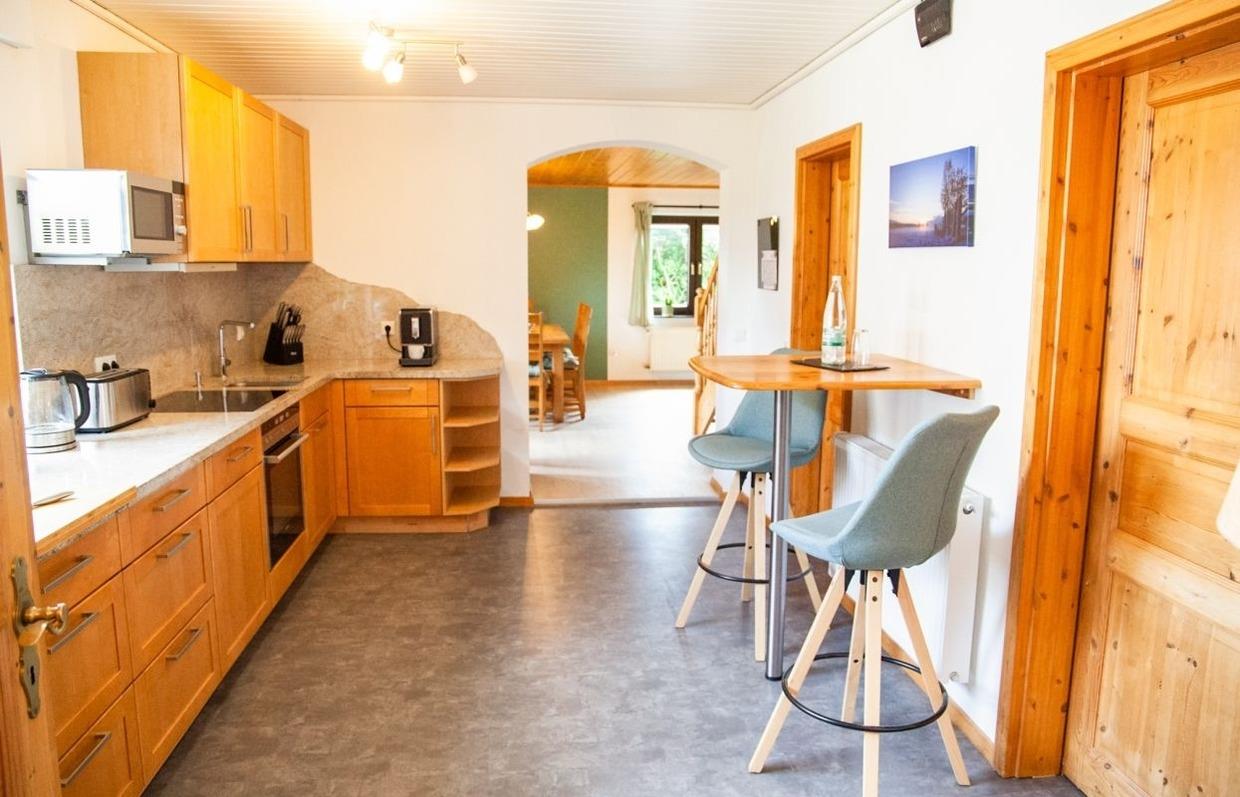 Die zum Wohnraum offene Küche ist komplett eingerichtet und verfügt über einen Backofen, ein Ceranfeld, einen Kühlschrank mit Gefrierfach, einer Mikrowelle, einem Toaster, einem Kaffeevollautomaten, einer Kaffeemaschine, einem Wasserkocher und einer Geschirrspülmaschine.