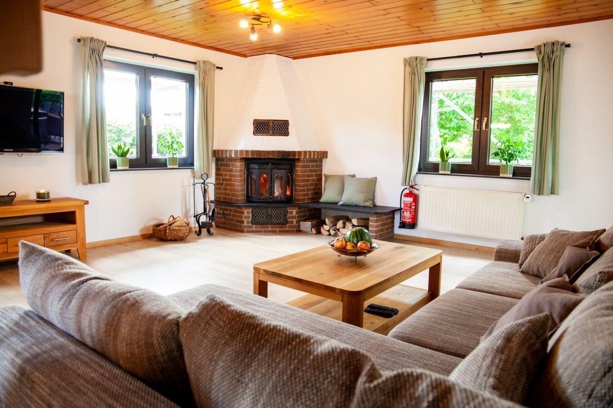 Im gemütlich eingerichteten Wohnraum laden eine bequeme Sitzecke, ein Esstisch für acht Personen, ein TV und ein Kaminofen zum Verweilen ein. Die Sitzlandschaft kann als Schlafgelegeheit für 1-2 Personen genutzt werden. Vom Wohnraum aus haben Sie direkten Zugang zu einer überdachten und möblierten Terrasse mit großem Garten. Der Grill im Garten darf jederzeit genutzt werden.