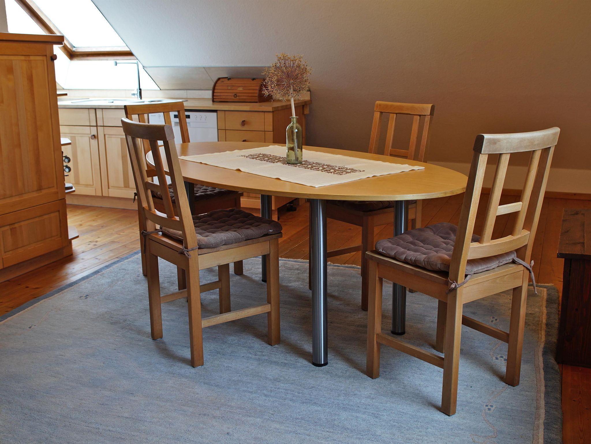 Zum Appartement gehört eine Sitzecke sowie eine gemütlicher Essbereich mit einer Kochecke (Spüle, Herd, Backofen sowie Kühl-/Gefrierschrank).