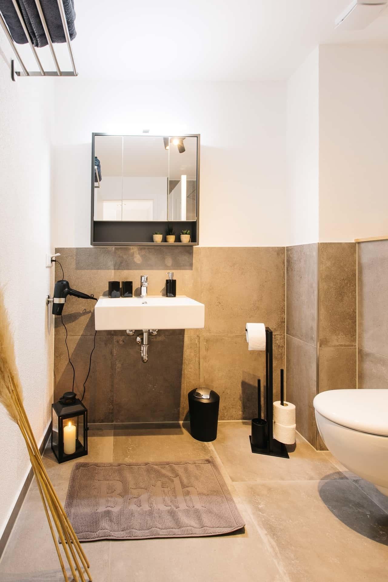 Bad: große, bodentiefe Dusche (120x90), Handtücher, Toilettenpapier