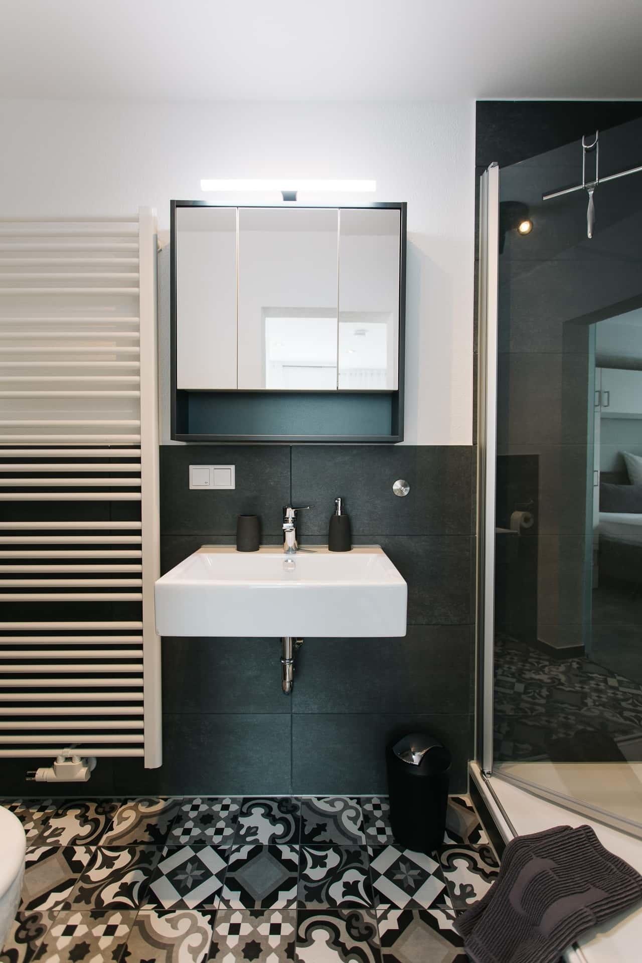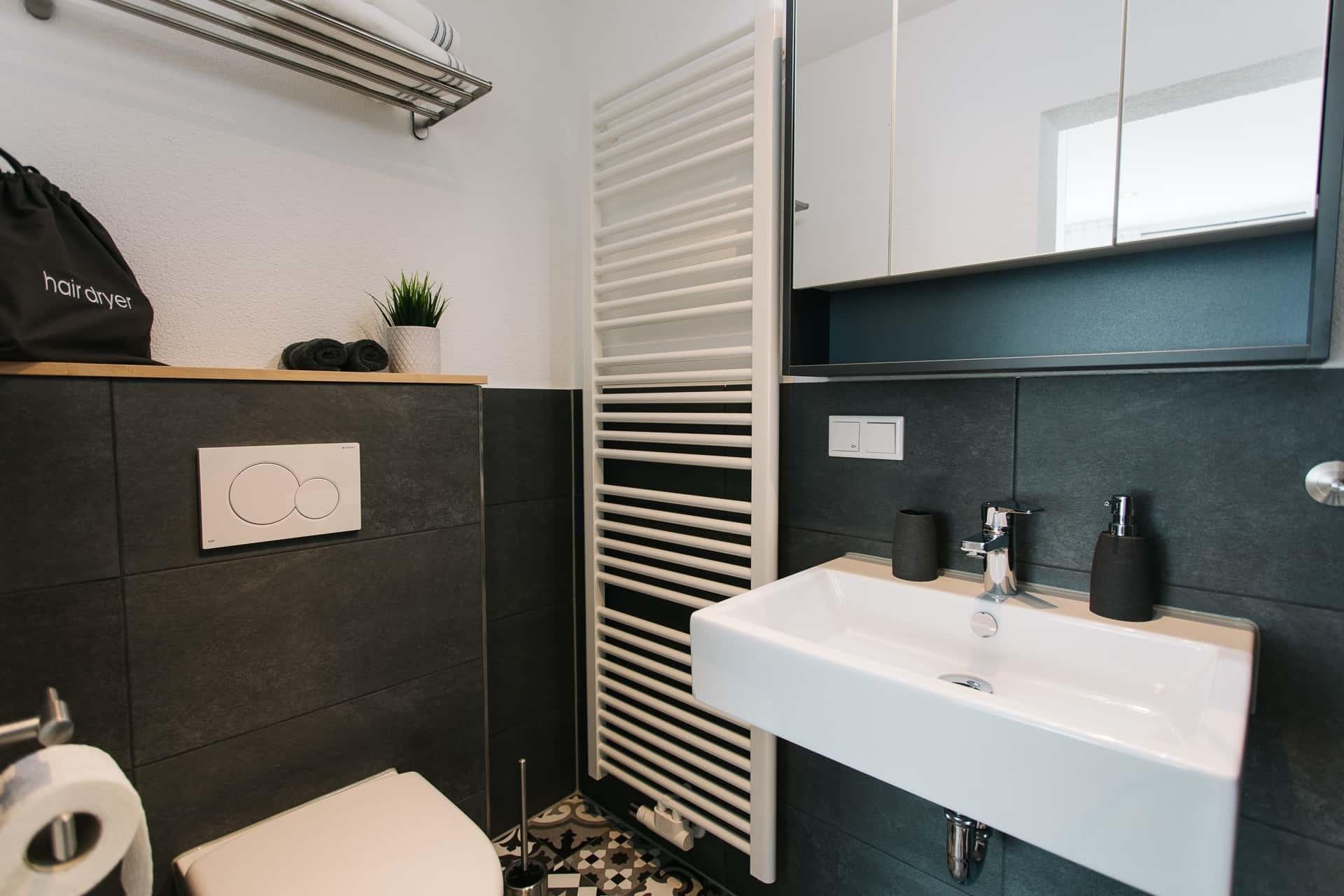 Bad: große, bodentiefe Dusche (120x80), Haartrockner, Handtücher, Toilettenpapier