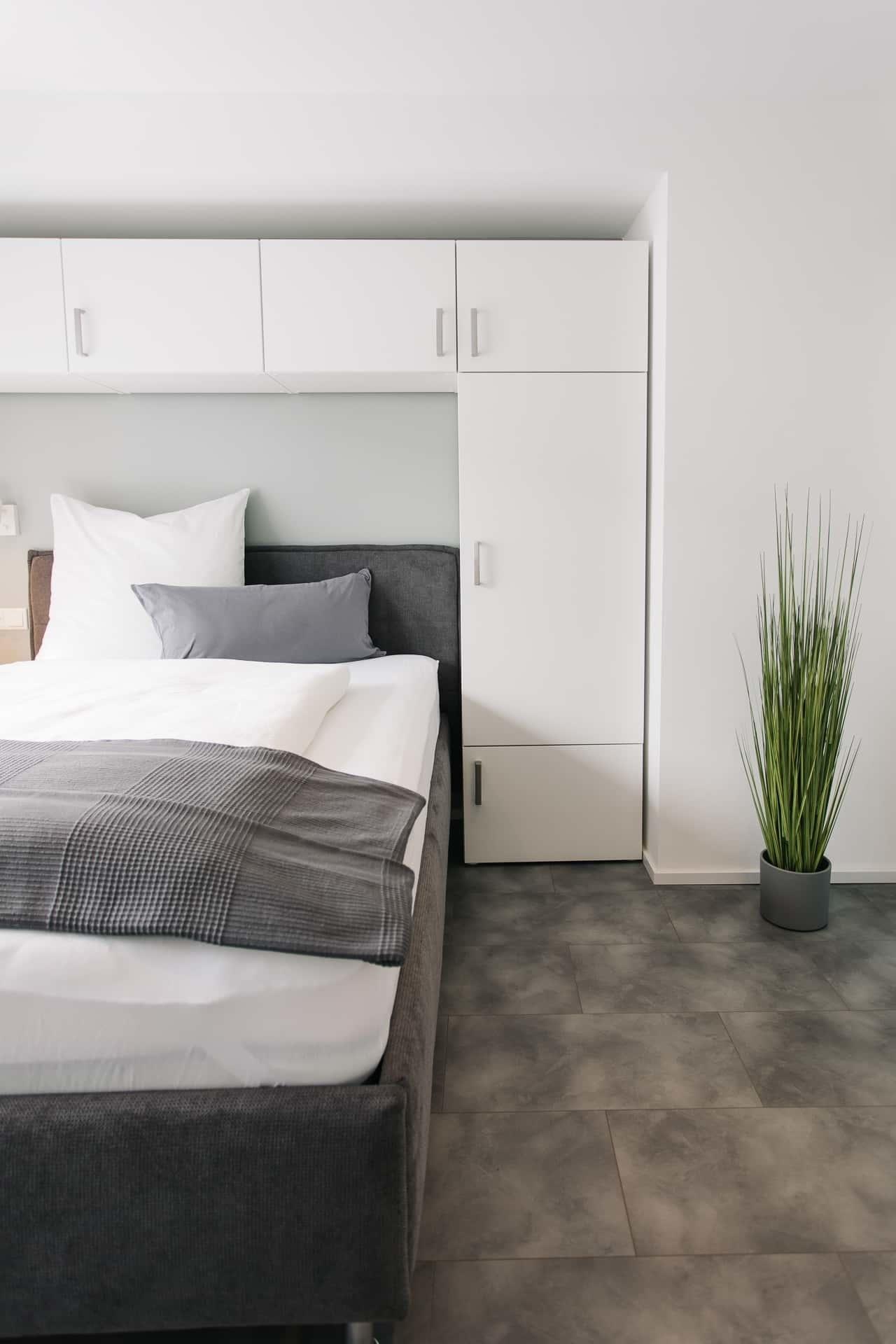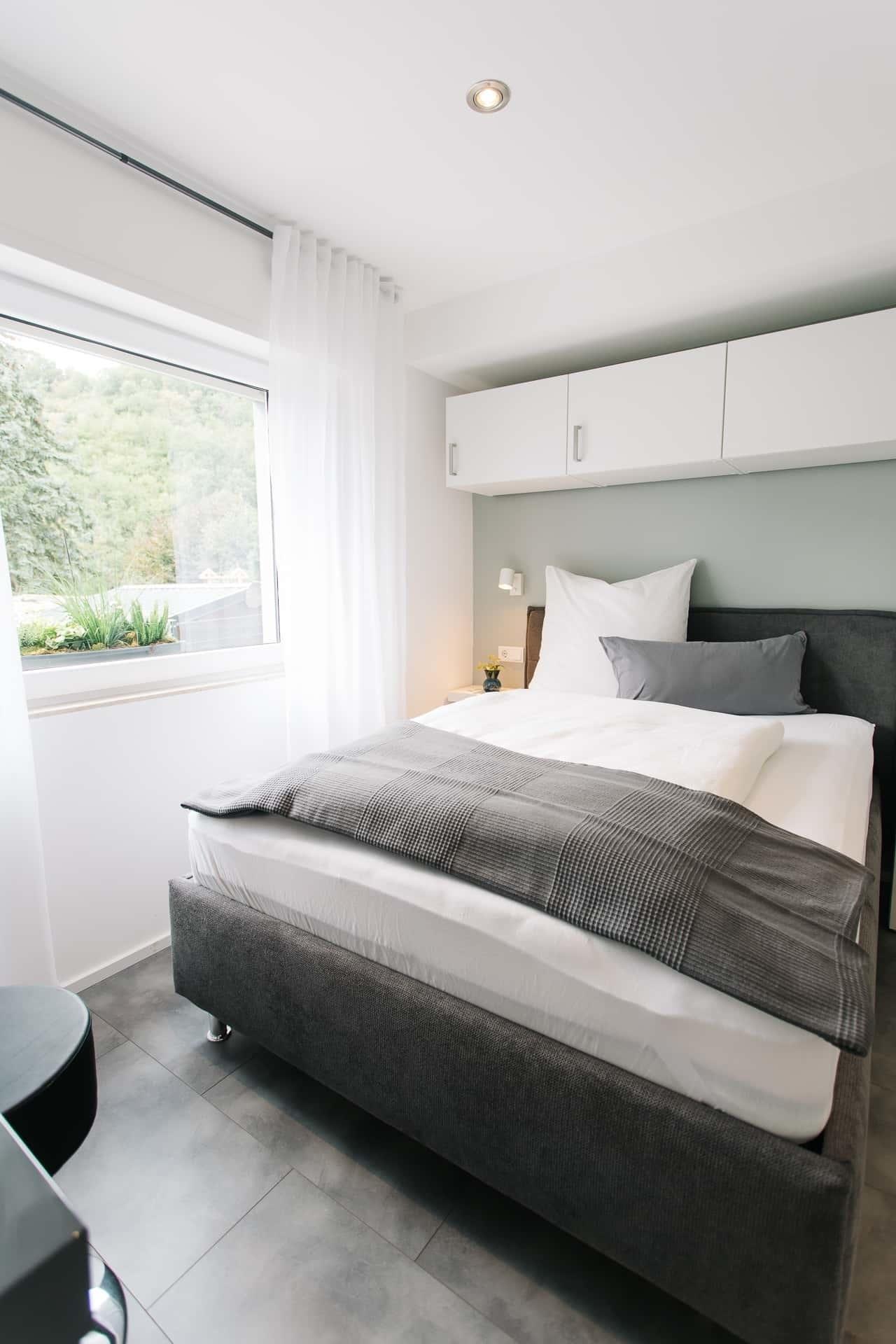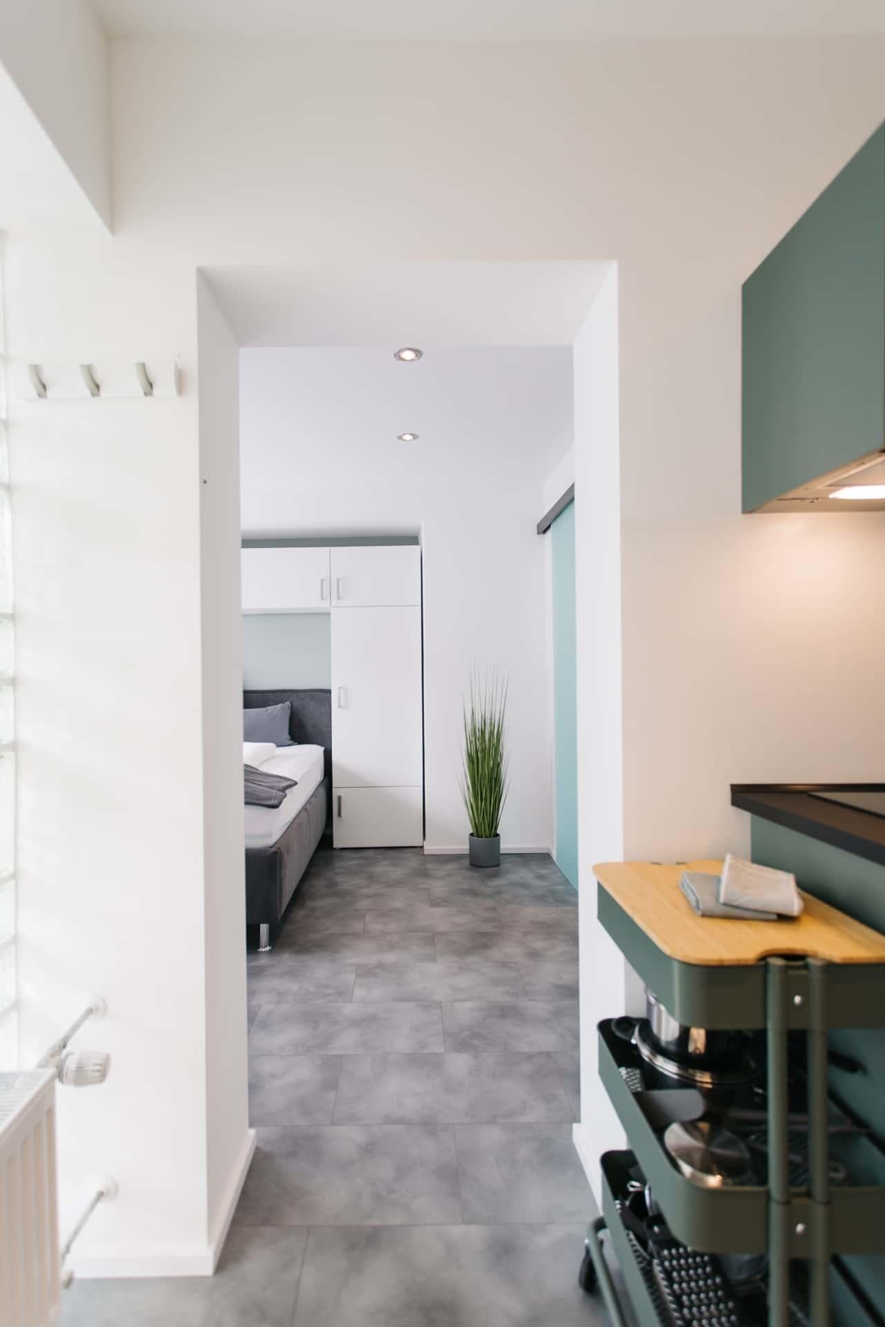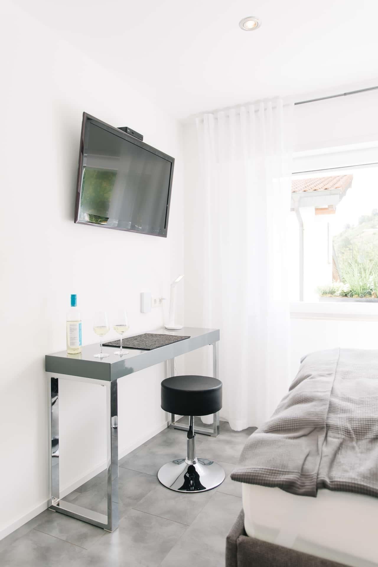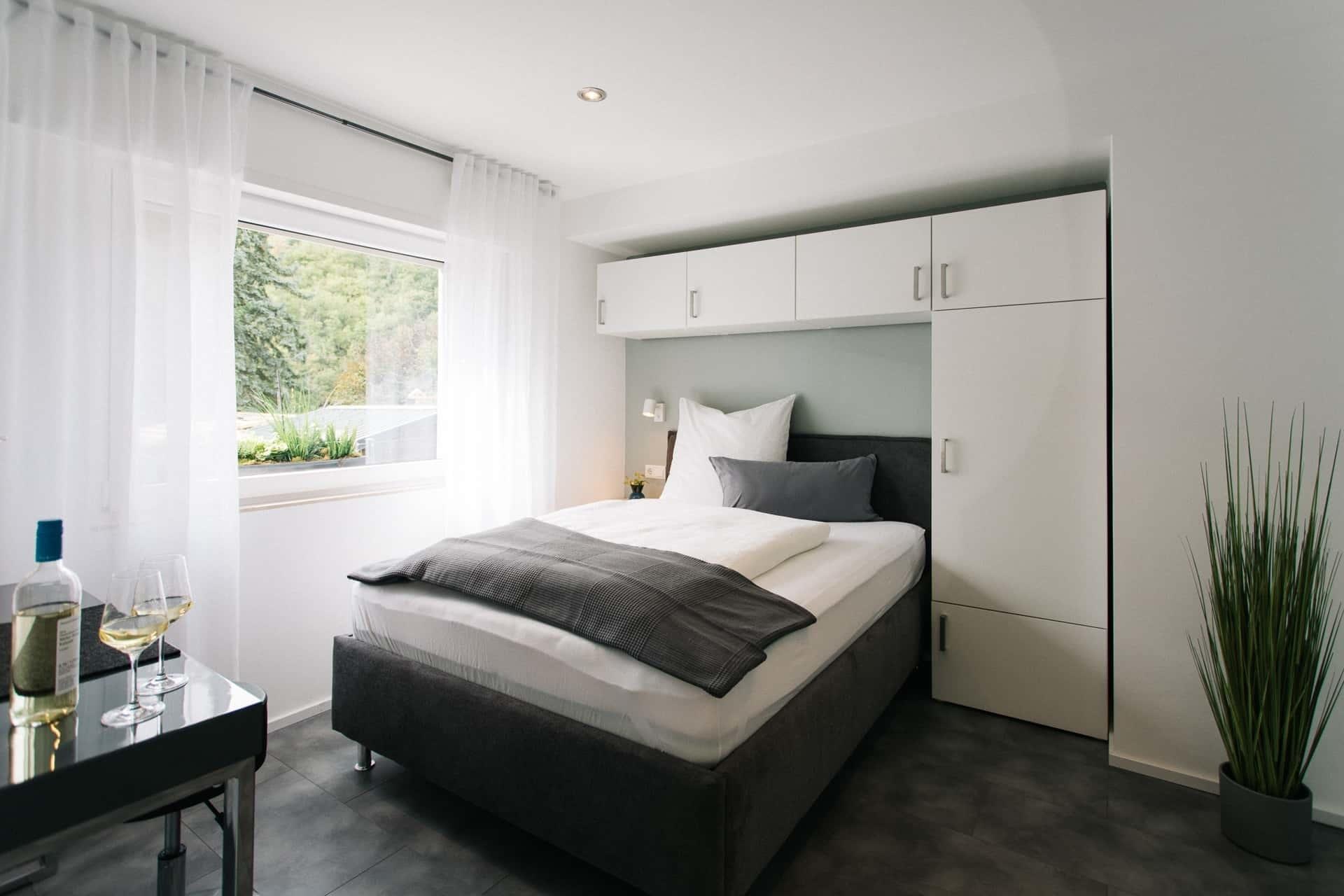 Wohn-/Schlafzimmer: Queensize-Bett für 1 - 2 Erwachsene (140x200), großer Kleiderschrank mit reichlich Platz, 38’’-Smart-TV (mit Google-Chrome-Cast zum Streamen), Schreibtisch