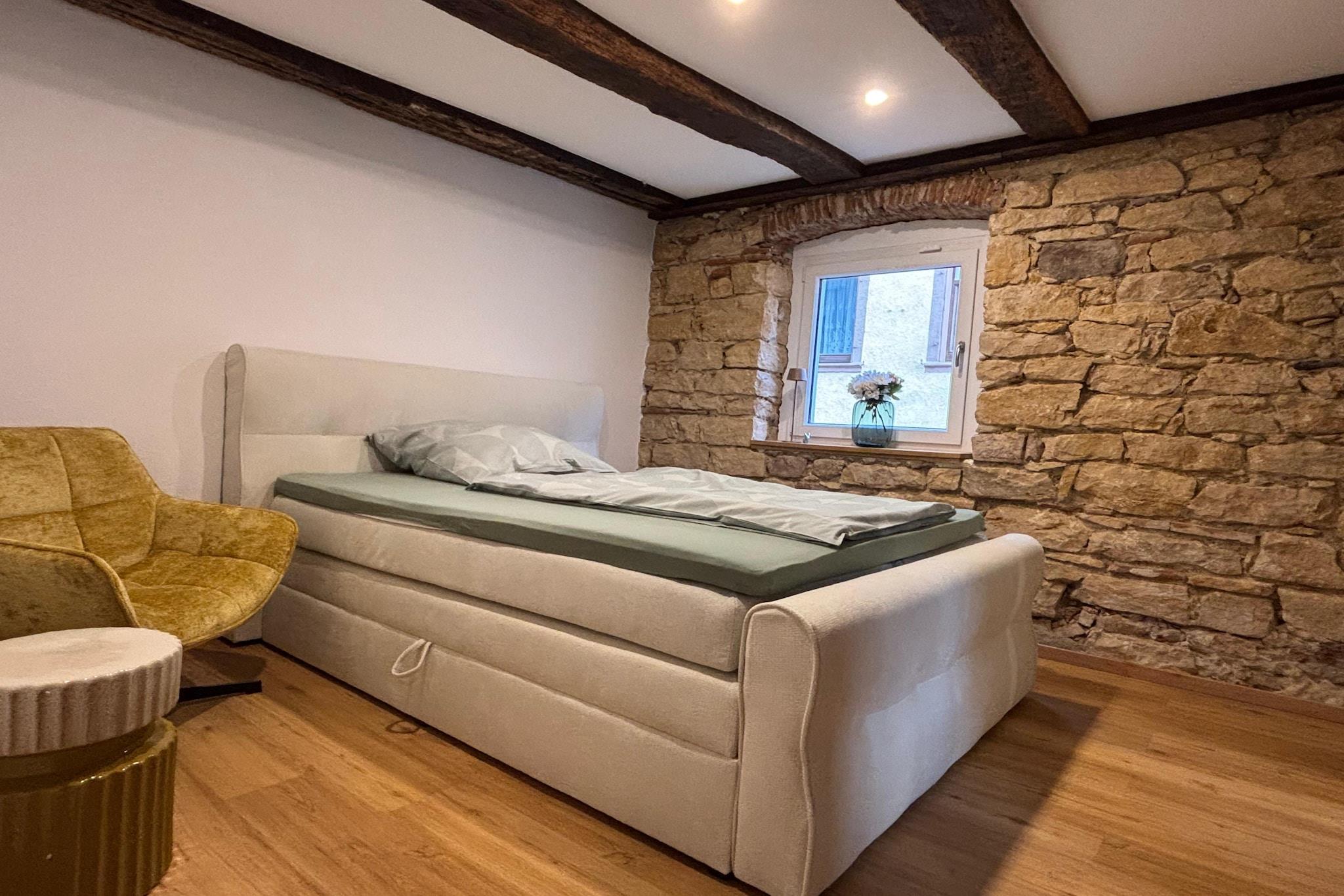 Beliggende i hjertet af Herbolzheim, er denne rummelige ferielejlighed ideel til store grupper eller flere familier med børn. Beliggende i den fortryllende Breisgau-region i det sydvestlige Tyskland, tilbyder det nem adgang til slotte, paladser, charmerende landsbyer og bindingsværksbyer. Europa-Park Rust ligger blot et par kilometer væk, og den pulserende universitetsby Freiburg ligger kun 30 minutters kørsel derfra. Lejlighedens midtpunkt er et generøst spisekøkken med et stort spisebord - perfekt til fælles måltider og livlig samtale. Den hyggelige stue har et bordfodboldbord og et lunt sofahjørne gemt under traditionelle bindingsværksbjælker, hvilket skaber en varm og indbydende atmosfære. Uanset om du udforsker kulturelle vartegn eller nyder kvalitetstid indendørs, tilbyder dette centralt beliggende oase komfort, bekvemmelighed og et strejf af Schwarzwald-charme.