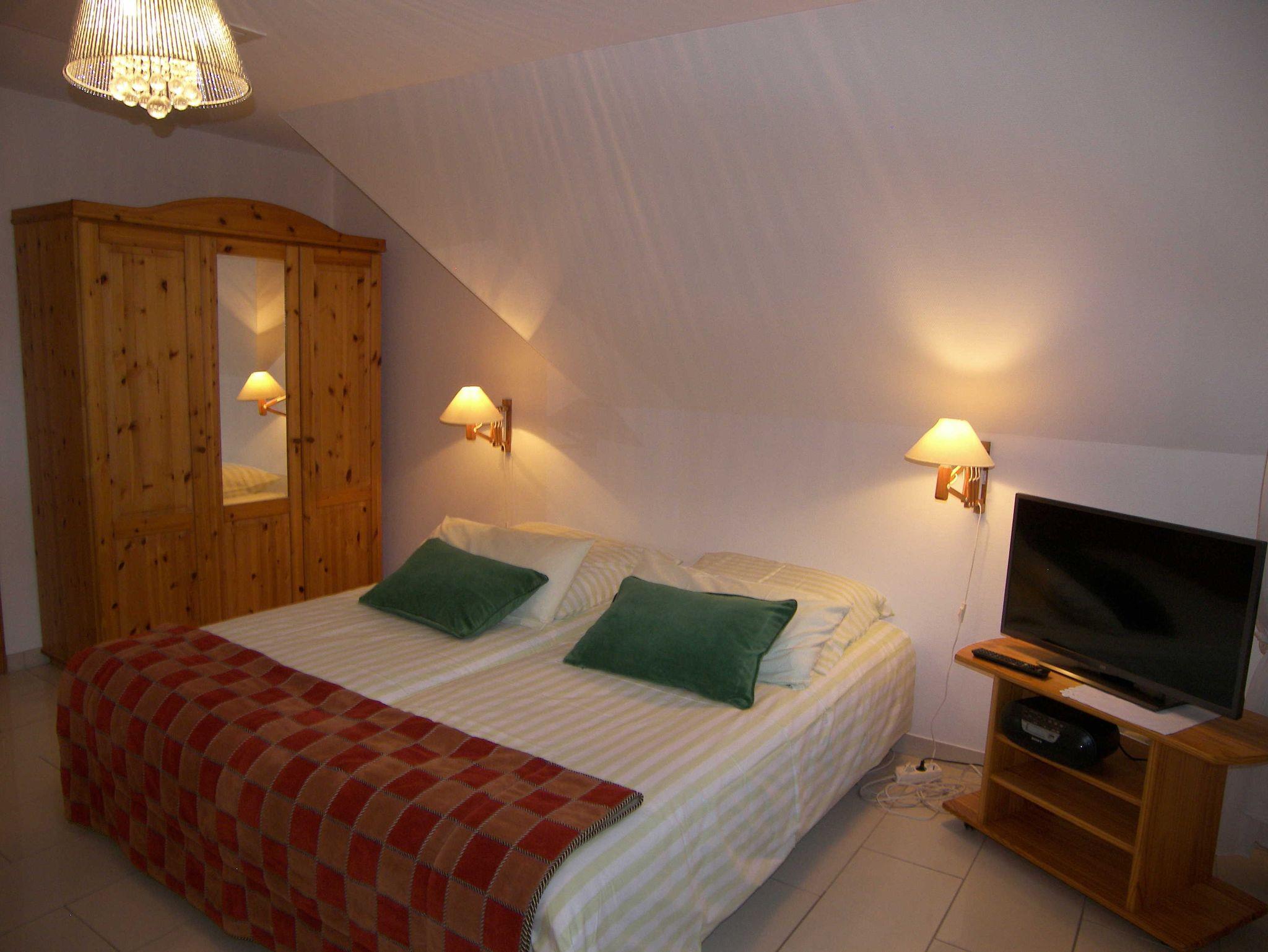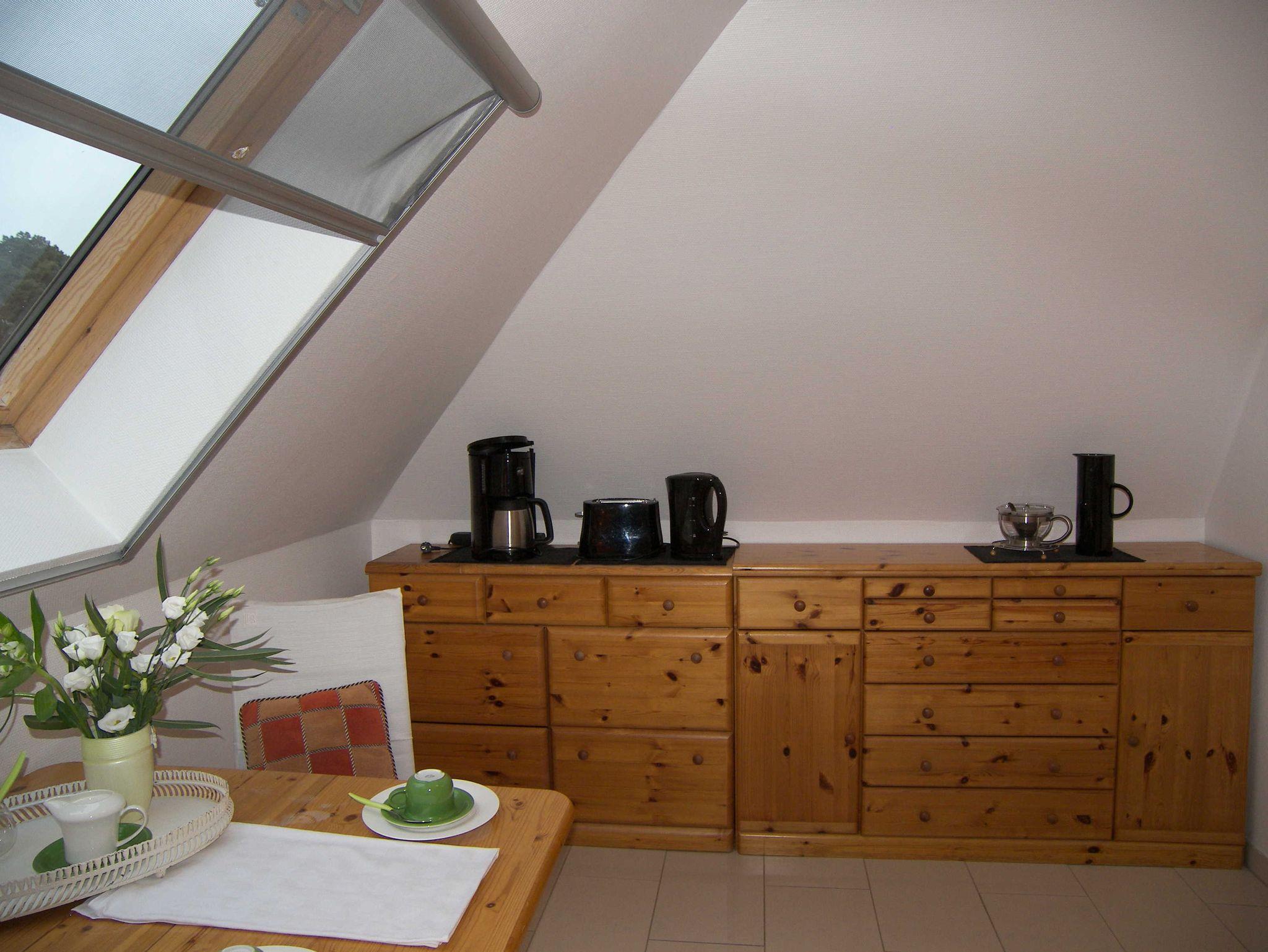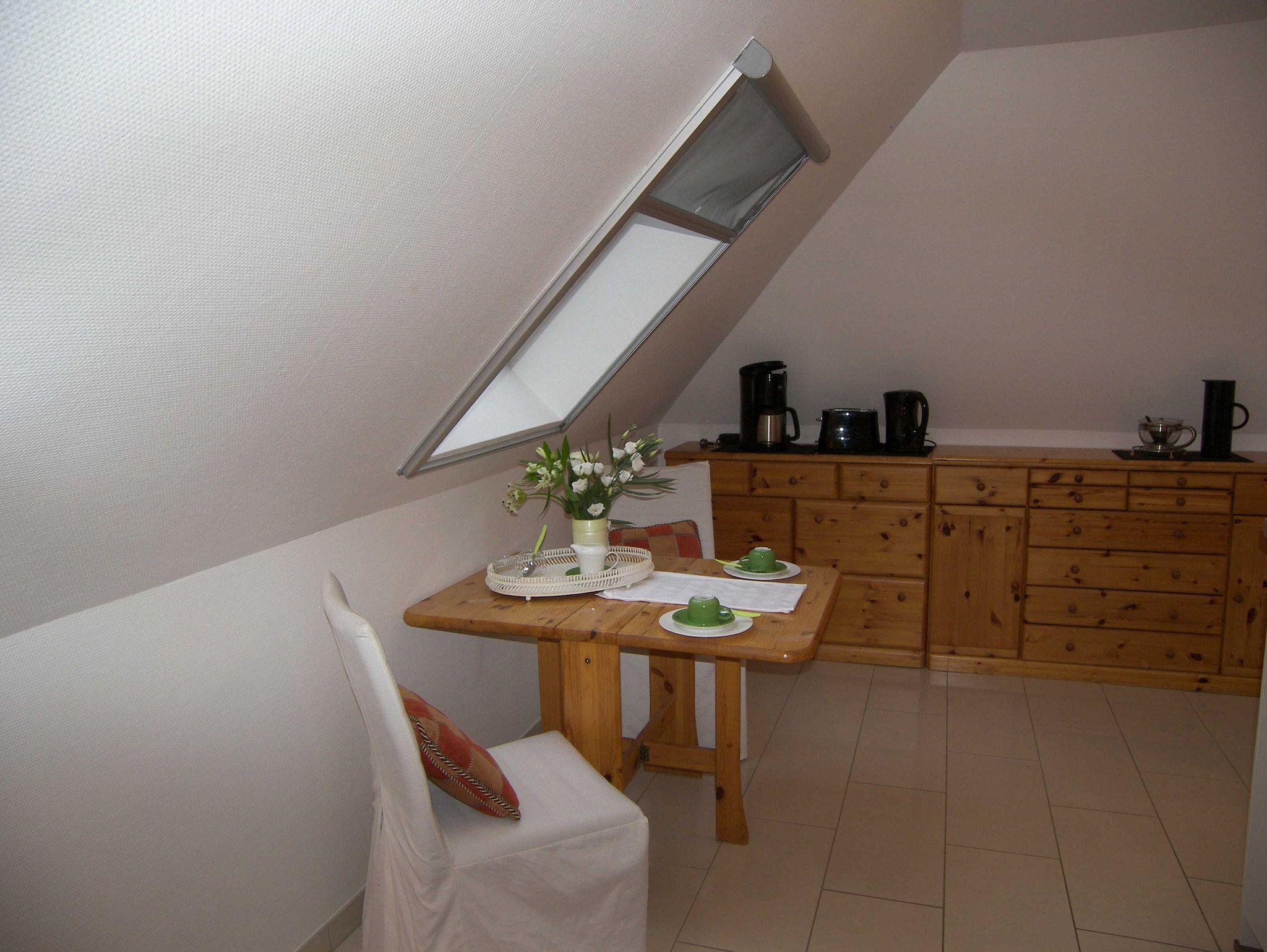 Die gemütliche 1-Raum-Ferienwohnung befindet sich im 1.OG und verfügt über einen kombinierten Wohn-/Schlafbereich mit Doppelbett, Kleiderschrank, Sitzmöglichkeit, Flachbild-TV, Radio und W-LAN. Die offene, kleine Pantry-Küche ist mit einer 2-Kochfeld-Ceranplatte, Wasserkocher, Kaffeemaschine, Toaster, Kühlschrank, Spüle & einem kleinen Esstisch ausgestattet. Küchenrolle und ein Geschirrhandtuch werden bereitgestellt. Das Bad verfügt über Dusche/WC, Handtuchheizung und einen Haartrockner. Die Bettwäsche ist bereits inklusive. Eine Sitzecke im Garten sowie eine Terrasse zur Gemeinschaftsnutzung stehen zur Verfügung.