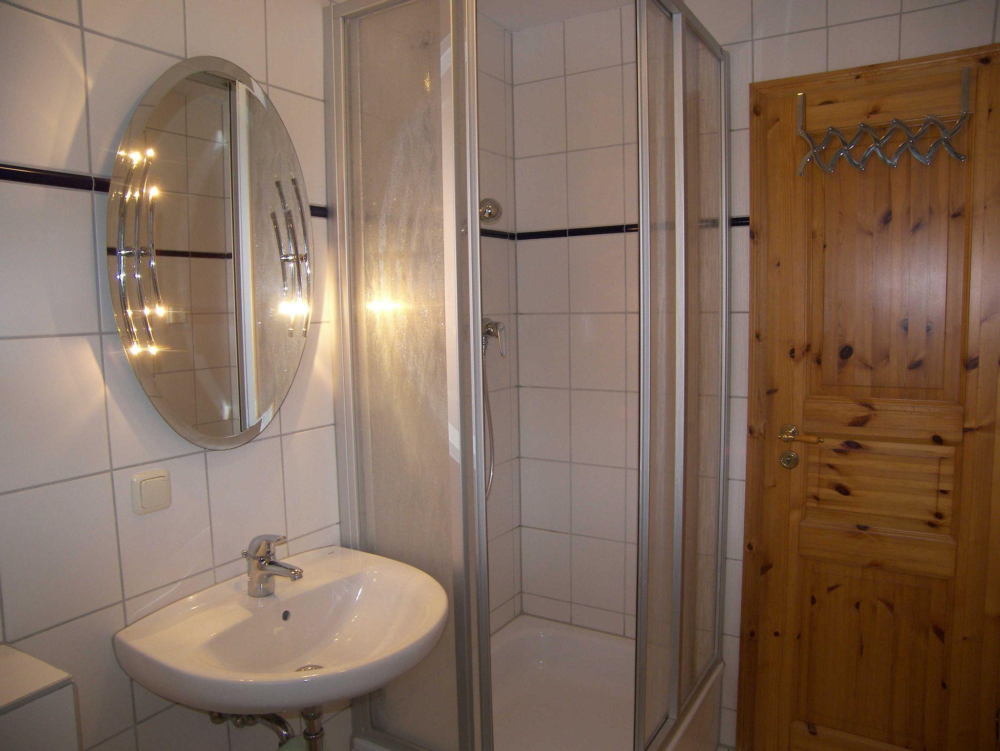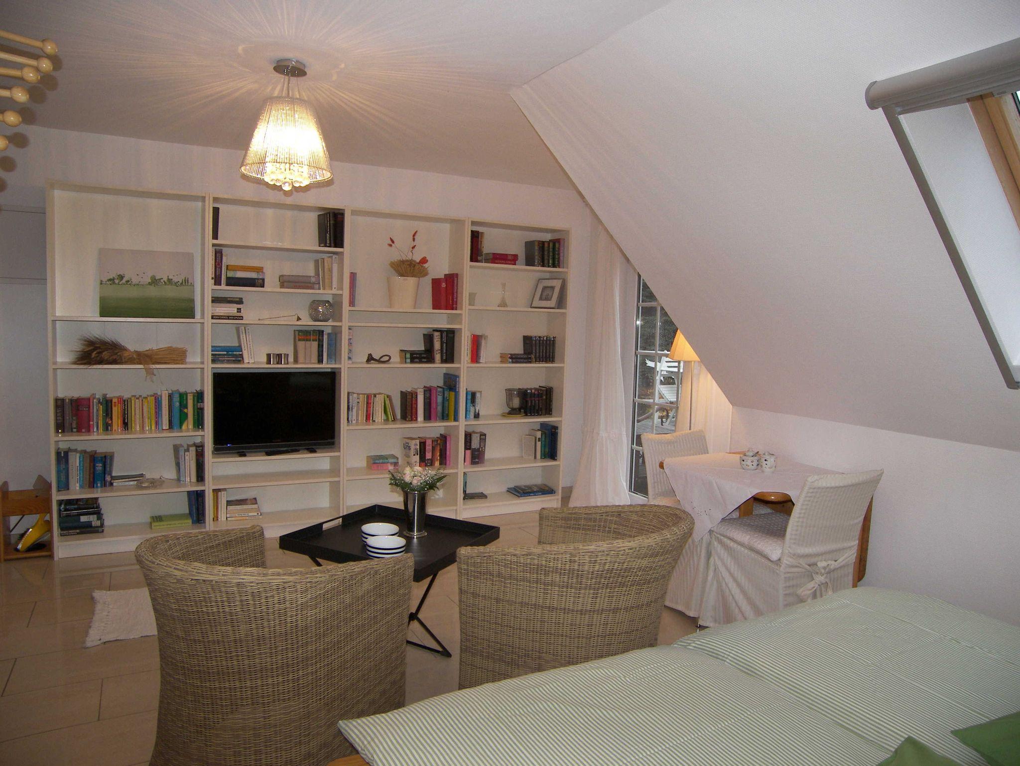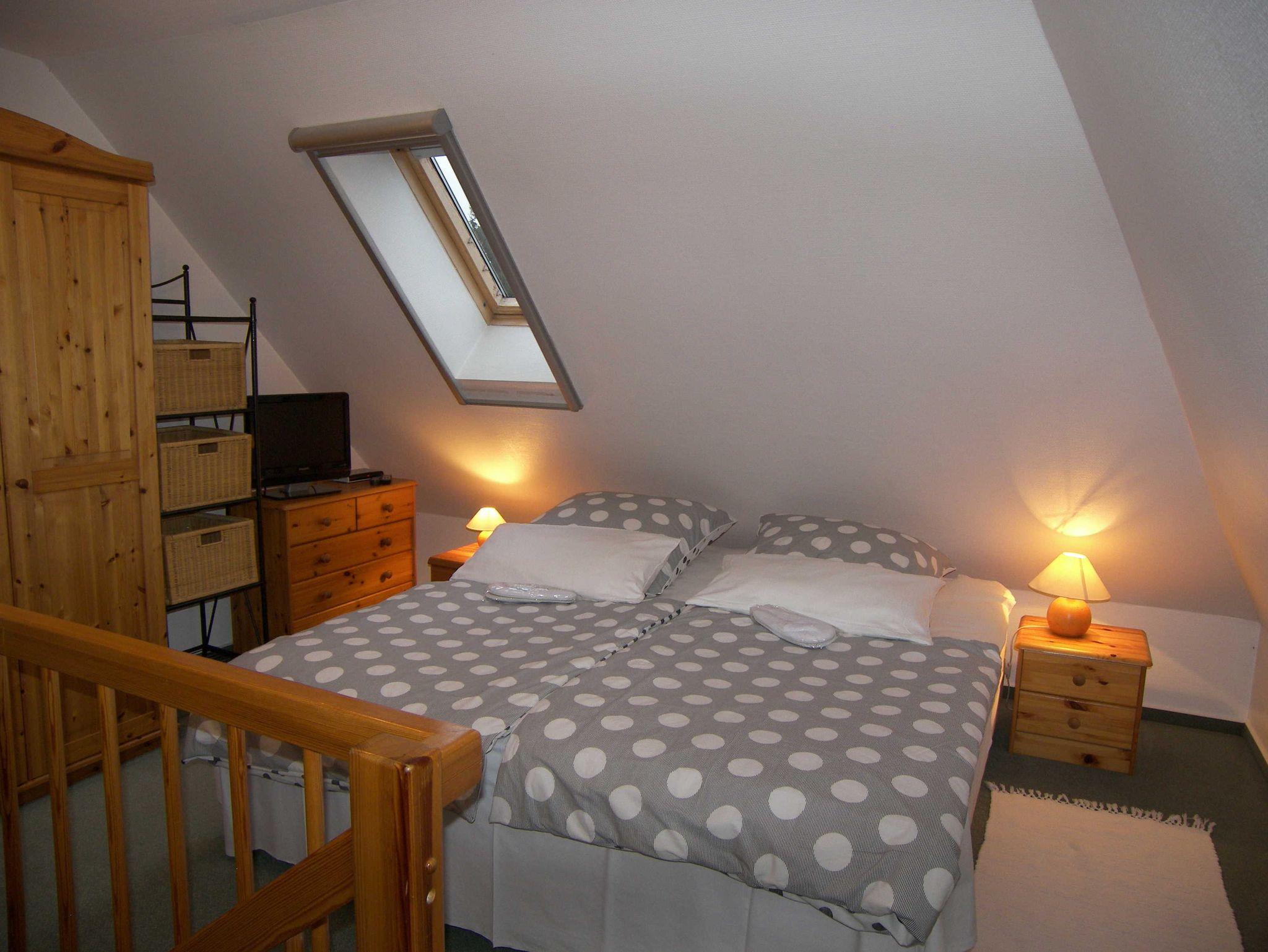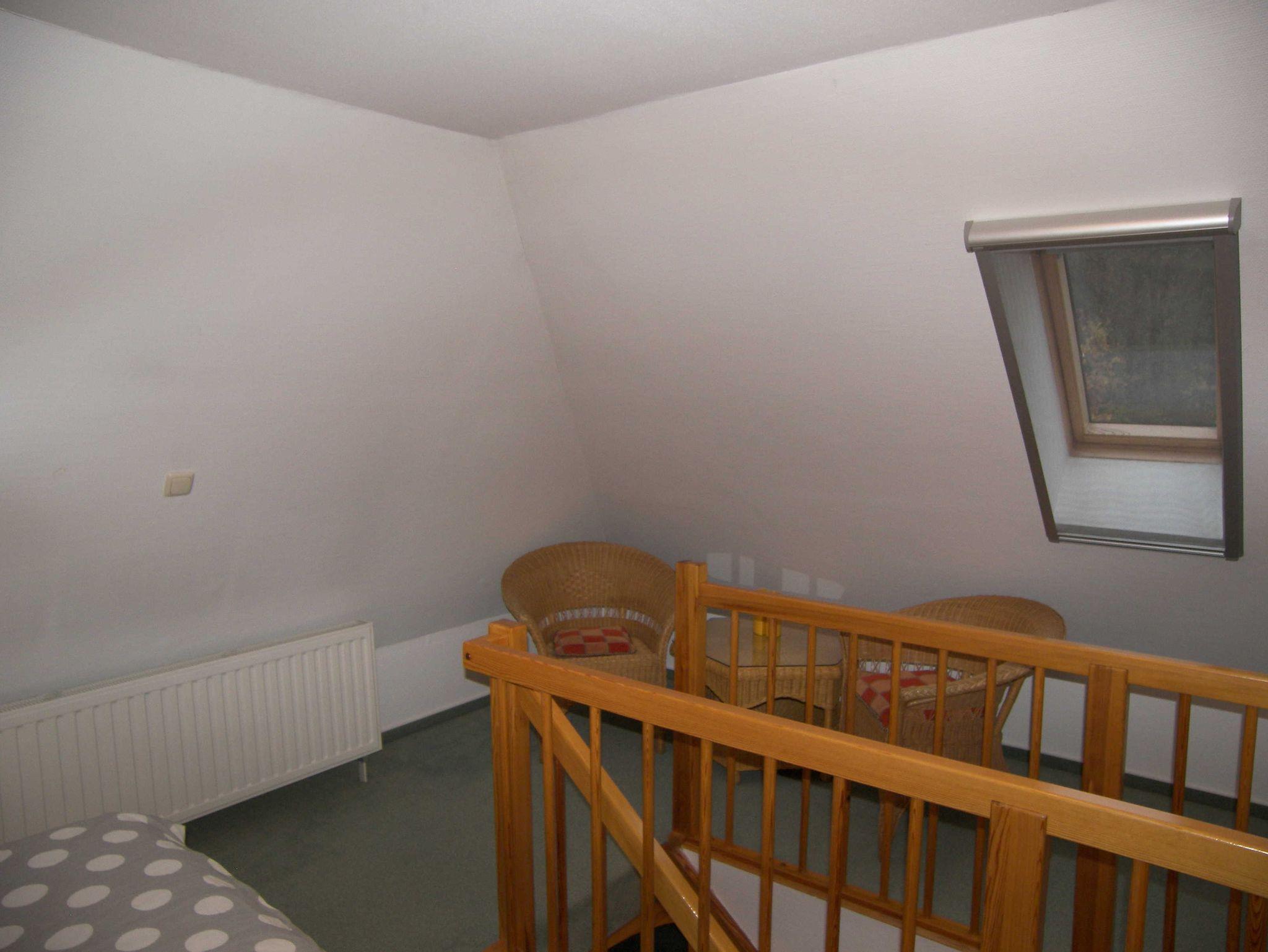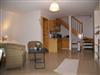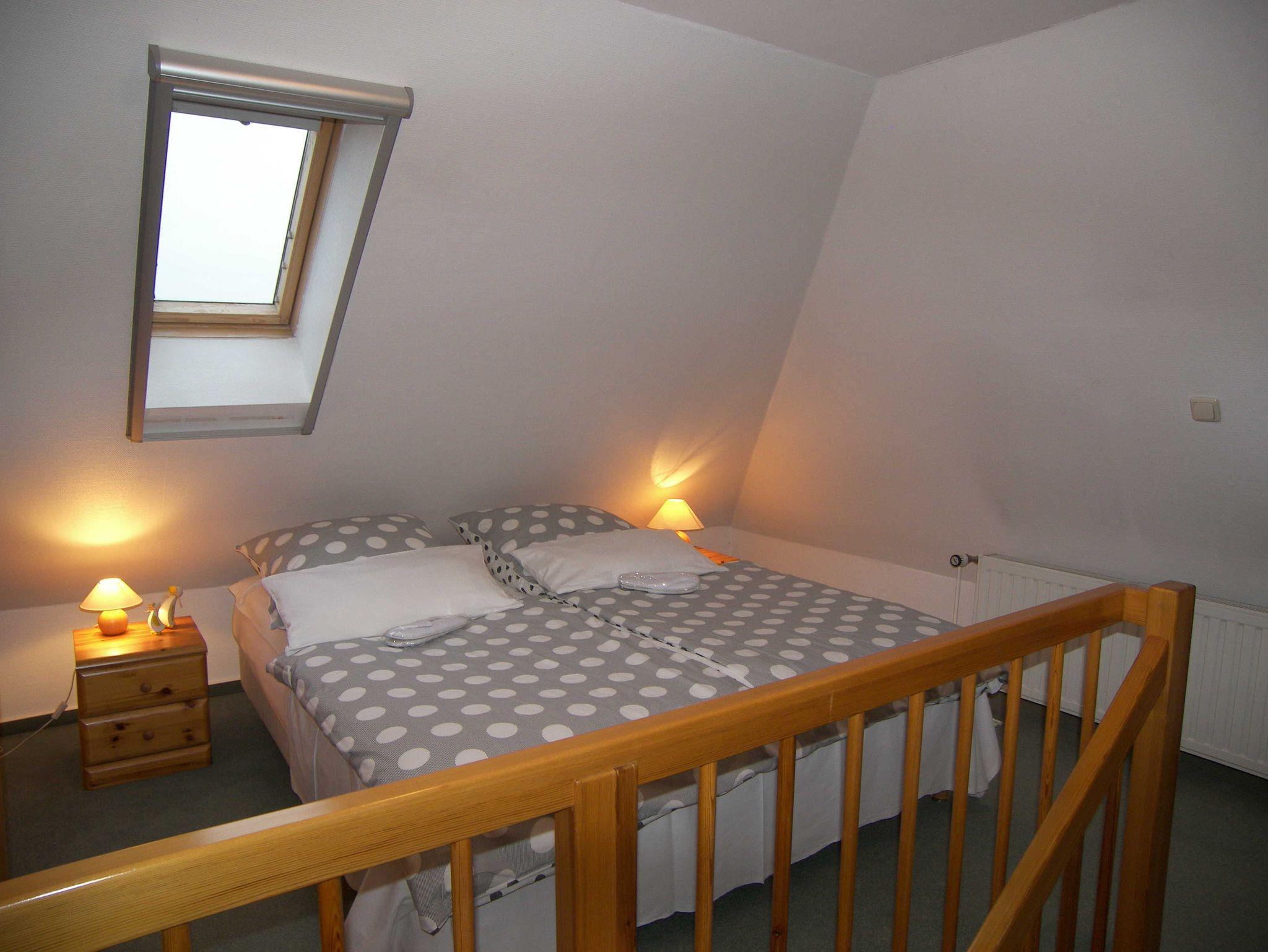 Die Maisonettewohnung befindet sich im 1. Obergeschoss und verfügt im unteren Bereich über einen kombinierten Wohn-/Schlafraum mit Doppelbett und gemütlicher Sitzecke, Flachbild-TV, Radio und W-LAN. Des Weiteren befindet sich auf gleicher Ebene die offene kleine Pantryküche mit 2-Kochfeld-Ceranplatte, Spülbecken, Kaffeemaschine, Toaster, Wasserkocher, Minibackofen und Kühlschrank sowie kleinem Esstisch. Küchenrolle und ein Geschirrhandtuch werden bereitgestellt. Das Bad ist mit Dusche/WC, Handtuchheizung und Haartrockner ausgestattet. Über eine Treppe erreichen Sie den oberen Schlafbereich mit einem weiteren Doppelbett, einem Kleiderschrank und einem weiteren Flachbild-TV.