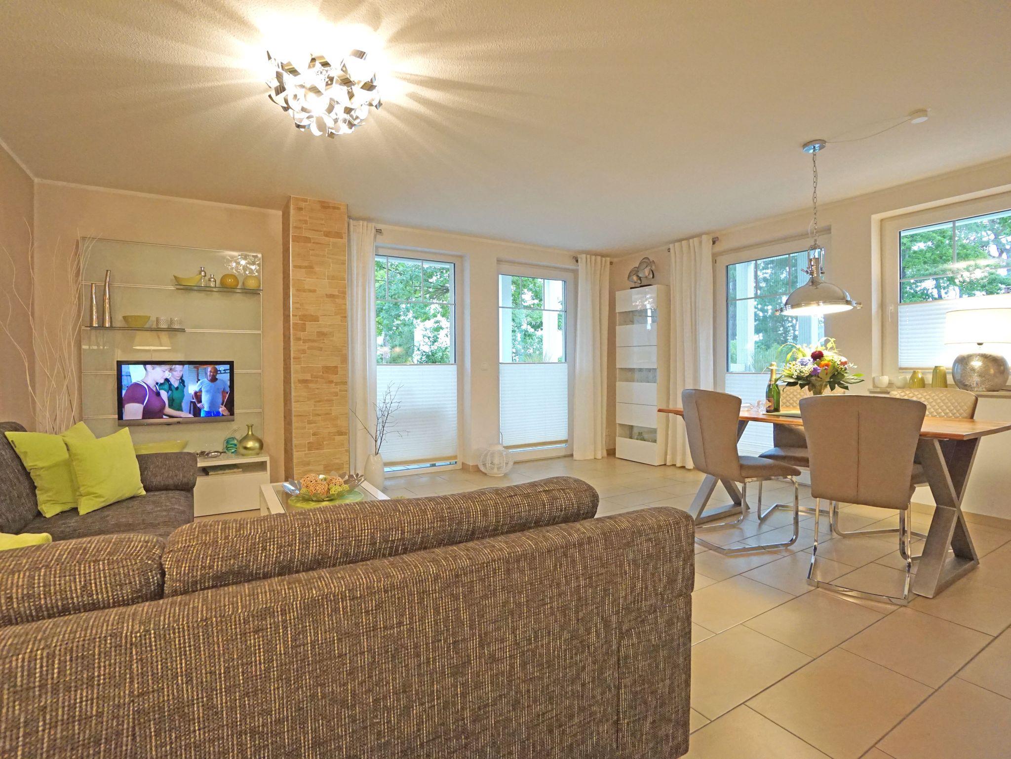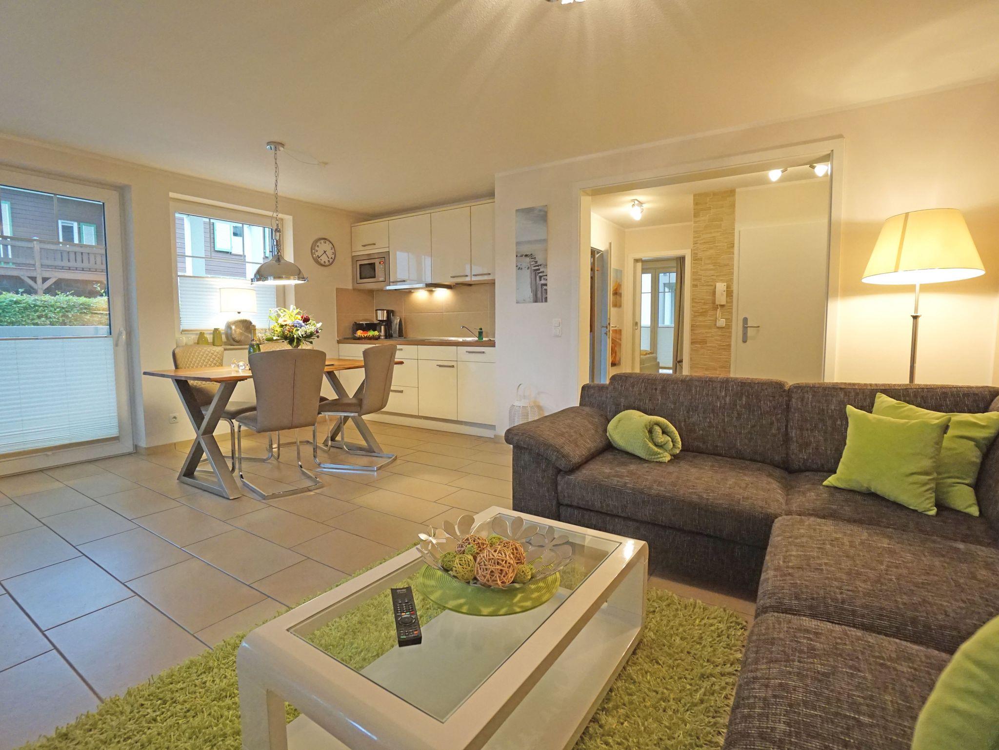 Die helle, harmonische und modern eingerichtete Ferienwohnung liegt im Erdgeschoss/Hochpaterre des Hauses. Ein großzügiges Wohnzimmer mit integrierter gut ausgestatteter Küchenzeile (4-Platten-Cerankochfeld, Mikrowelle, Spülmaschine, Kühlschrank mit Gefrierfach, Kaffeemaschine etc.), Essplatz mit 4 Stühlen, ein großes Ecksofa mit Schlaffunktion (für 2 Personen), LCD-SAT-TV, DVD-Player, Stereo, kostenfreies W-Lan. Vom Wohnzimmer gelangen Sie auf die beiden großen Balkone zur Nord/Ostseite (Morgensonne) und zur Süd/Westseite.
