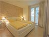 Ein Schlafzimmer mit weißem Lederdoppelbett (180 x 200), Übergardienen zum verdunkeln, Kleiderschrank und Flat-TV, von hier aus gelangt man auf den kleinen dritten Balkon.
