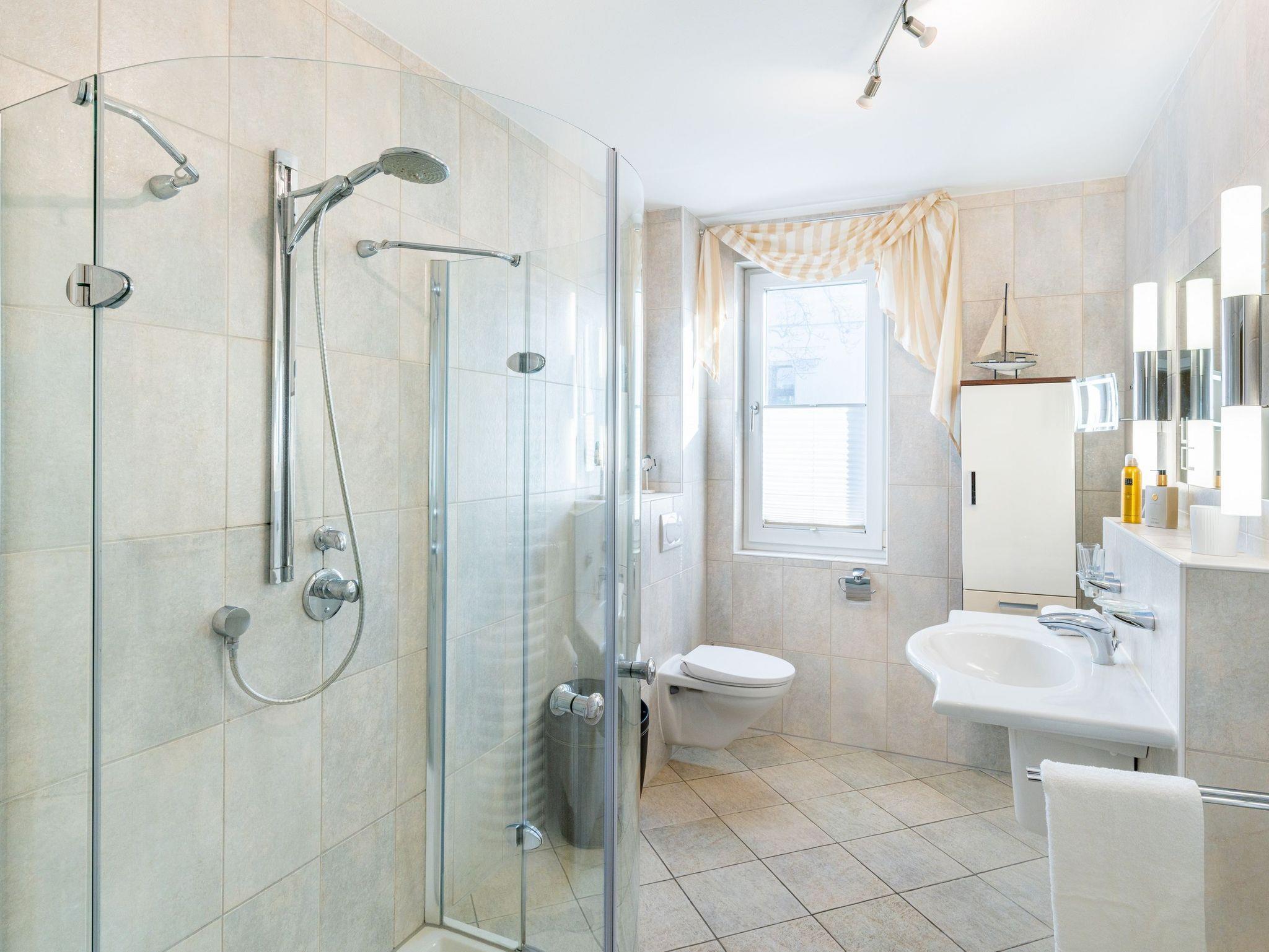 Das Badezimmer ist mit Dusche, WC und einem Haartrockner ausgestattet. Alle Zimmer sind vom Flurbereich begehbar. Ein Tiefgaragenstellplatz (Einfahrtshöhe 1,95m), ein gemeinschaftlich genutzter Fahrradabstellraum und ein WLAN-Zugang stehen kostenfrei während Ihrer Urlaubszeit mit zur Verfügung und runden den Urlaubskomfort dieses Appartements ab. Waschmaschine und Trockner können gegen Gebühr (Münzeinwurf) im Haus genutzt werden.