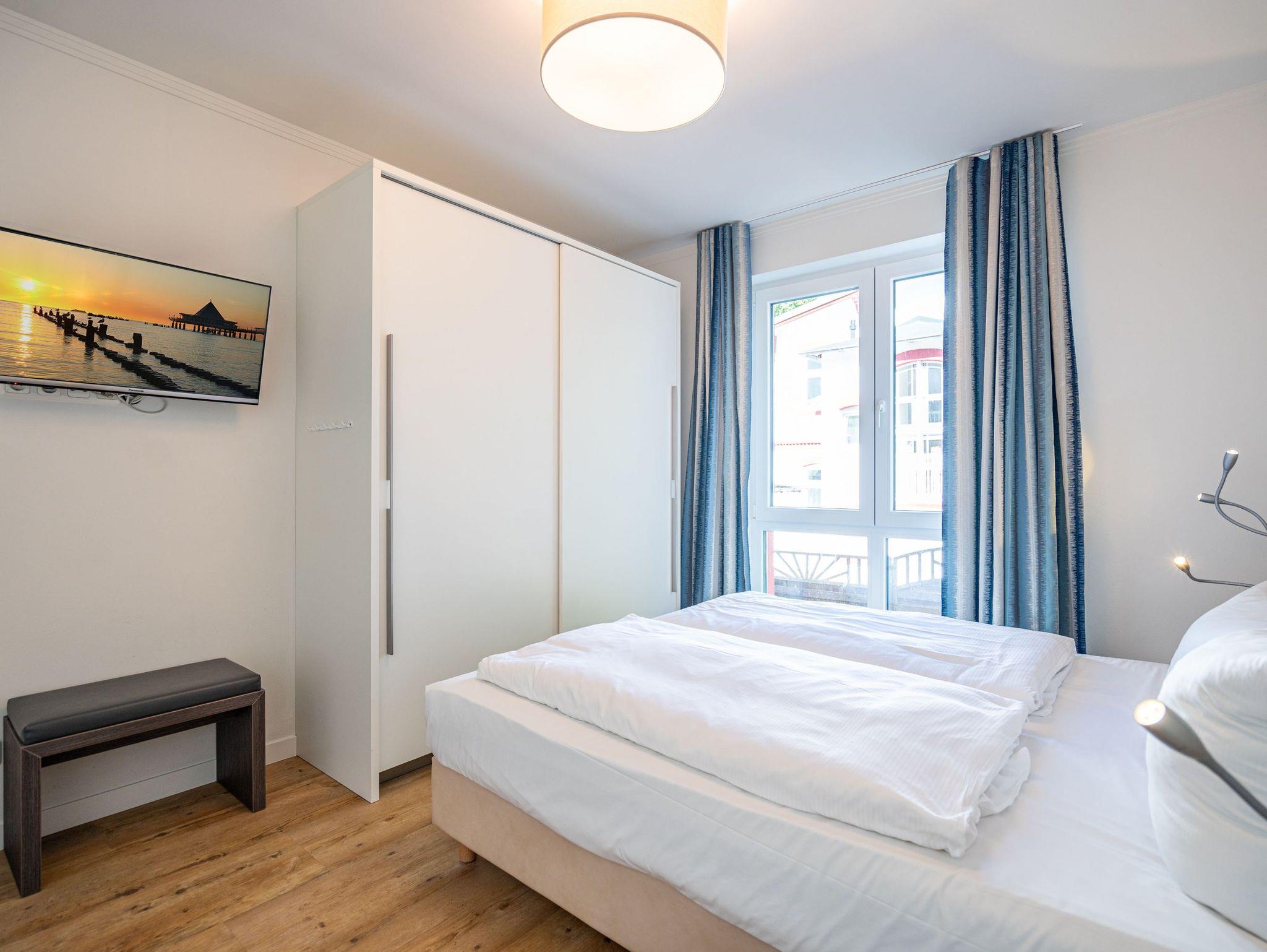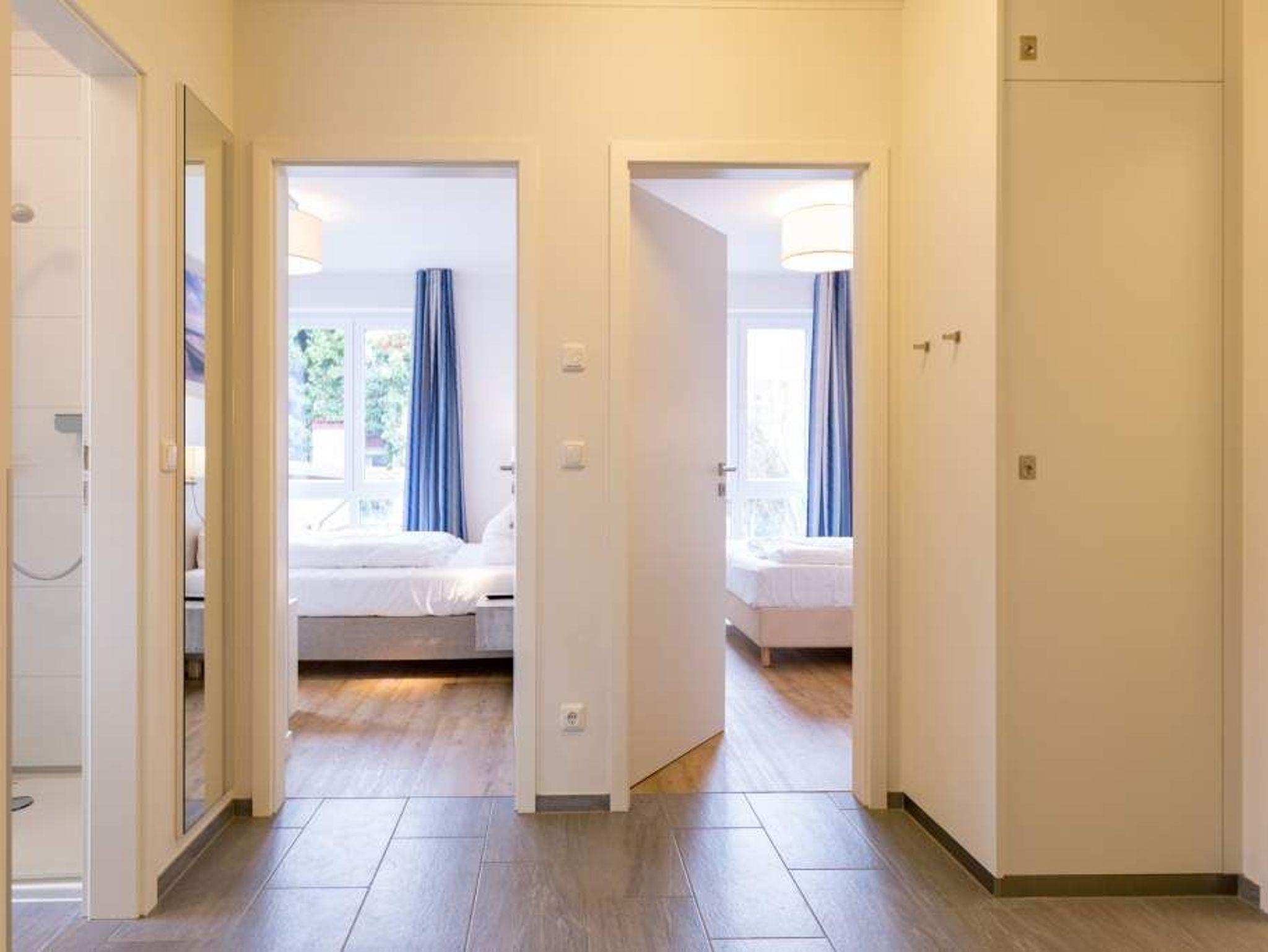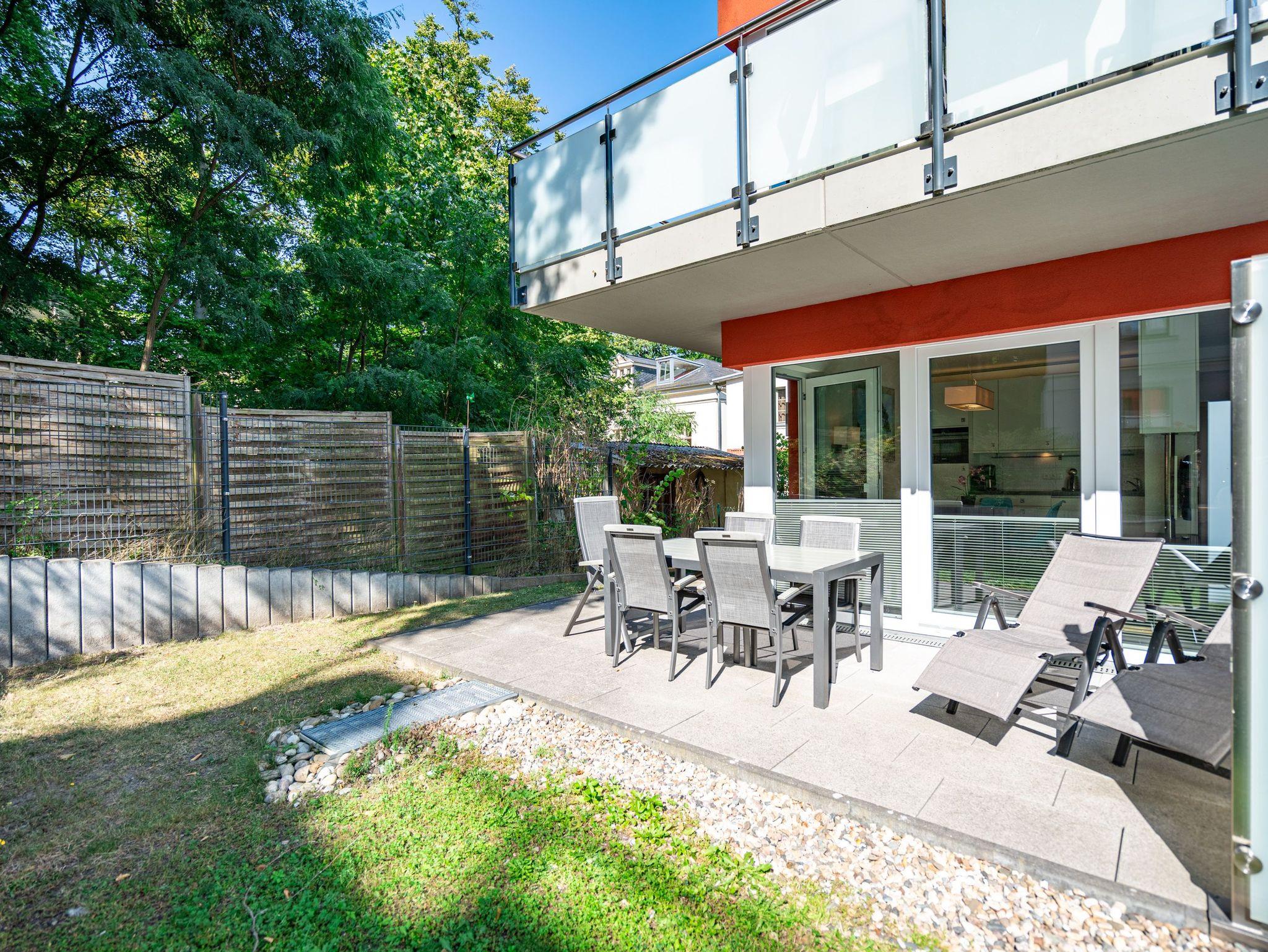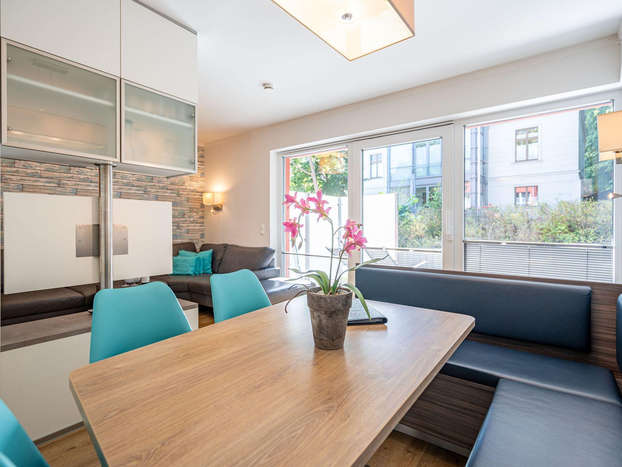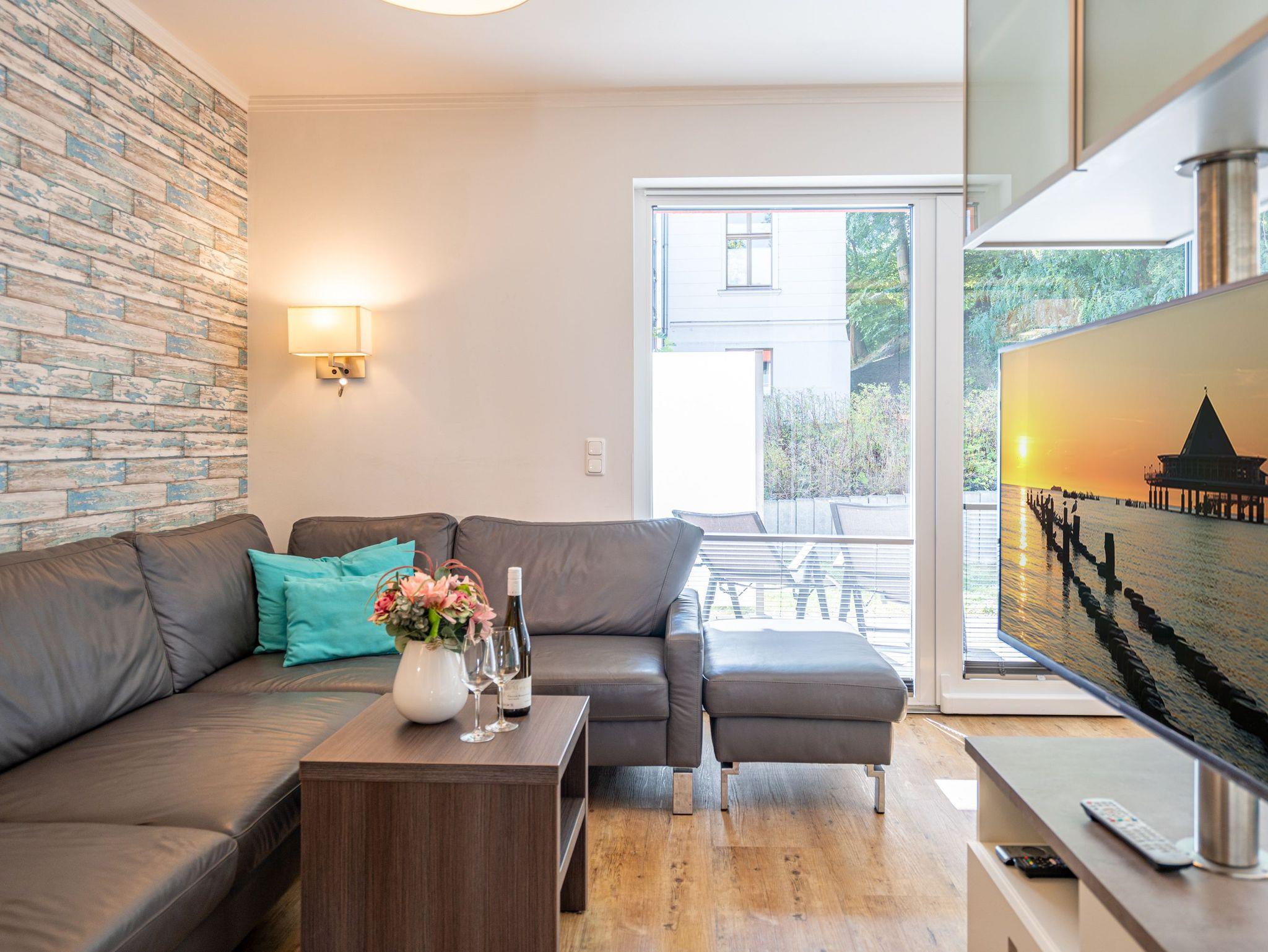 Freuen sie sich auf einen schönen Urlaub in dieser 3-Raum-Ferienwohnung ( 64 qm) im Erdgeschoss der Villa Limora. Helle Farben, modernes Design und Interior wurden kombiniert mit perfekten Einbauten und schaffen so den idealen Urlaubsrahmen für 4 Personen und ein Kleinkind bis 3 Jahre (im Babyreisebett).Der helle Wohnbereich mit großer Ledercouch und Flat-TV schließt sich an die offene, komplett ausgestattete Küche (Cerankochfeld, Geschirrspüler, Mikrowellenkombigerät) mit schönem Essplatz an. Von hier hat man auch Zugang zur großzügigen Südterrasse, die mit Gartenmöbeln ausgestattet ist. Zwei Schlafzimmer mit Doppelbetten (1x 1,80m x2,00m und 1x 1,60m x 2,00m) und jeweils separatem Flat-TV sorgen für erholsamen Schlaf. Die Wohnung wird ergänzt durch ein modernes Duschbad mit ebenerdiger Glasdusche und ein kleines Gäste-WC. In der Tiefgarage (Stellplatz 2) steht ein Pkw-Stellplatz zur Verfügung. Das WLAN-Netz in der Wohnung kann kostenfrei genutzt werden.