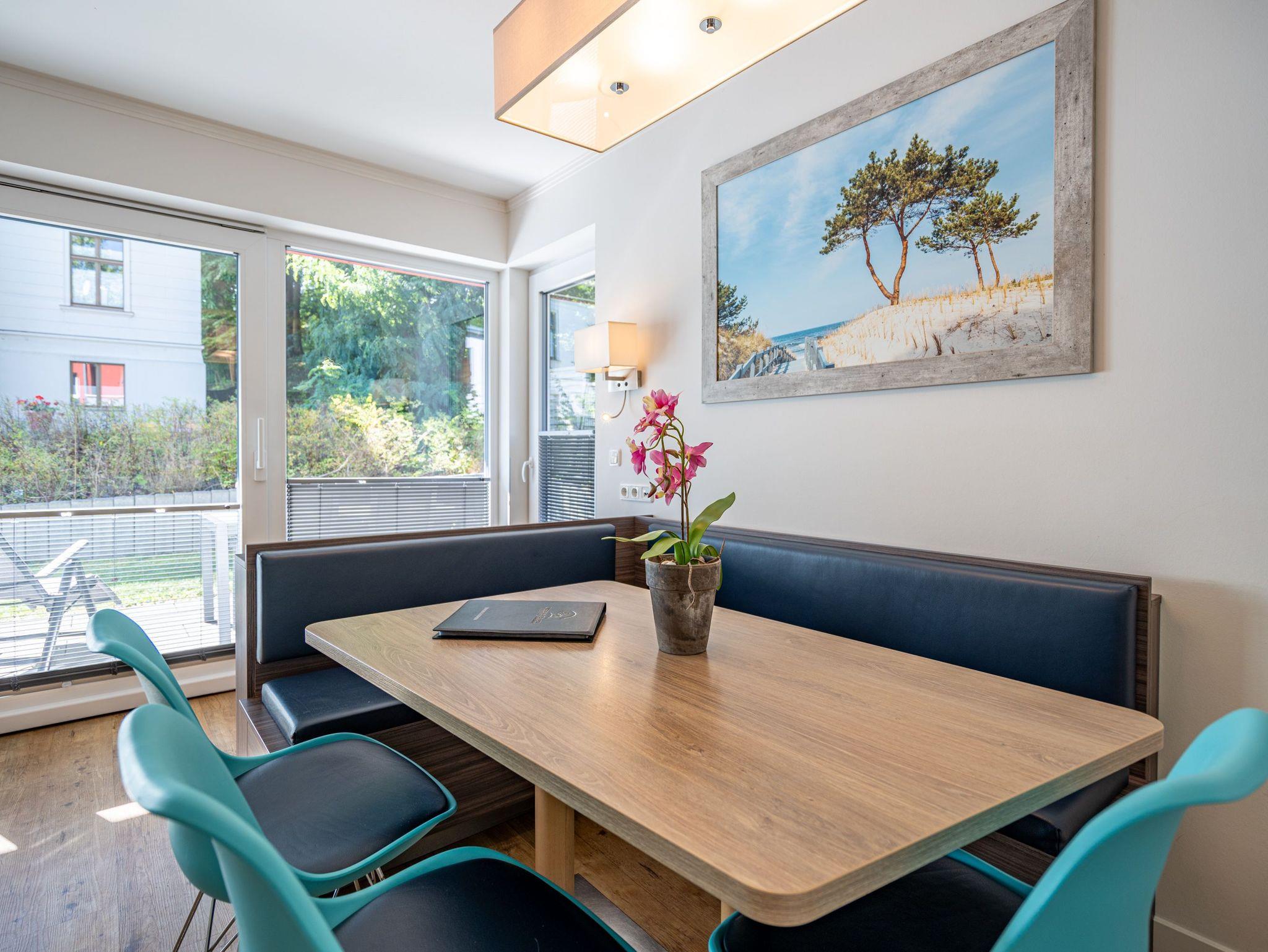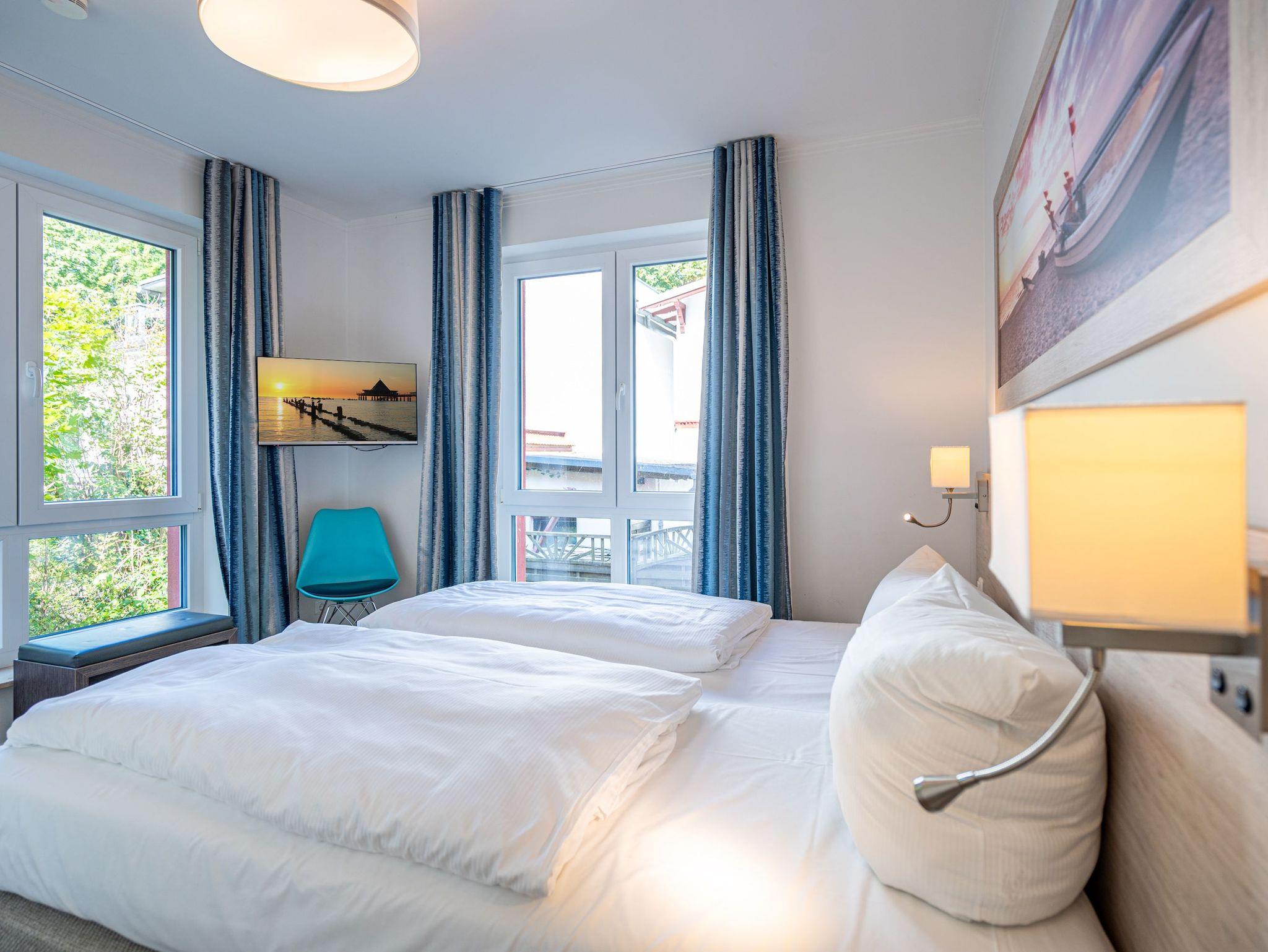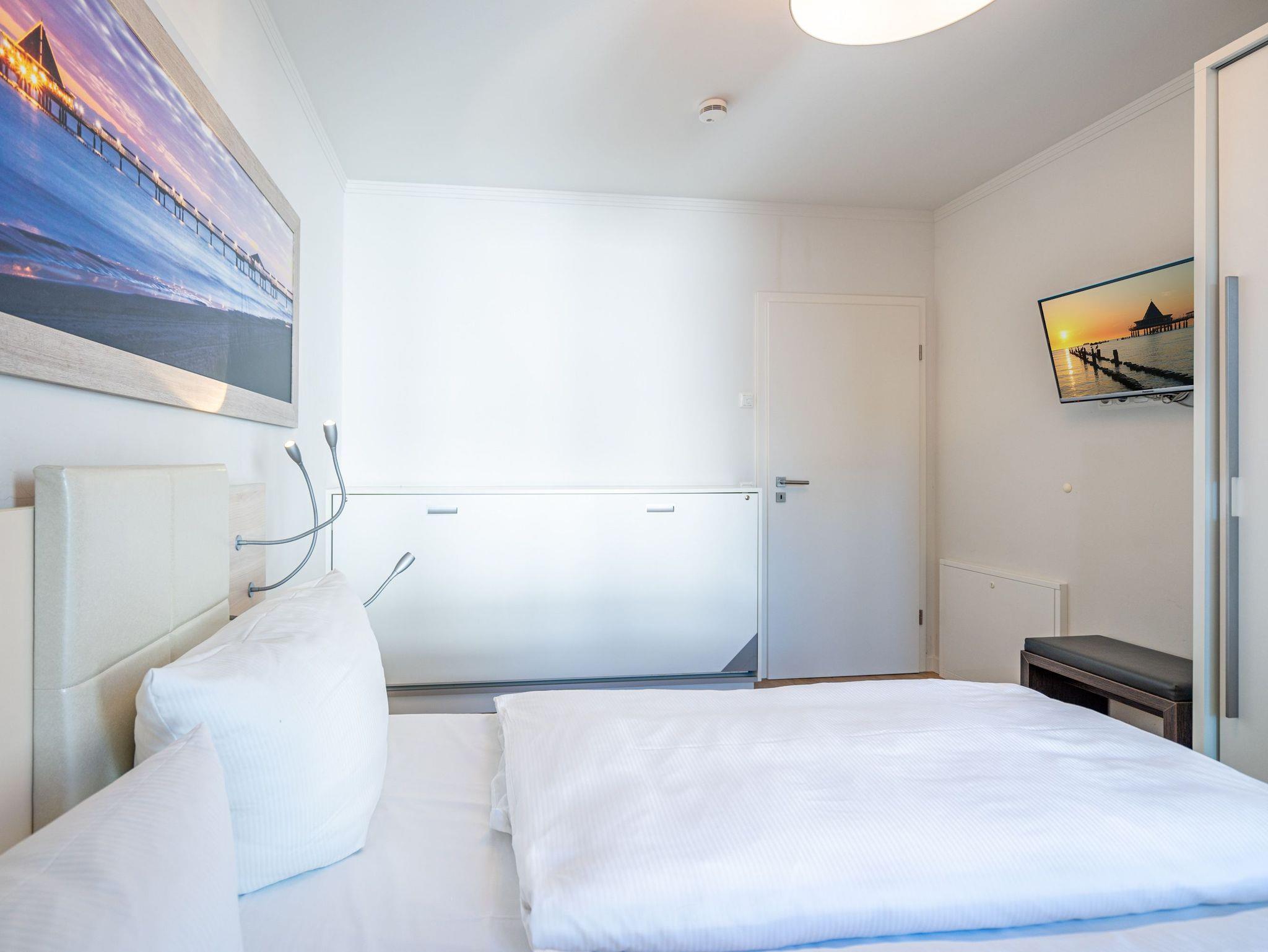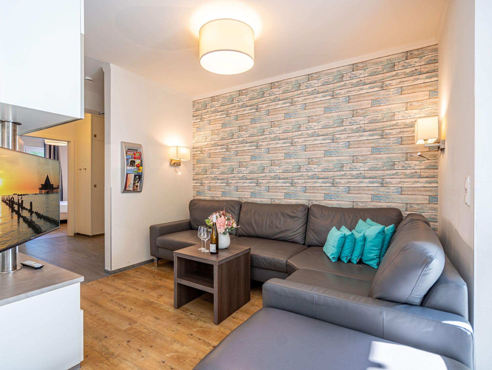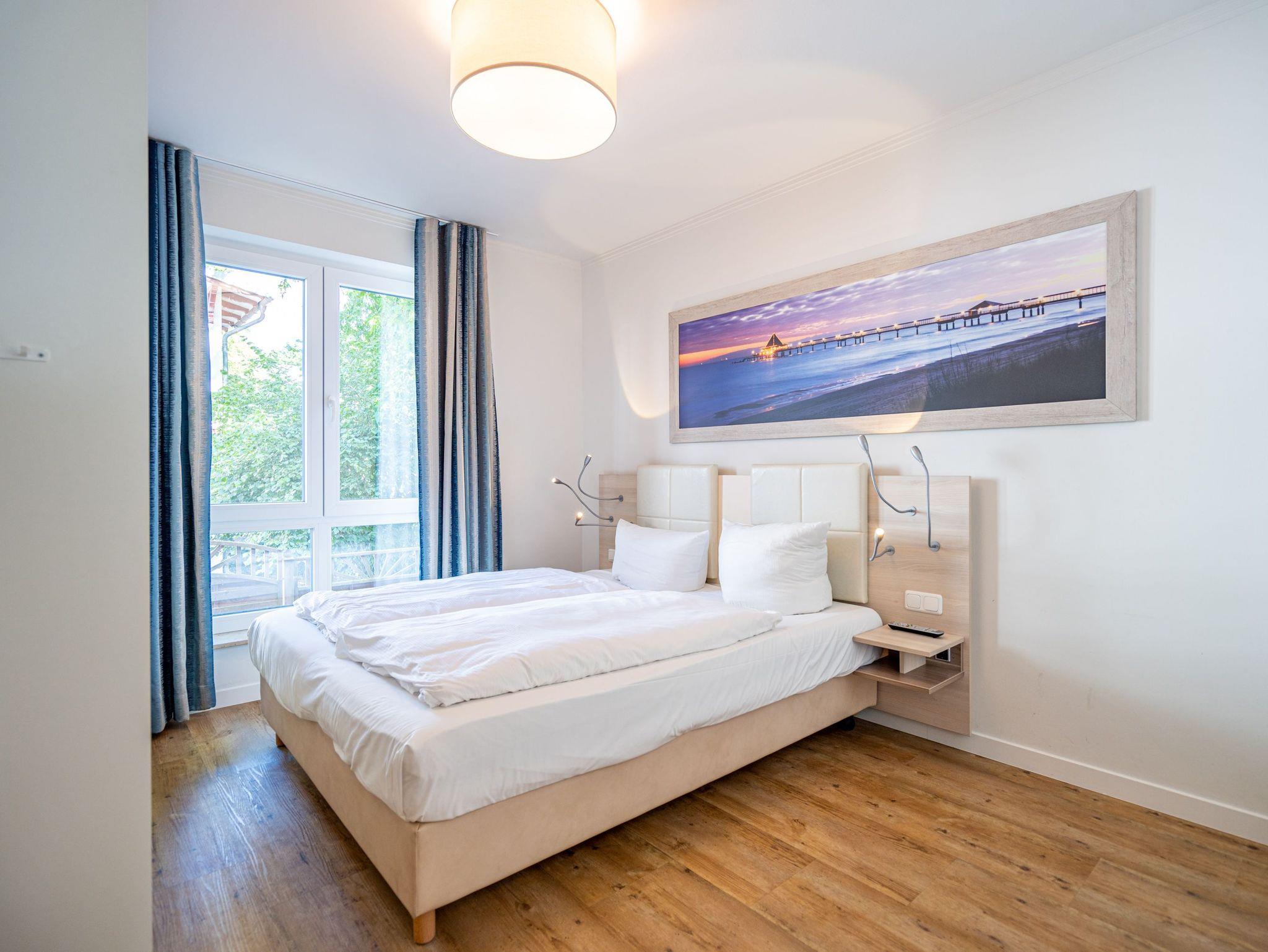 Freuen sie sich auf einen schönen Urlaub in dieser 3-Raum-Ferienwohnung ( 64 qm) im Erdgeschoss der Villa Limora. Helle Farben, modernes Design und Interior wurden kombiniert mit perfekten Einbauten und schaffen so den idealen Urlaubsrahmen für 4 Personen und ein Kleinkind bis 3 Jahre (im Babyreisebett).Der helle Wohnbereich mit großer Ledercouch und Flat-TV schließt sich an die offene, komplett ausgestattete Küche (Cerankochfeld, Geschirrspüler, Mikrowellenkombigerät) mit schönem Essplatz an. Von hier hat man auch Zugang zur großzügigen Südterrasse, die mit Gartenmöbeln ausgestattet ist. Zwei Schlafzimmer mit Doppelbetten (1x 1,80m x2,00m und 1x 1,60m x 2,00m) und jeweils separatem Flat-TV sorgen für erholsamen Schlaf. Die Wohnung wird ergänzt durch ein modernes Duschbad mit ebenerdiger Glasdusche und ein kleines Gäste-WC. In der Tiefgarage (Stellplatz 2) steht ein Pkw-Stellplatz zur Verfügung. Das WLAN-Netz in der Wohnung kann kostenfrei genutzt werden.