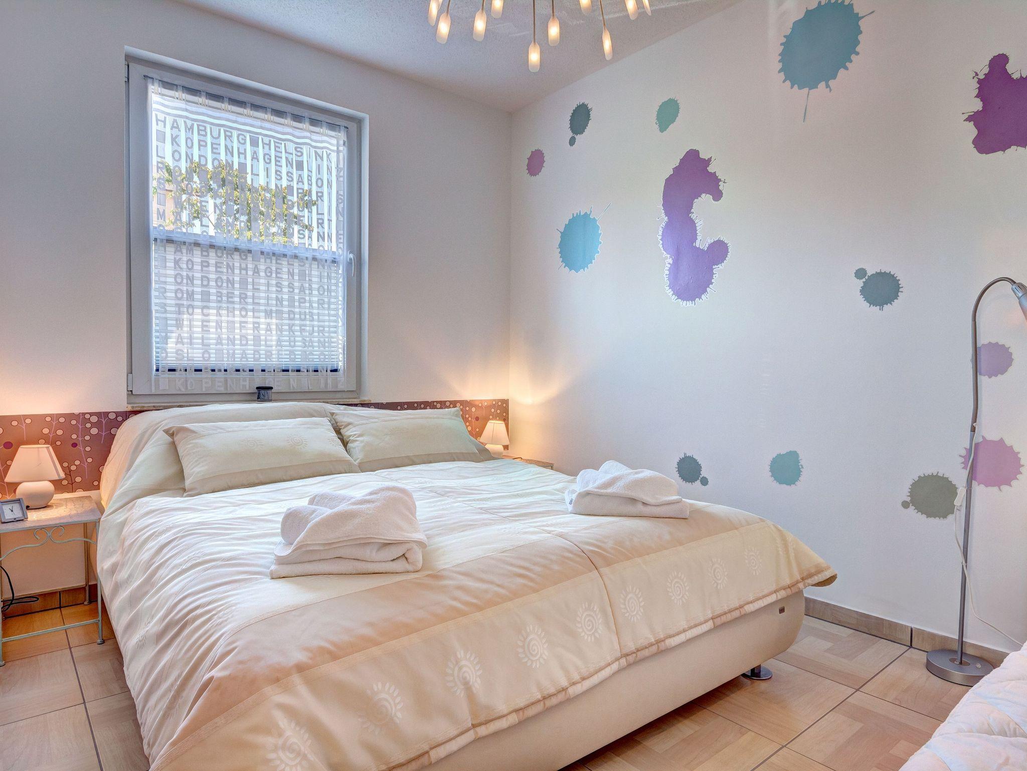 Im Schlafzimmer befindet sich ein großes Doppelbett sowie ein Einzelbett. Zusätzlich kann hier ein Kinderreisebett aufgestellt werden, welches gegen einen kleinen Aufpreis hinzugebucht werden kann. Die Bettwäsche für das Kinderreisebett können Sie gerne kostenpflichtig dazubuchen oder selbst mitbringen.
