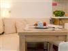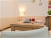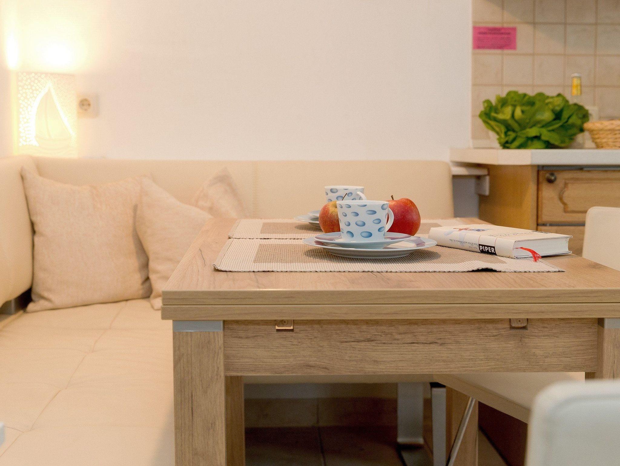 Freundliche Farben schaffen im Wohn- und Schlafzimmer eine angenehme und gemütliche Atmosphäre. Der helle Wohnraum ist mit Flat-TV sowie bequemer Couch und einem Sessel ausgestattet, die nach einem anstrengenden Tag zum Entspannen einladen. Eine Eckgarnitur bietet Platz für zwei Personen, um den kulinarischen Freuden zu frönen. Für die Zubereitung der Lieblingsspeisen bietet die in den Wohnraum integrierte Küchenzeile dank kleinem Backofen, Kochfeld, Kühlschrank mit Gefrierfach, Wasserkocher, Kaffeemaschine beste Voraussetzungen.
