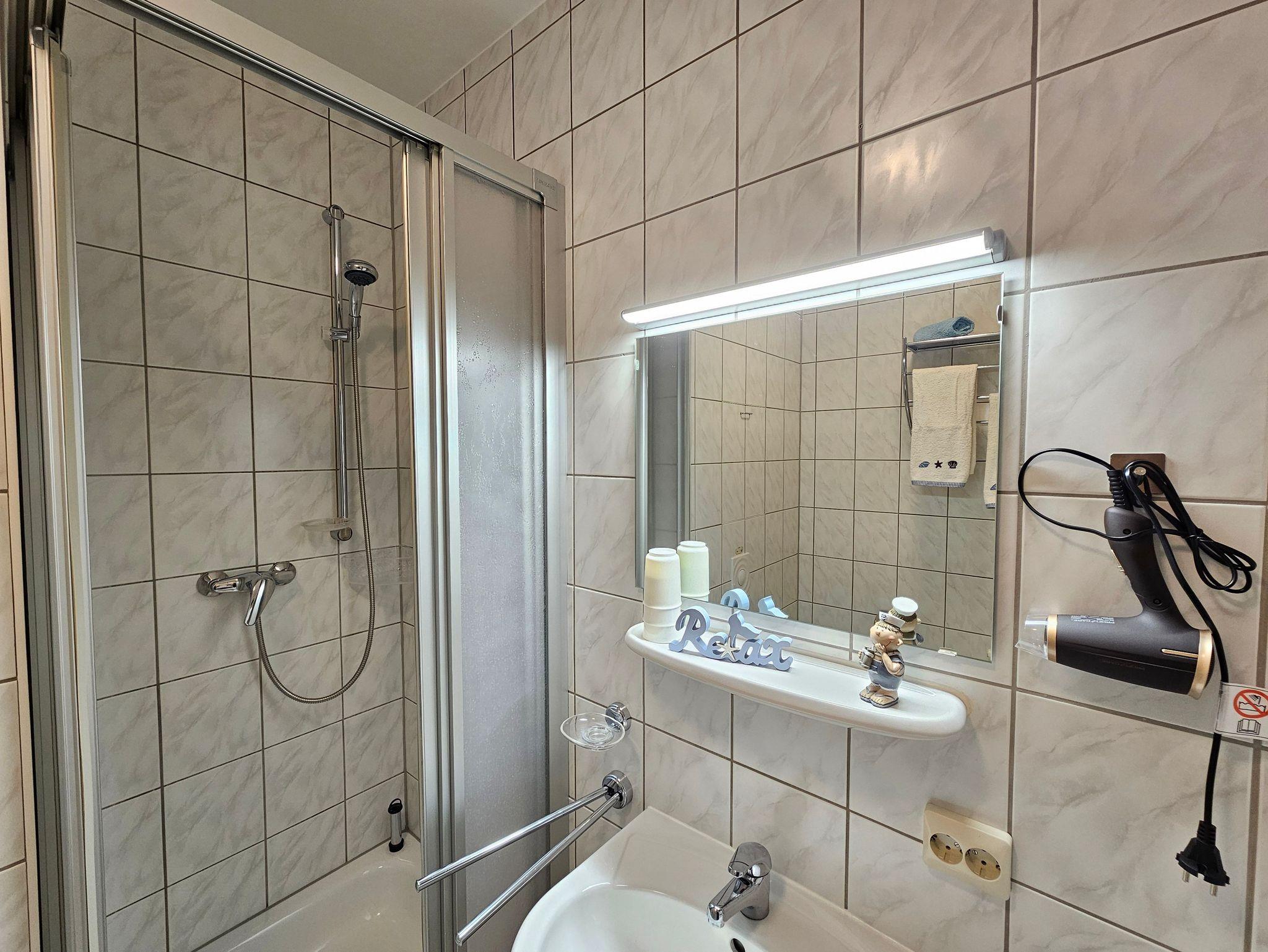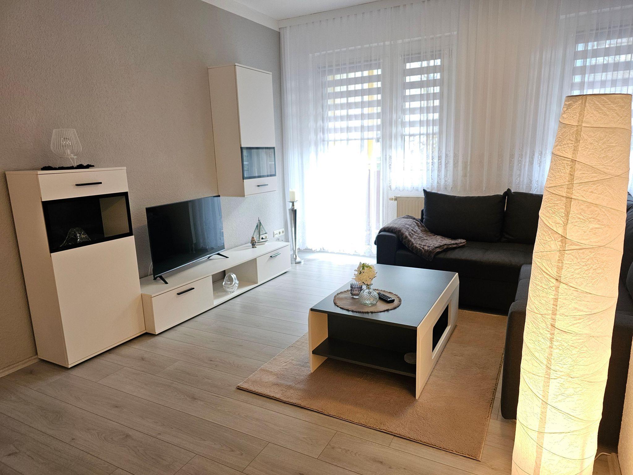 Die im Hochparterre gelegene Wohnung empfängt Sie mit einem gemütlichen Wohn-/Esszimmer sowie einer gut ausgestatteten separaten Küche (Backofen, 4-Zonen-Cerankochfeld, Mikrowelle, Kaffeemaschine, Toaster, Wasserkocher).