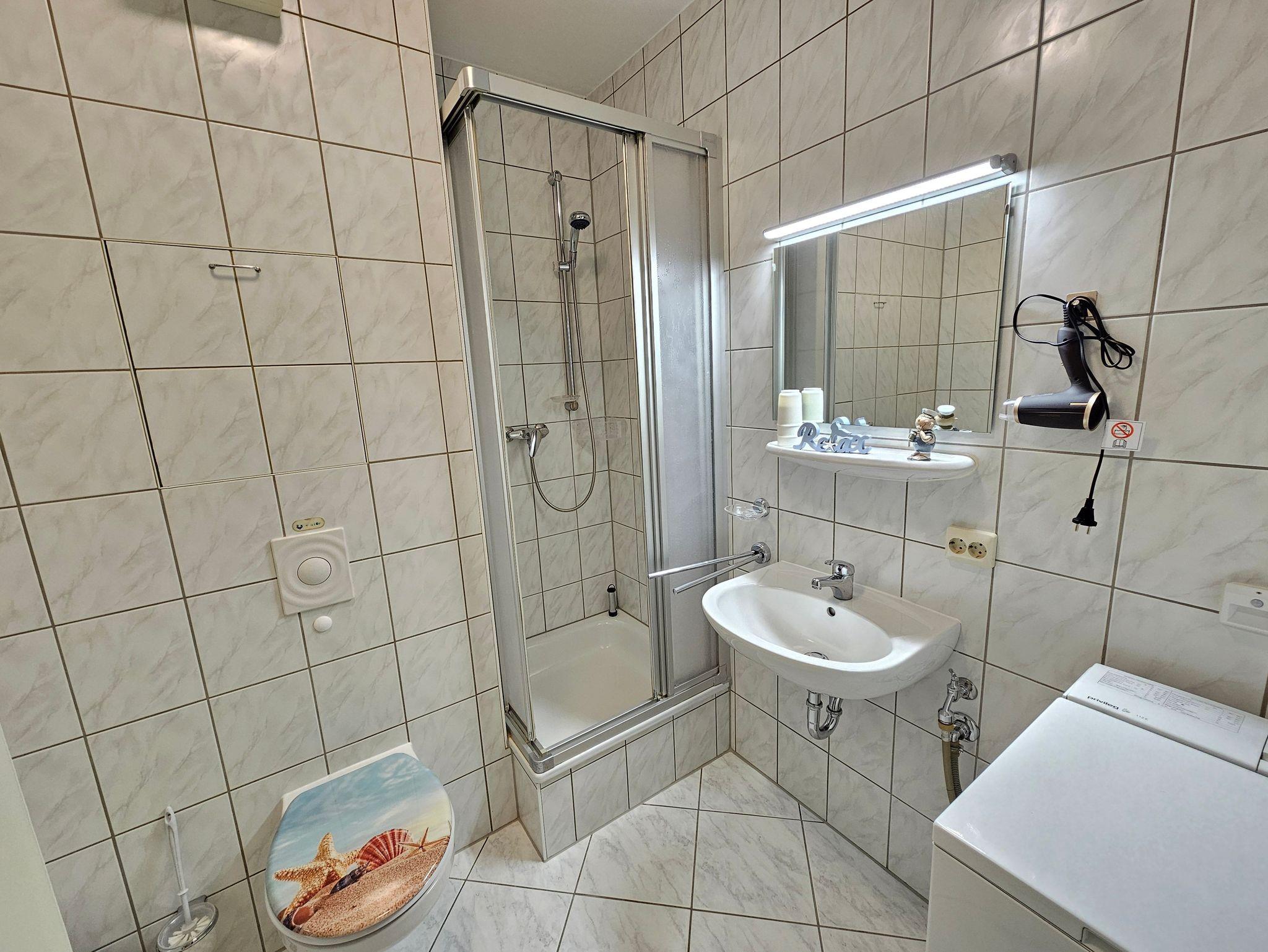 Das Badezimmer ist mit WC und Dusche, sowie einer Waschmaschine ausgestattet. Das Schlafzimmer verfügt über ein bequemes Doppelbett und einen großen Kleiderschrank.