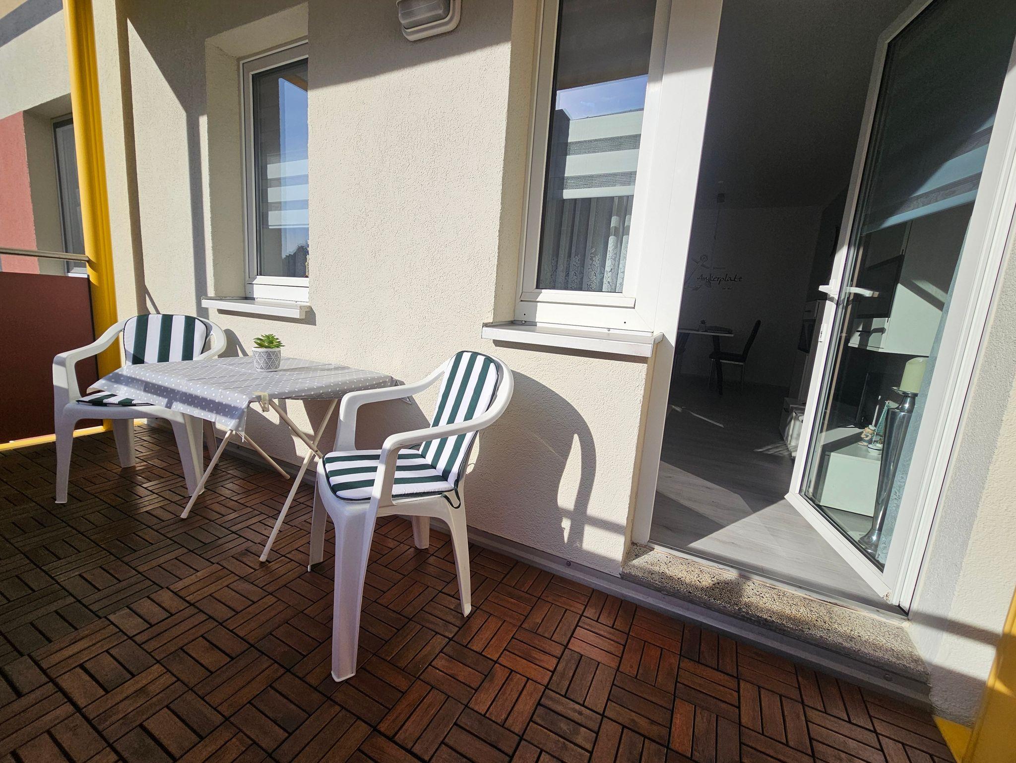 Der Wohnbereich lädt zu einem entspannten Abend auf der großen Eckcouch ein, die sich auch zu einem bequemen Schlafplatz für einen Erwachsenen oder ein Kinder bis max. 10 Jahre (oder ein Erwachsener) verwandeln lässt. Von hier aus gelangen Sie auch auf den in östlicher Richtung gelegenen Balkon. Dieser lädt zum Lesen Ihrer Urlaubslektüre, zum Sonnenbaden oder zu einem gemütlichen Gläschen Wein ein.
