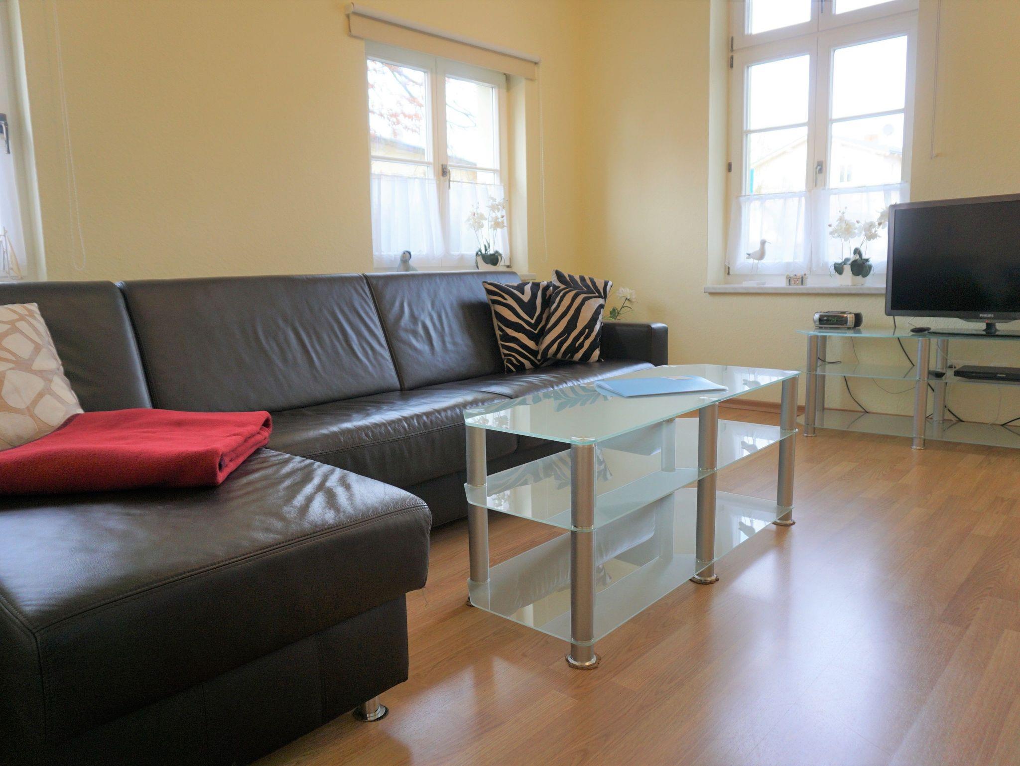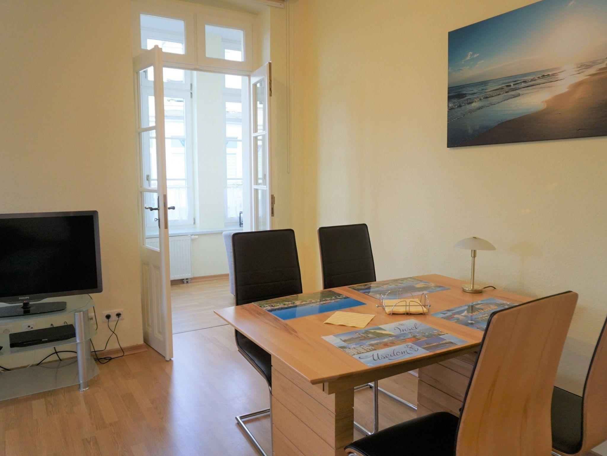 Herzlich Willkommen in der der Ferienwohnung Usedom. Die freundliche und helle Ferienwohnung ist ca. 74 m² groß und verfügt über ein Wohnzimmer mit hochwertigem Schlafsofa (1,60x2,00m), Flachbild TV und Essecke. Im Schlafzimmer findenSie ein Doppelbett und einen geräumigen Kleiderschrank sowie einen ausklappbaren Schlafsessel (0,80 x 1,90m). Von hier aus gelangen Sie zur gemütlich eingerichteten Loggia mit Sesseln und Leselampe. In der Küche sind ein Backofen, 4 Platten Cerankochfeld, Spülmaschine, Kühlschrank mit Tiefkühlfach, Mikrowelle, Toaster, Wasserkocher und Kaffeemaschine vorhanden. Im Bad gibt es eine ebenerdige Dusche mit WC und Waschbecken. Draußen lädt die Terrasse zum Verweilen ein.