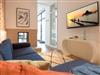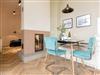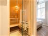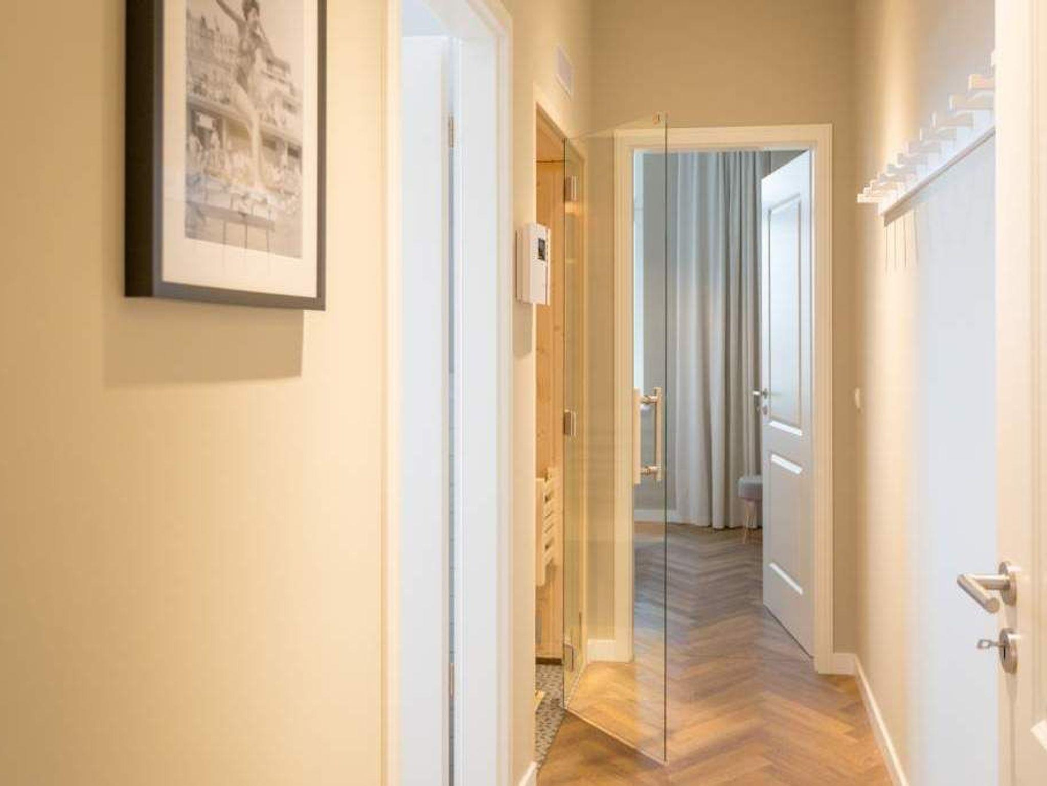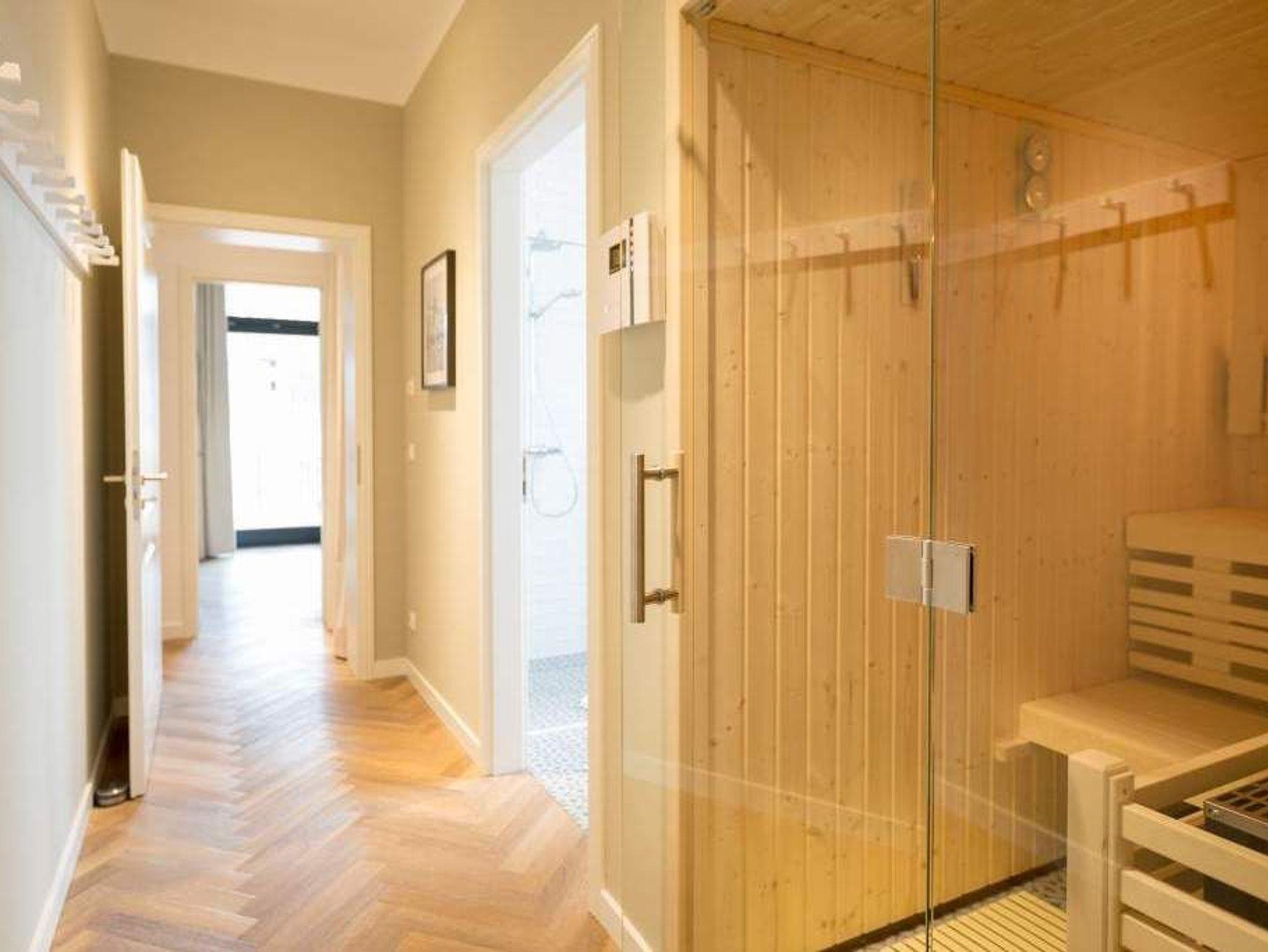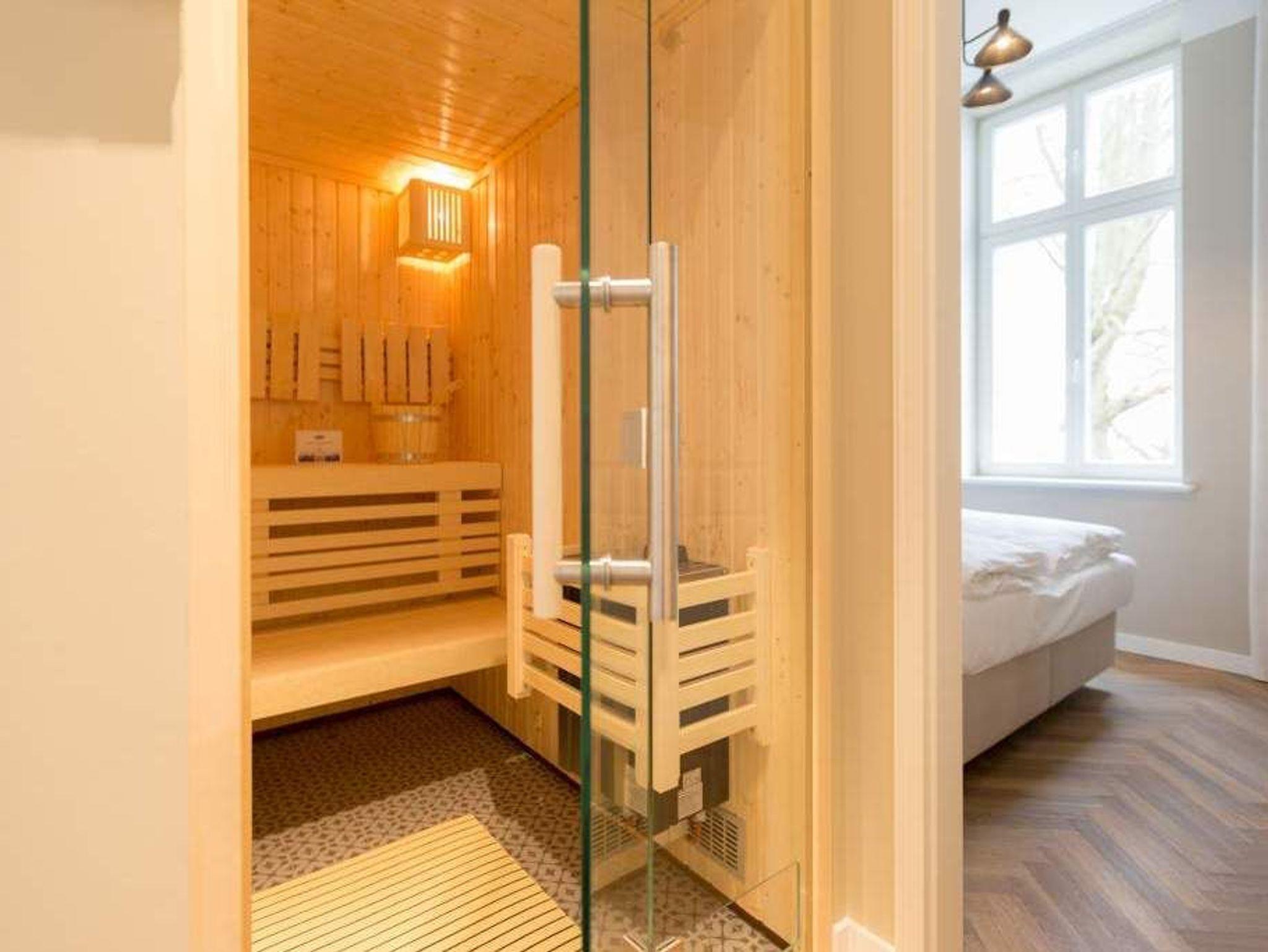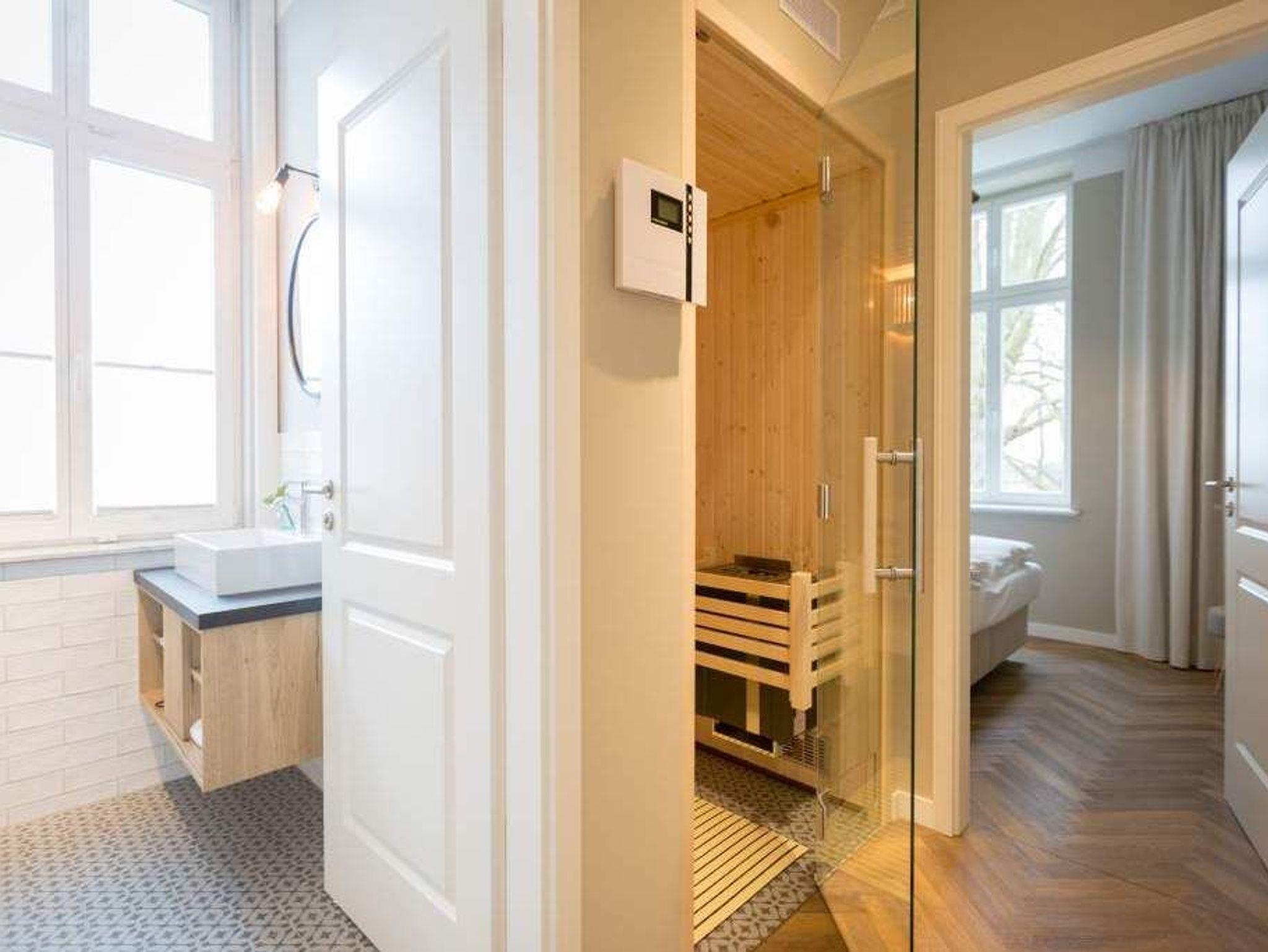 Geschichte zum Anfassen gibt es in der Wohnung 5 im 1. Obergeschoss der Villa Bellevue zu erleben. Denn dank der gelungenen Sanierung der alten Bädervilla können die Bewohner dieses knapp 70 Quadratmeter großen Feriendomizils durch die unverputzt gelassene Backsteinwand die Fenster- und Wandgestaltung der Kaiserzeit nachempfinden. Vier Erwachsenen und zwei Kindern bis drei Jahre (im Kinderreisebett) bietet das Appartement Platz für eine gemeinsame Auszeit. Hier am gemütlichen Esstisch gemeinsam zu dinieren und dabei auf den wunderschönen Gas-Kamin zu schauen, ist schon Erholung pur. Zum Kochen finden Sie in der offenen Wohnküche vom hochwertigen Markenherd, über die Mikrowelle bis hin zum großen Kühlschrank alles Nötige für ein gelungenes Menü. Warm und wohnlich wirken die drei Räume der Wohnung durch das schöne Fischgrät-Parkett. Faulenzen Sie auf dem gemütlichen Ecksofa beim Blick auf den auch von hier aus einsehbaren Kamin oder lassen Sie sich vom Home-Entertainment des 42-Zoll-Flat-TVs unterhalten. Sonne satt können Sie auf dem West-Balkon genießen. Ob beim Frühstück unter freiem Himmel oder mit einem kühlen Erfrischungsgetränk zum Abend ? von hier aus können Sie das sanfte Rauschen der nur 400 Meter entfernten Ostsee hören. Die beiden Schlafzimmer sind geräumig und wunderschön gestaltet, mit Boxspringbetten ( 1x 1,60 x 2,00m / 1x 1,80m x 2,00m) ausgestattet. Die edlen Design-Tapeten sorgen für eine exklusive Atmosphäre, die man nicht nur beim Schlafen genießen kann. Das Tageslicht-Bad verfügt über eine Dusche mit viel Platz, einen Waschtisch und ein WC. Highlight des hauseigenen Wellnessurlaubs wird ganz sicher der Genuss der finnischen Sauna werden, die an kühlen Abenden oder stürmischen Tagen für wohlige Wärme sorgt. Entspannen Sie, atmen Sie tief durch und vergessen Sie in dieser schönen Wohnung einfach einmal die Hektik und den Stress des Alltags. Wir sorgen für eine schöne Atmosphäre. Die Betten sind darum bei Ihrer Anreise schon bezogen und Handtücher liegen für Sie bereit. Ihr Auto können Sie auf dem Außenstellplatz des Hauses parken.