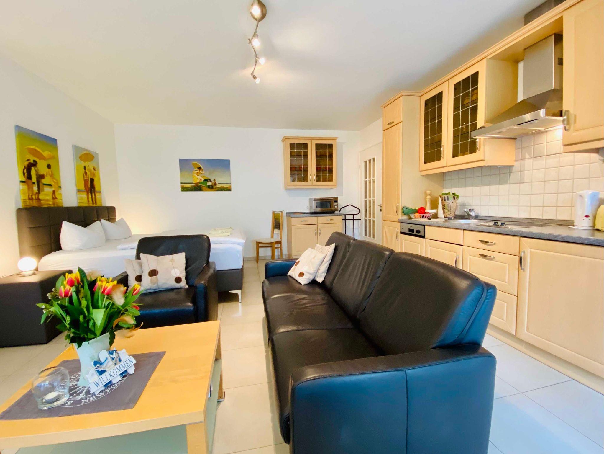 Sie verfügt über ein großes Boxspringbett, kleine Couchecke sowie eine Küchenzeile.