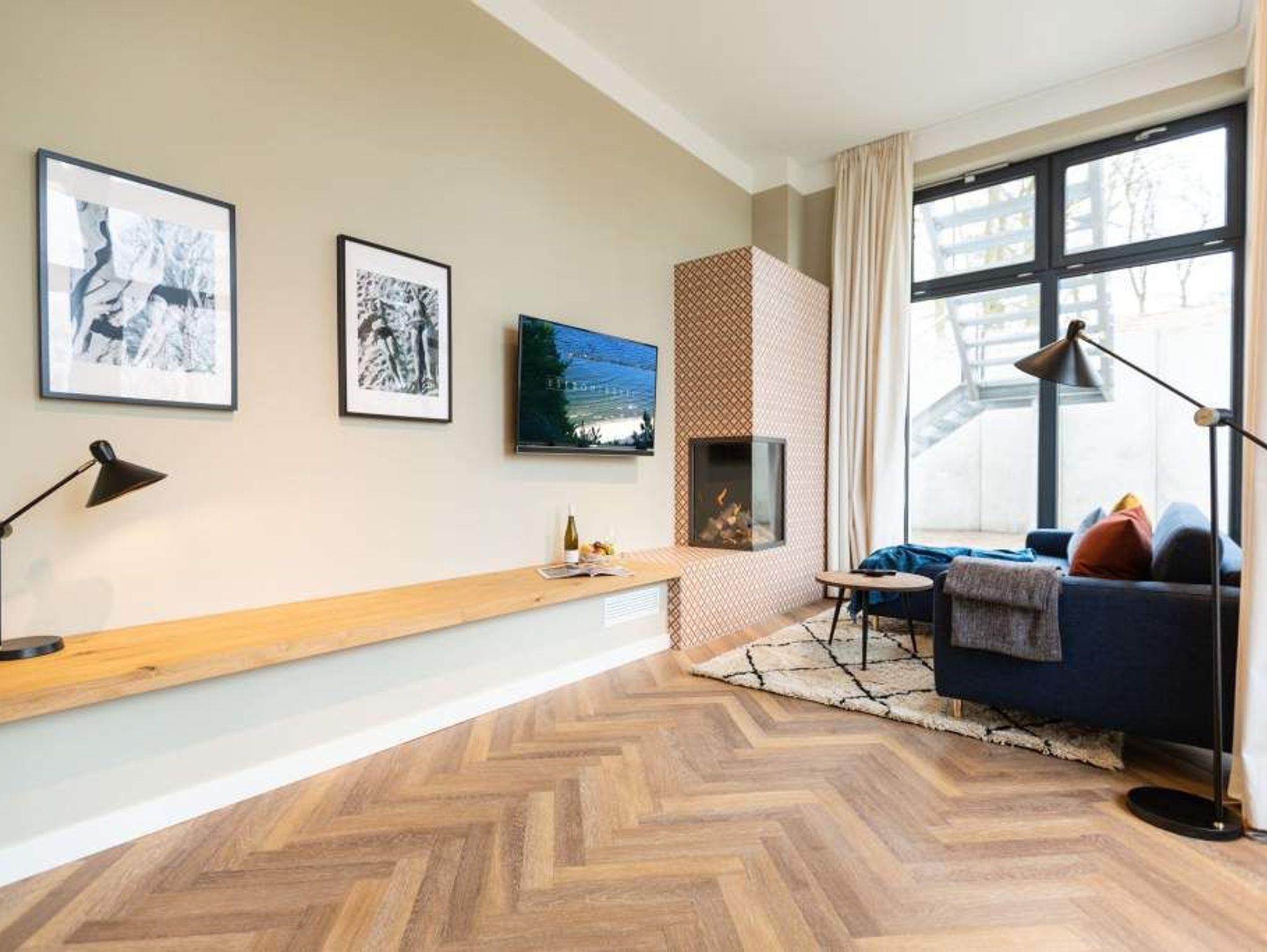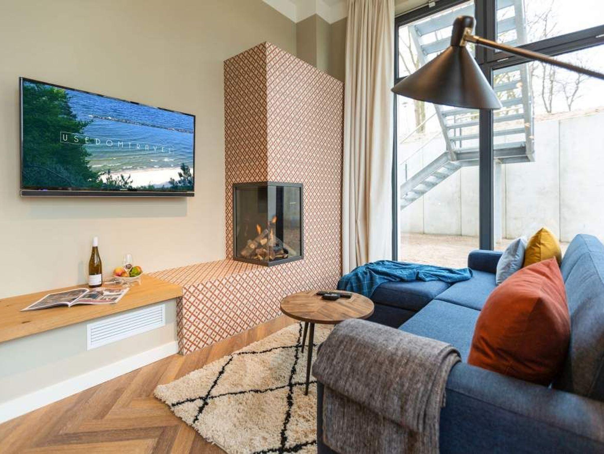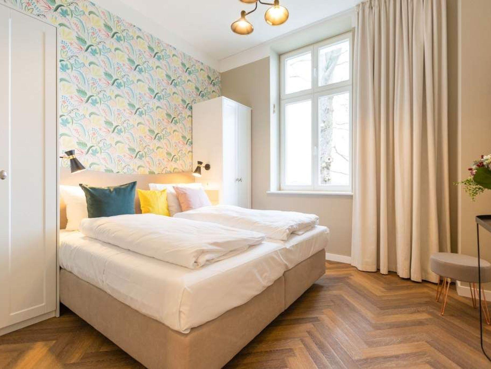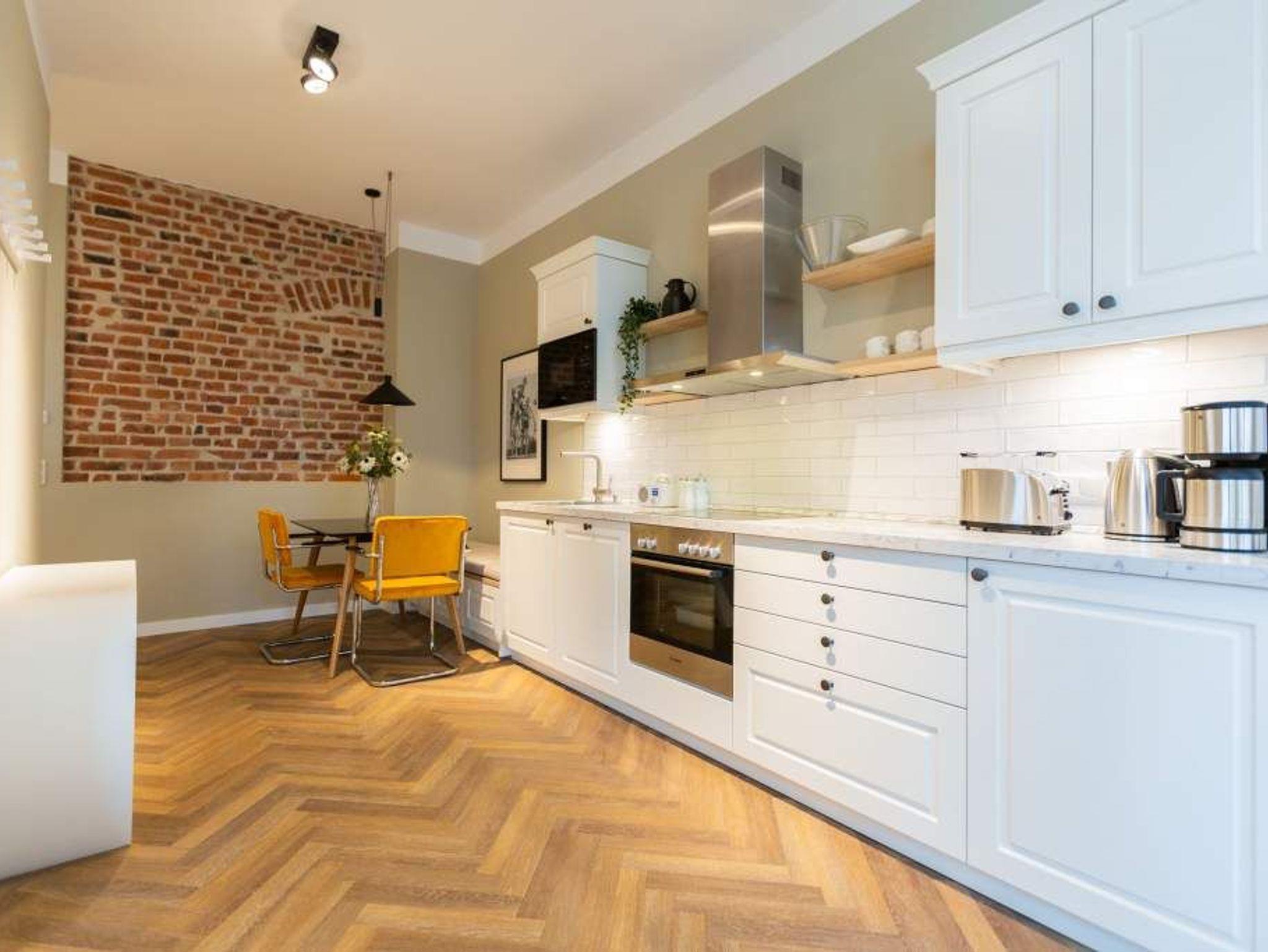 Vom Fischgrät-Parkett bis zu den edlen Design-Tapeten ? in der geschmackvoll eingerichteten Wohnung Nummer 3 im Erdgeschoss der Villa Bellevue hat alles Stil. Mit einem Händchen für exquisite Möbel und viel Liebe zum Detail ist das ganze Interieur des 70-Quadratmeter-Appartements in sich stimmig und besticht vom ersten Moment an als eine echte Wohlfühloase für Designliebhaber. Vor allem die Kombination aus sichtbar gelassener Bausubstanz und modernem Wohnkonzept macht einen großen Reiz dieses Domizils aus. Genießen Sie hier Ihre Auszeit mit Freunden oder der Familie. Vier Erwachsenen mit bis zu zwei Kindern bis drei Jahre (im Kinderreisebett) bieten die drei Räume viel Platz zum Entspannen und Urlauben. Highlight des offenen Wohn-Esszimmers ist der schöne, mit Vintage-Fliesen eingefasste Gas-Kamin, der per Knopfdruck wohlige Wärme spendet und mit seinem Flammenspiel ein wahrer Entschleuniger ist. Den besten Blick darauf haben Sie von der gemütlichen Sofalandschaft des Wohnbereichs. Für Unterhaltung sorgt zudem der 42-Zoll-Flat TV. Die West-Terrasse vor dem Wohnzimmer lädt zum Sonnen, Faulenzen und Sitzen ein. Vor allem gegen Abend ist sie ein wunderbar sonniges Plätzchen. Die weiße und offene Küche im Landhausstil ist mit allen modernen Geräten ausgestattet, die es für ein gemeinsames Kochevent braucht. Der Essplatz mit den stylischen Retro-Freischwingern eignet sich ideal zum Dinieren und Diskutieren. Die beiden Schlafzimmer warten mit jeweils einem komfortablen Boxspringdoppelbett (beide 1,80 m x 2,00 m) nur darauf, Ihnen auch nachts Freude zu bereiten. Wunderschön sind die in beiden Zimmern unterschiedlichen Tapeten. Wellness in den eigenen vier Wänden, das können Sie in der finnische Sauna genießen. Die anschließende Dusche im geräumigen Badezimmer kann bei so viel Platz sogar zu zweit Spaß machen. Die Wohnung hat einen kostenfreien WLAN-Zugang und einen Pkw-Stellpatz. Lassen Sie sich einfach fallen. Wir haben für Sie die Betten bei der Anreise bezogen und Handtücher bereit gelegt.