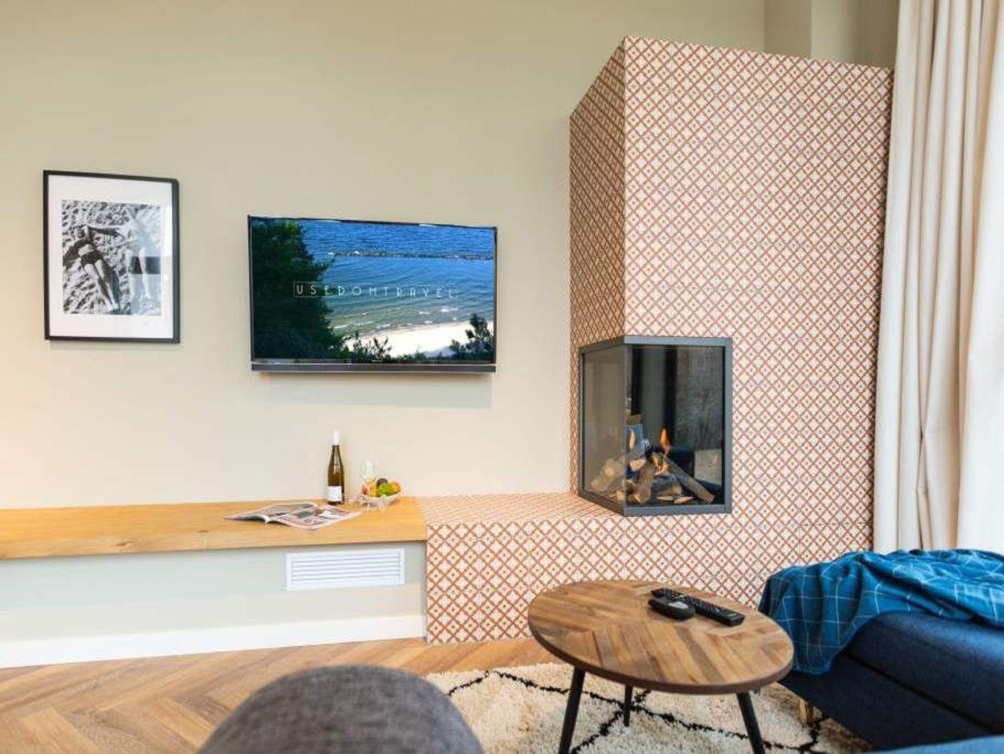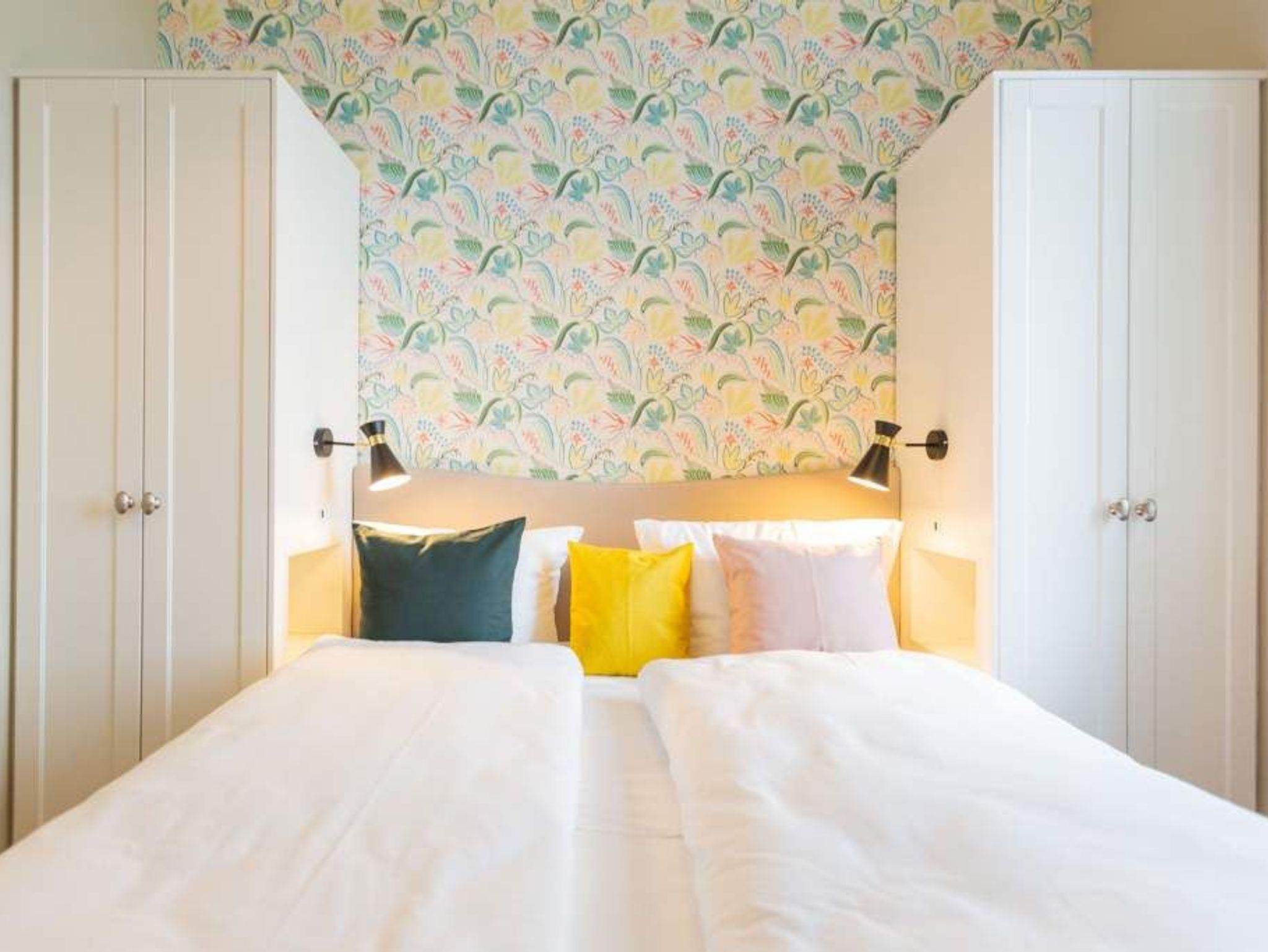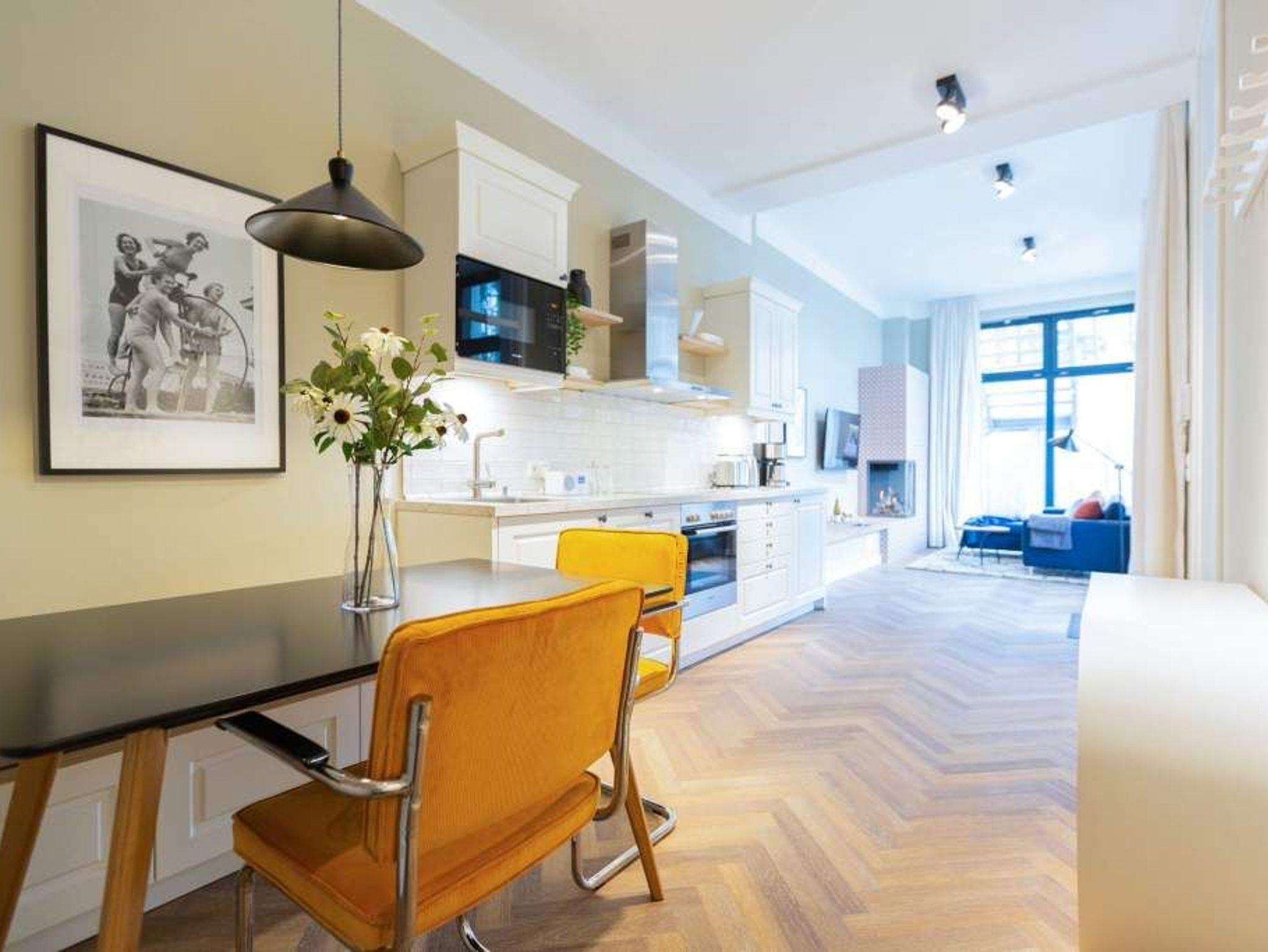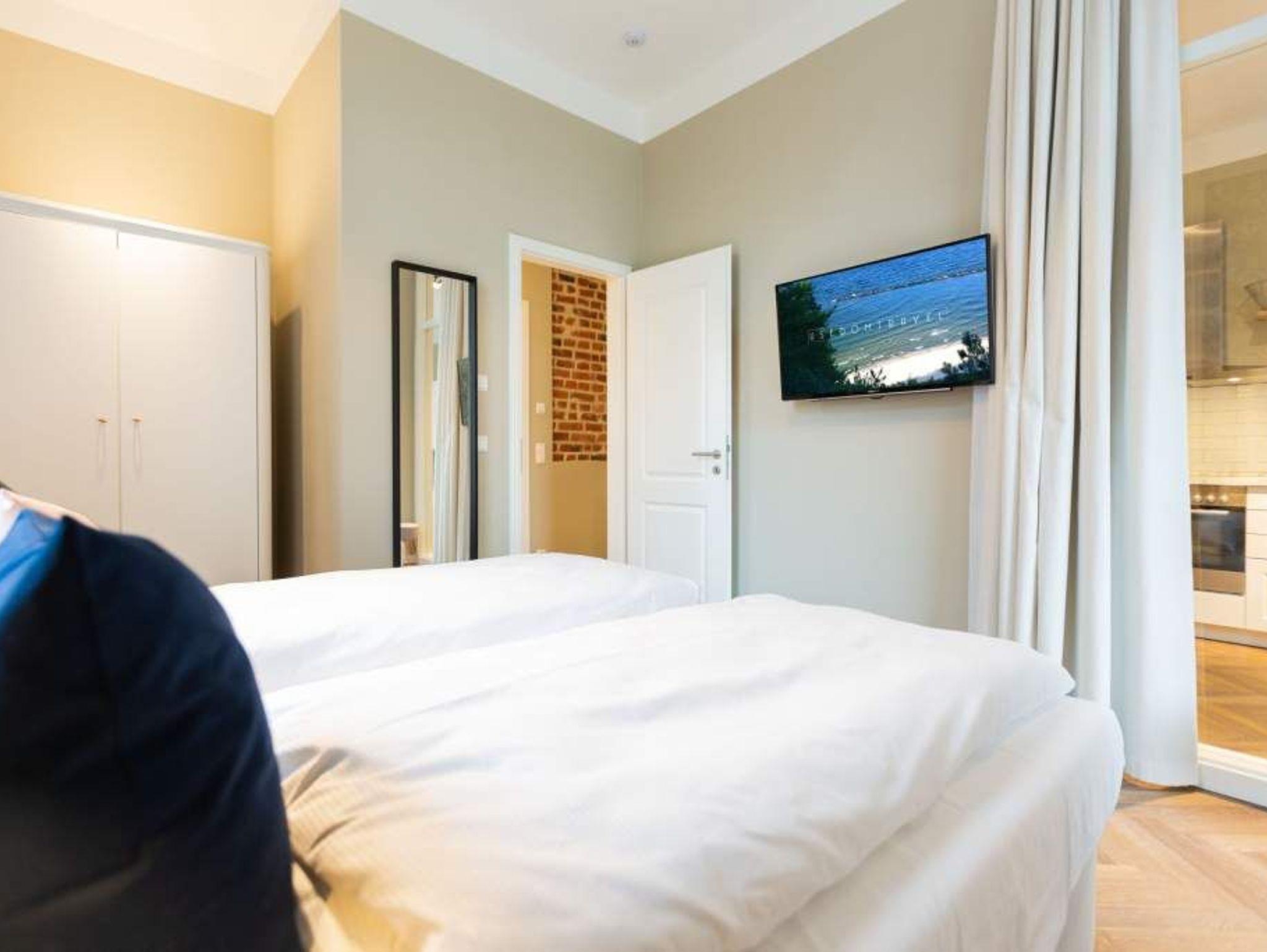Vom Fischgrät-Parkett bis zu den edlen Design-Tapeten ? in der geschmackvoll eingerichteten Wohnung Nummer 3 im Erdgeschoss der Villa Bellevue hat alles Stil. Mit einem Händchen für exquisite Möbel und viel Liebe zum Detail ist das ganze Interieur des 70-Quadratmeter-Appartements in sich stimmig und besticht vom ersten Moment an als eine echte Wohlfühloase für Designliebhaber. Vor allem die Kombination aus sichtbar gelassener Bausubstanz und modernem Wohnkonzept macht einen großen Reiz dieses Domizils aus. Genießen Sie hier Ihre Auszeit mit Freunden oder der Familie. Vier Erwachsenen mit bis zu zwei Kindern bis drei Jahre (im Kinderreisebett) bieten die drei Räume viel Platz zum Entspannen und Urlauben. Highlight des offenen Wohn-Esszimmers ist der schöne, mit Vintage-Fliesen eingefasste Gas-Kamin, der per Knopfdruck wohlige Wärme spendet und mit seinem Flammenspiel ein wahrer Entschleuniger ist. Den besten Blick darauf haben Sie von der gemütlichen Sofalandschaft des Wohnbereichs. Für Unterhaltung sorgt zudem der 42-Zoll-Flat TV. Die West-Terrasse vor dem Wohnzimmer lädt zum Sonnen, Faulenzen und Sitzen ein. Vor allem gegen Abend ist sie ein wunderbar sonniges Plätzchen. Die weiße und offene Küche im Landhausstil ist mit allen modernen Geräten ausgestattet, die es für ein gemeinsames Kochevent braucht. Der Essplatz mit den stylischen Retro-Freischwingern eignet sich ideal zum Dinieren und Diskutieren. Die beiden Schlafzimmer warten mit jeweils einem komfortablen Boxspringdoppelbett (beide 1,80 m x 2,00 m) nur darauf, Ihnen auch nachts Freude zu bereiten. Wunderschön sind die in beiden Zimmern unterschiedlichen Tapeten. Wellness in den eigenen vier Wänden, das können Sie in der finnische Sauna genießen. Die anschließende Dusche im geräumigen Badezimmer kann bei so viel Platz sogar zu zweit Spaß machen. Die Wohnung hat einen kostenfreien WLAN-Zugang und einen Pkw-Stellpatz. Lassen Sie sich einfach fallen. Wir haben für Sie die Betten bei der Anreise bezogen und Handtücher bereit gelegt.
