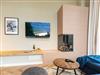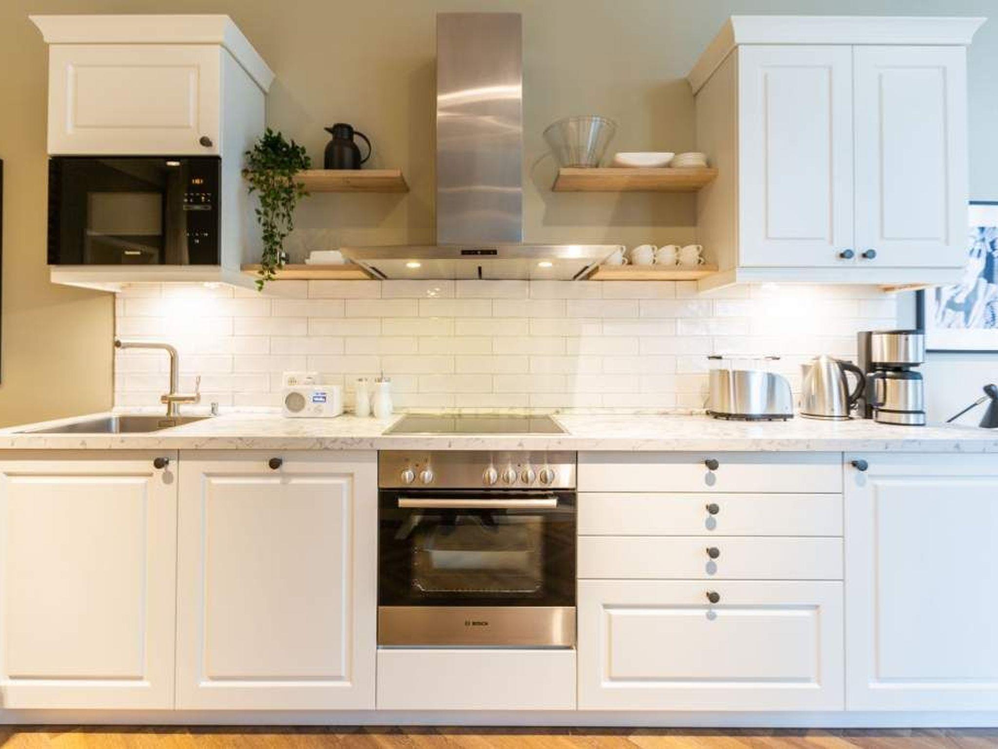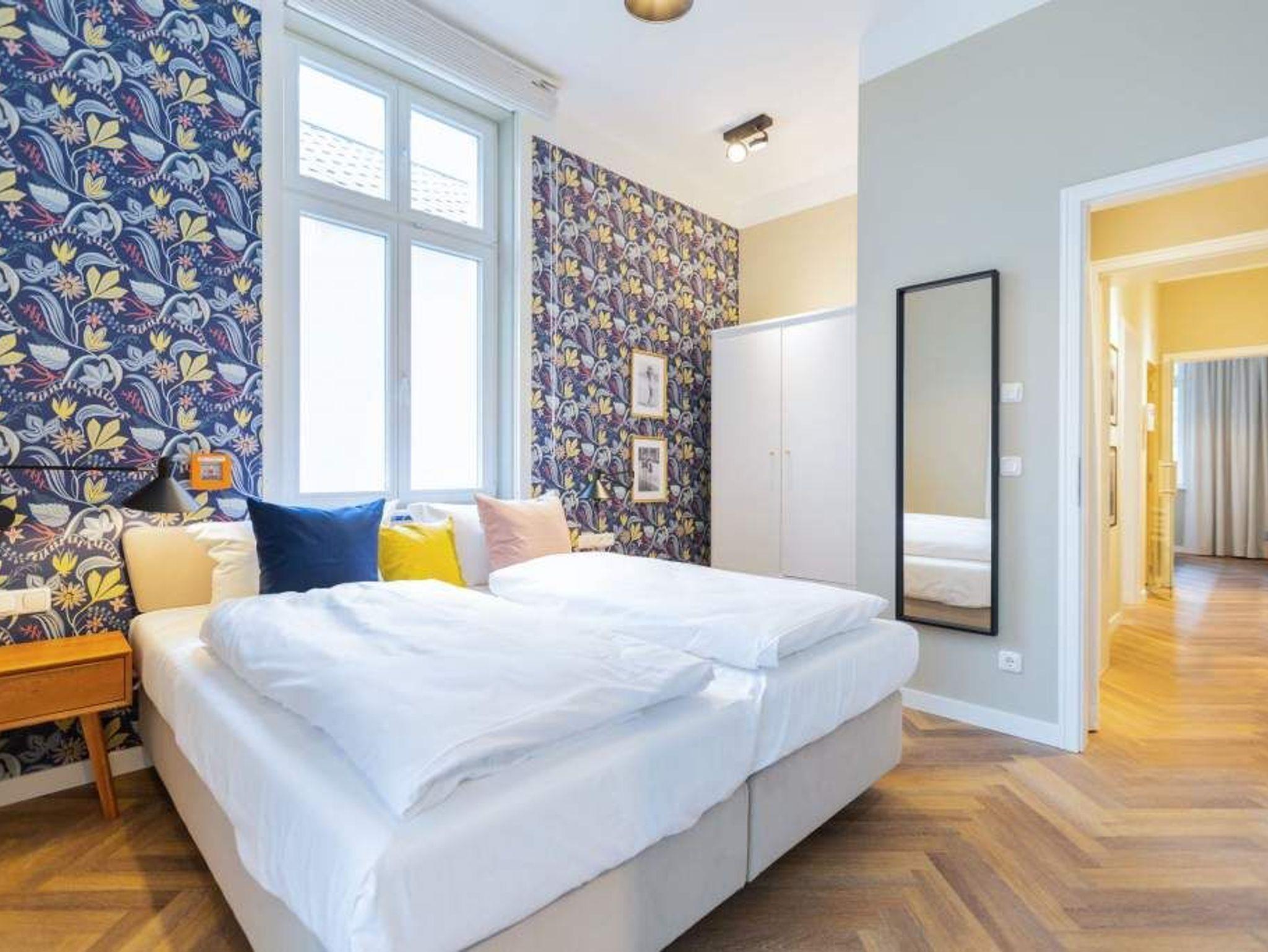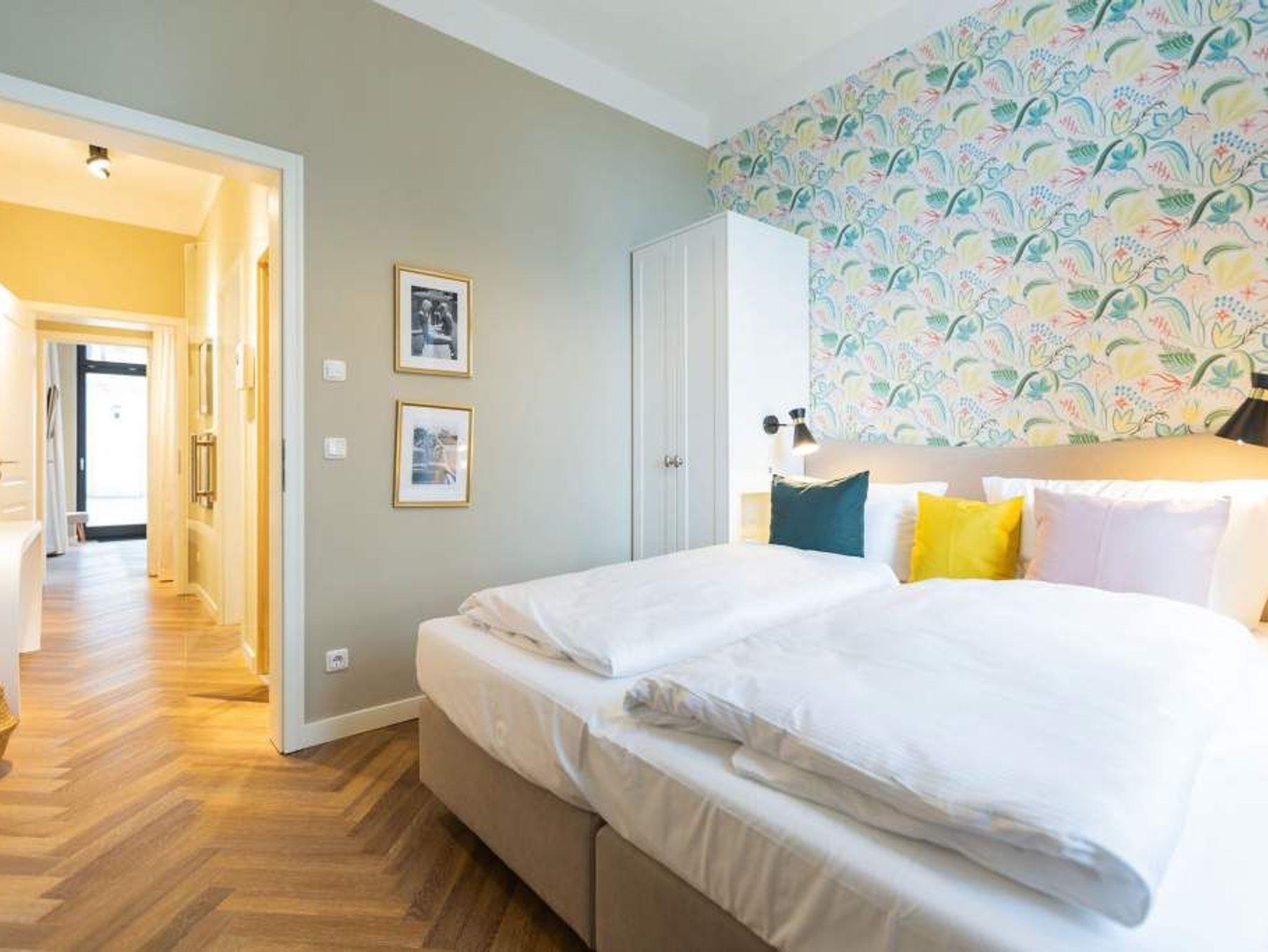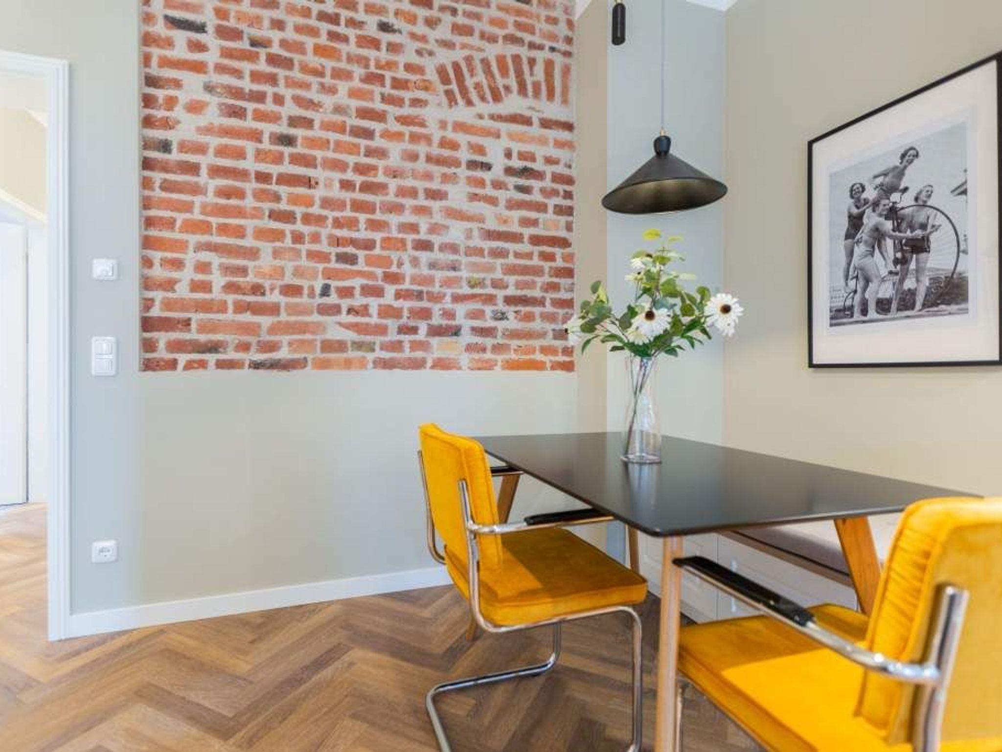 Vom Fischgrät-Parkett bis zu den edlen Design-Tapeten ? in der geschmackvoll eingerichteten Wohnung Nummer 3 im Erdgeschoss der Villa Bellevue hat alles Stil. Mit einem Händchen für exquisite Möbel und viel Liebe zum Detail ist das ganze Interieur des 70-Quadratmeter-Appartements in sich stimmig und besticht vom ersten Moment an als eine echte Wohlfühloase für Designliebhaber. Vor allem die Kombination aus sichtbar gelassener Bausubstanz und modernem Wohnkonzept macht einen großen Reiz dieses Domizils aus. Genießen Sie hier Ihre Auszeit mit Freunden oder der Familie. Vier Erwachsenen mit bis zu zwei Kindern bis drei Jahre (im Kinderreisebett) bieten die drei Räume viel Platz zum Entspannen und Urlauben. Highlight des offenen Wohn-Esszimmers ist der schöne, mit Vintage-Fliesen eingefasste Gas-Kamin, der per Knopfdruck wohlige Wärme spendet und mit seinem Flammenspiel ein wahrer Entschleuniger ist. Den besten Blick darauf haben Sie von der gemütlichen Sofalandschaft des Wohnbereichs. Für Unterhaltung sorgt zudem der 42-Zoll-Flat TV. Die West-Terrasse vor dem Wohnzimmer lädt zum Sonnen, Faulenzen und Sitzen ein. Vor allem gegen Abend ist sie ein wunderbar sonniges Plätzchen. Die weiße und offene Küche im Landhausstil ist mit allen modernen Geräten ausgestattet, die es für ein gemeinsames Kochevent braucht. Der Essplatz mit den stylischen Retro-Freischwingern eignet sich ideal zum Dinieren und Diskutieren. Die beiden Schlafzimmer warten mit jeweils einem komfortablen Boxspringdoppelbett (beide 1,80 m x 2,00 m) nur darauf, Ihnen auch nachts Freude zu bereiten. Wunderschön sind die in beiden Zimmern unterschiedlichen Tapeten. Wellness in den eigenen vier Wänden, das können Sie in der finnische Sauna genießen. Die anschließende Dusche im geräumigen Badezimmer kann bei so viel Platz sogar zu zweit Spaß machen. Die Wohnung hat einen kostenfreien WLAN-Zugang und einen Pkw-Stellpatz. Lassen Sie sich einfach fallen. Wir haben für Sie die Betten bei der Anreise bezogen und Handtücher bereit gelegt.