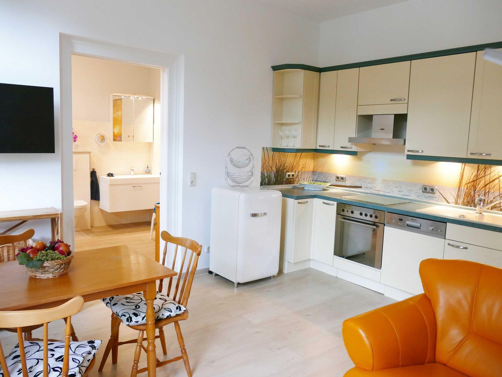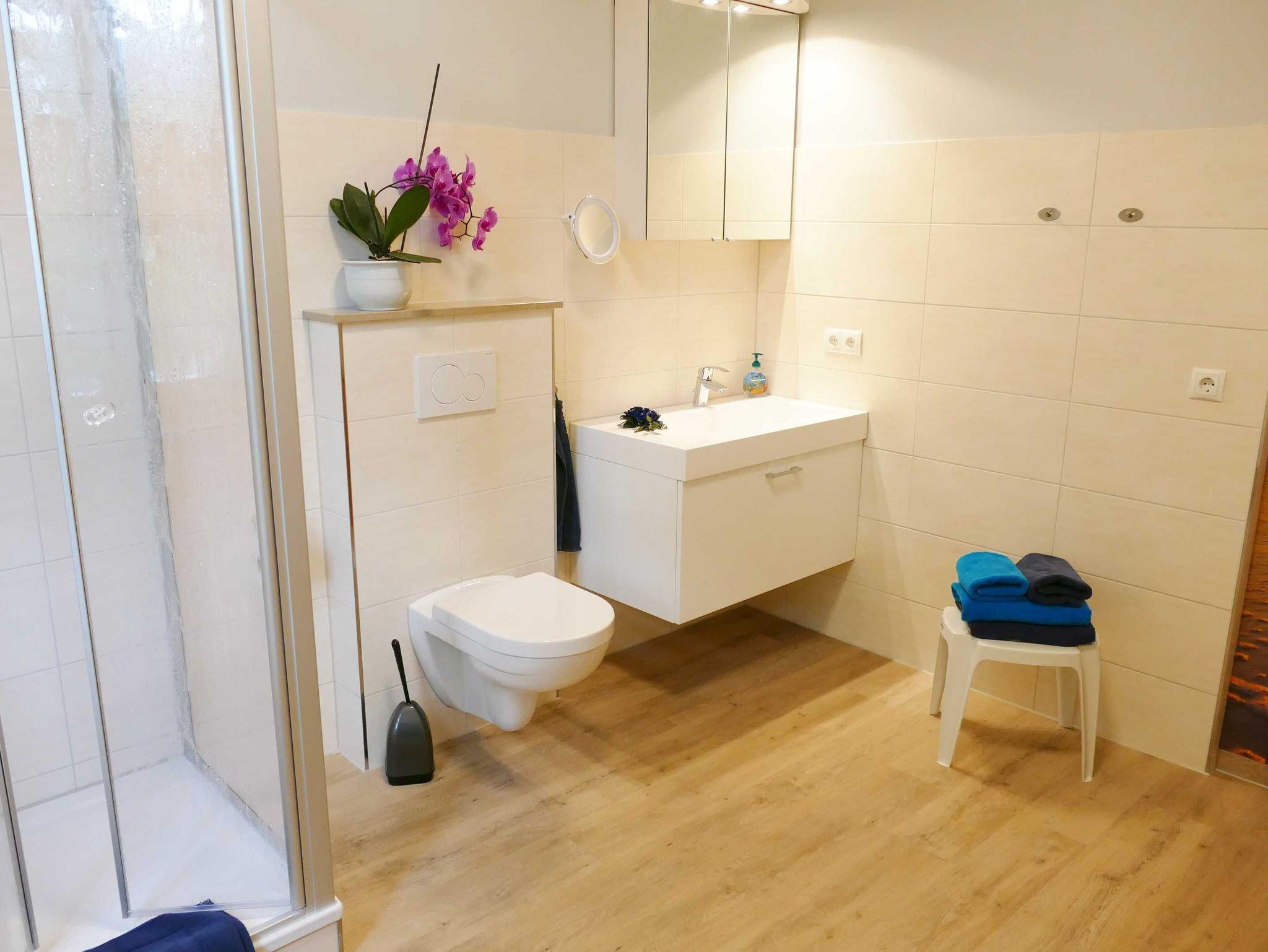 Hell und behaglich - Mit großzügigen 70 qm bietet diese Ferienwohnung bequem Platz für zwei bis drei Personen und sie befindet sich im ersten Stock des Hauses des Vermieters. Die Wohnung verfügt über ein einladendes Wohnzimmer mit einer gemütlichen Couchecke, einem Flachbild-TV, einer Essecke und einer offenen Küche. Diese ist bestens ausgestattet mit einem Elektroherd, Backofen, Spülmaschine, Kühlschrank, Kaffeemaschine, Wasserkocher und Toaster - alles, was Sie für einen angenehmen Aufenthalt benötigen. Im Schlafzimmer erwarten Sie ein komfortables Doppelbett und ein Einzelbett, sowie ein weiterer Flachbild-TV für entspannte Abende. Das geräumige Tageslichtbad ist mit einer Dusche und WC ausgestattet und sorgt für zusätzlichen Komfort. Genießen Sie auch die Terrasse auf dem Grundstück, die zur Gemeinschaftsnutzung zur Verfügung steht. Auf Anfrage können Sie hier sogar grillen! Ihr Fahrzeug können Sie bequem unter einem Carport direkt am Haus parken. WLAN ist selbstverständlich inklusive.