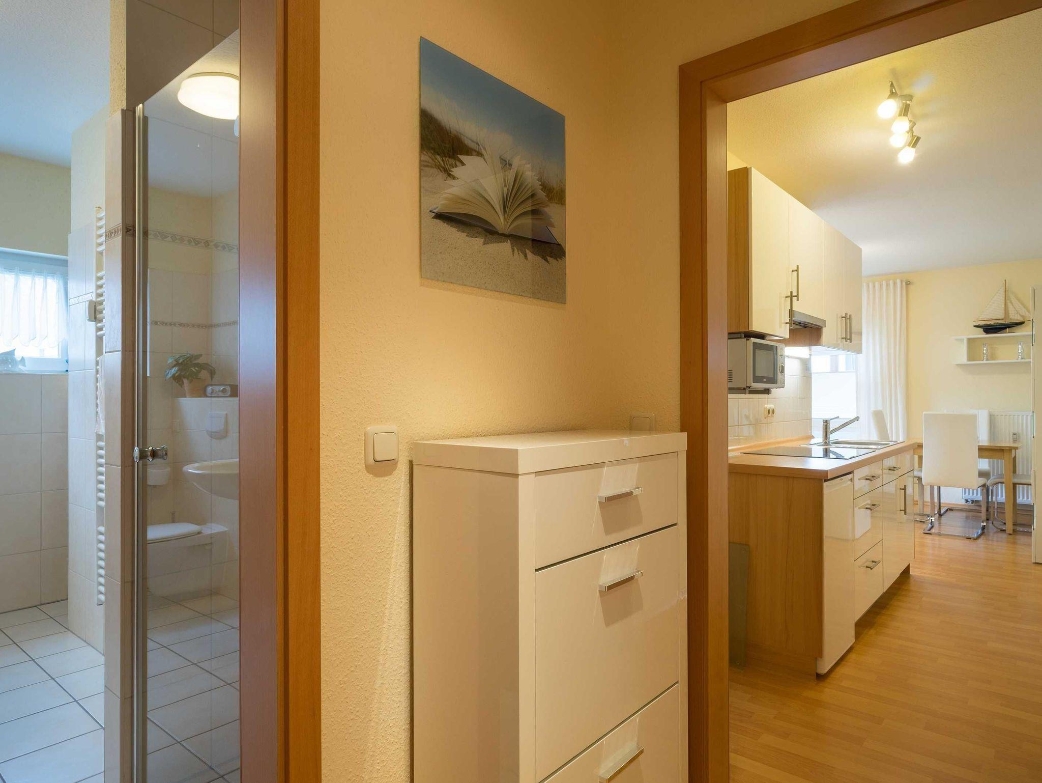 Mit ca. 42 qm bietet Ihnen diese moderne 2-Raum-Ferienwohnung alles, was Sie für einen entspannten Aufenthalt brauchen. Die Wohnung befindet sich in der ersten Etage und verfügt über einen großzügigen Eckbalkon, der nach Nordost und Süd ausgerichtet ist - perfekt, um die Sonne zu genießen und die frische Meeresluft zu spüren. Die Einrichtung ist in natürlichen, warmen Farben gehalten, sodass Sie sich sofort wohlfühlen. Die Fenster sind mit elektrischen Rollläden versehen.