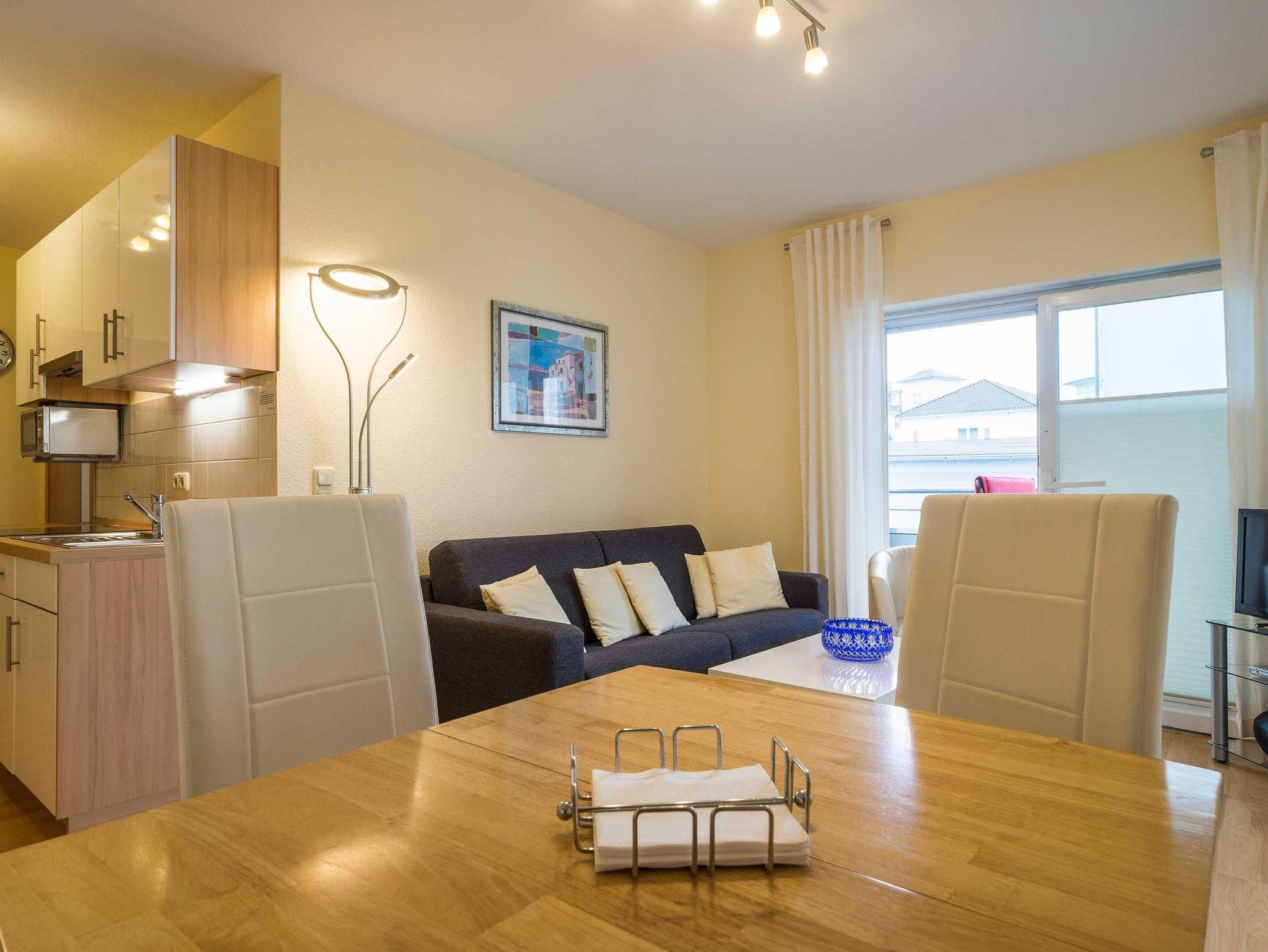 Der offene Wohnbereich mit moderner Küche ist voll ausgestattet, unter anderem mit einem Ceran-Kochherd, Mikrowelle, Geschirrspüler und vielem mehr. Im Wohnzimmer finden Sie einen Flachbild-TV, CD-Player, Radio sowie einen Esstisch mit vier Stühlen. Für zusätzliche Schlafgelegenheiten steht eine bequeme ausklappbare Schlafcouch (180x200 cm) bereit, ideal für die dritte und vierte Person. Im Schlafzimmer erwartet Sie ein großes Doppelbett und ein geräumiger Kleiderschrank, der viel Platz für Ihre Sachen bietet. Das Badezimmer ist mit einer Dusche, WC und Duschhocker ausgestattet und bietet ausreichend Ablagemöglichkeiten. Für Familien mit kleinen Kindern steht ein Kinderreisebett (gegen Gebühr von 15 €) zur Verfügung, welches Sie bitte spätestens einen Tag vor Anreise vorbestellen. Ein kostenfreier Kinderhochstuhl ist ebenfalls vorhanden. WLAN ist in der gesamten Wohnung kostenlos nutzbar, sodass Sie jederzeit verbunden bleiben können. Für Ihren PKW steht ein eigener Stellplatz in der Tiefgarage (Einfahrtshöhe 2 m) bereit. Fahrräder können in einem Radständer auf dem Grundstück abgestellt werden ? eine abschließbare Abstellmöglichkeit ist leider nicht vorhanden.
