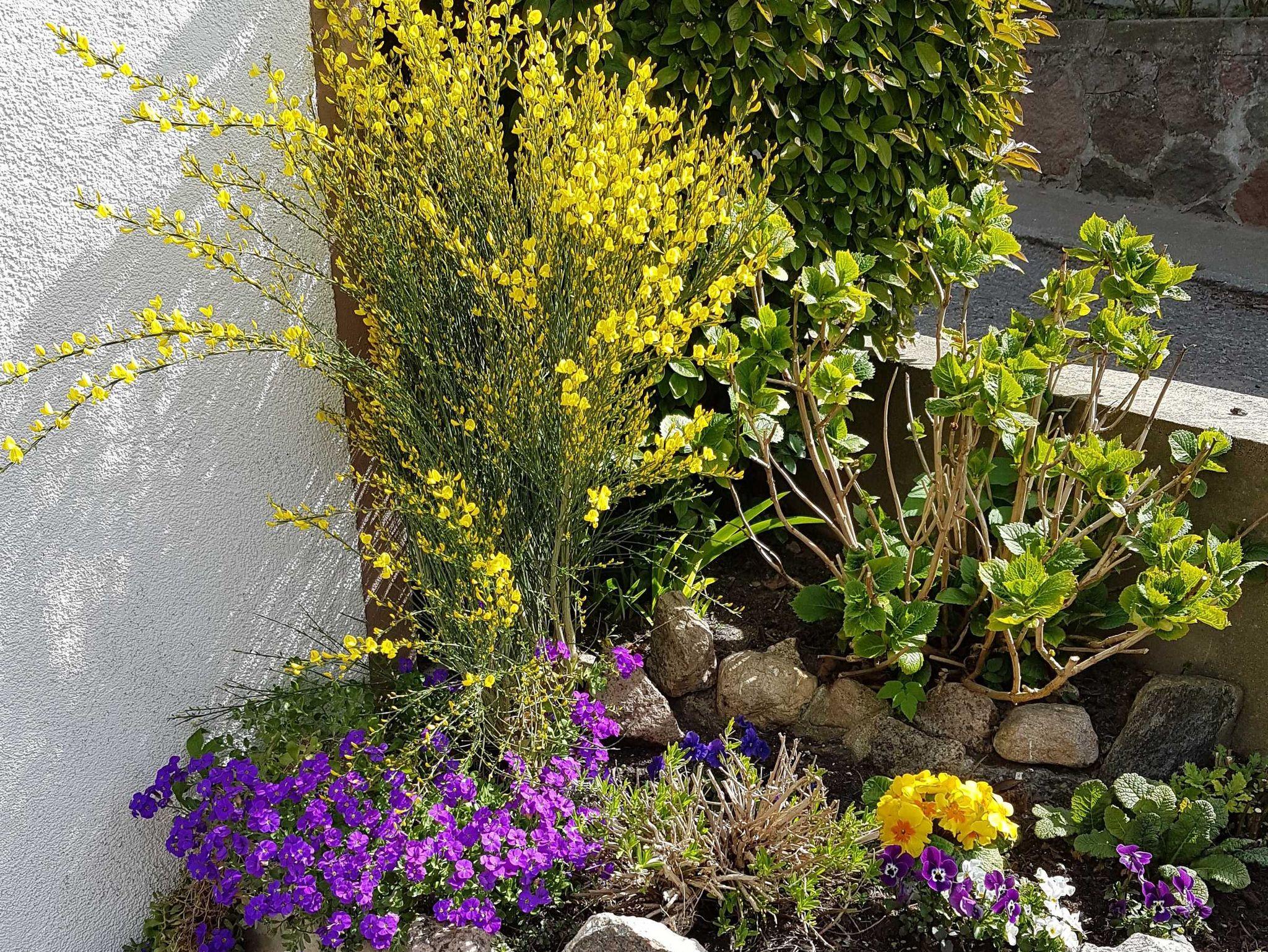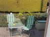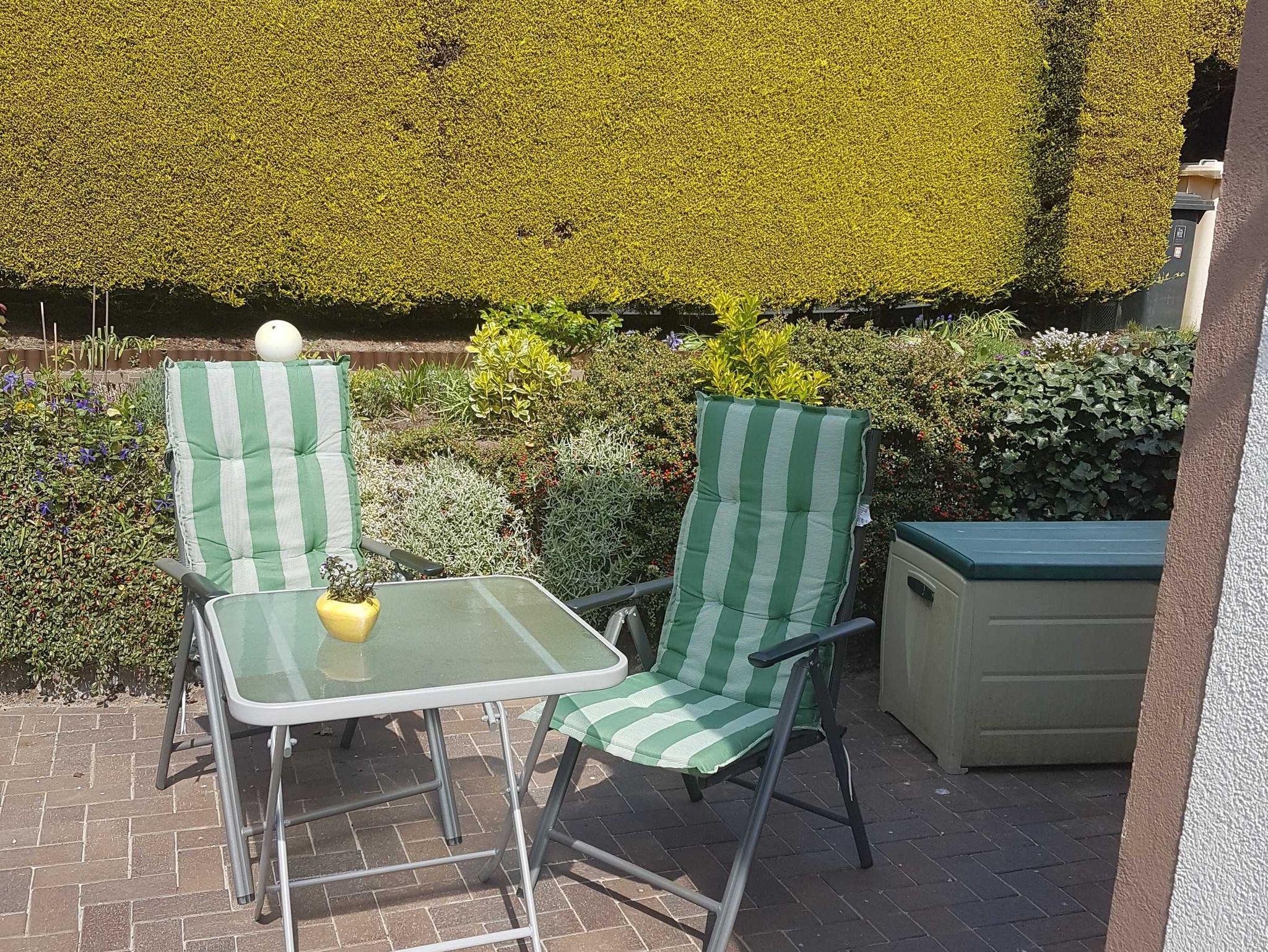 Außerhalb des Bungalows steht eine kleine Sitzecke zur Verfügung. Im Sommer kann die Wäschespinne im Garten genutzt werden.