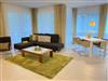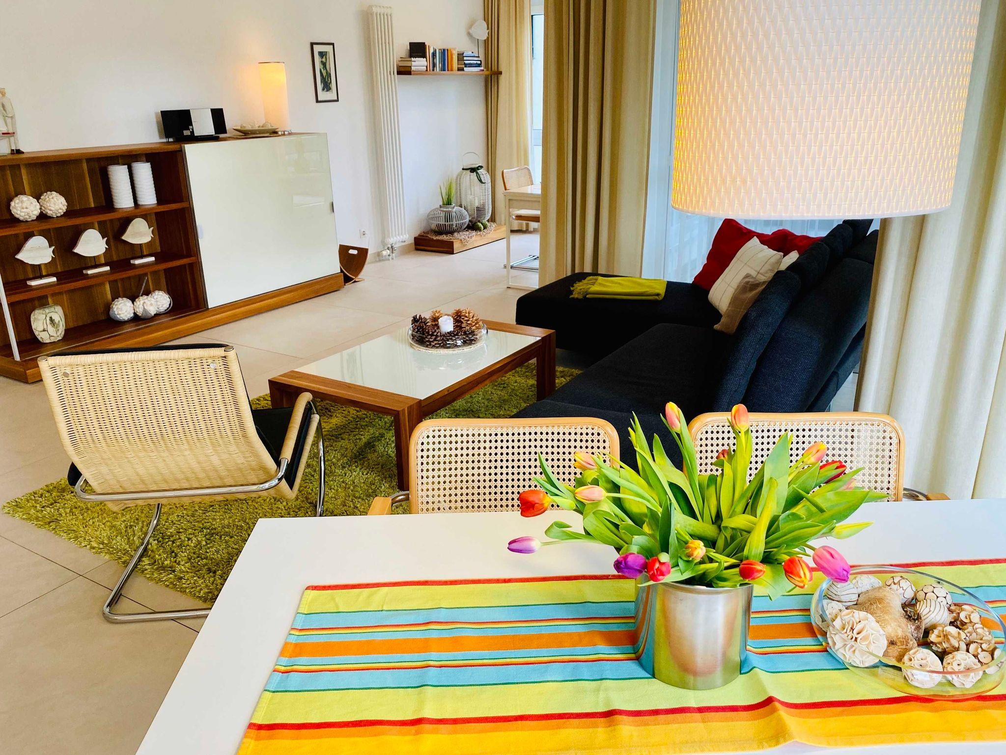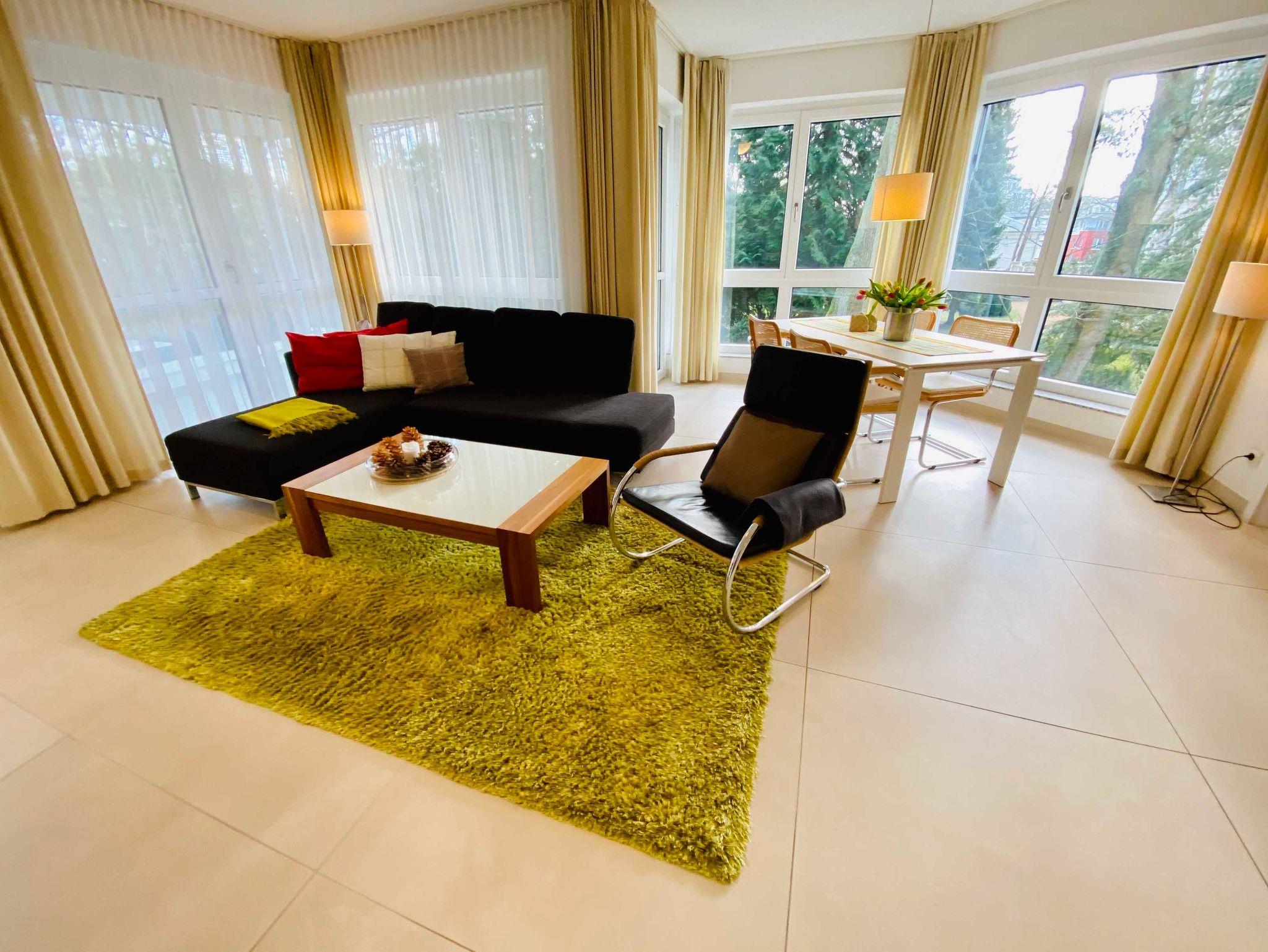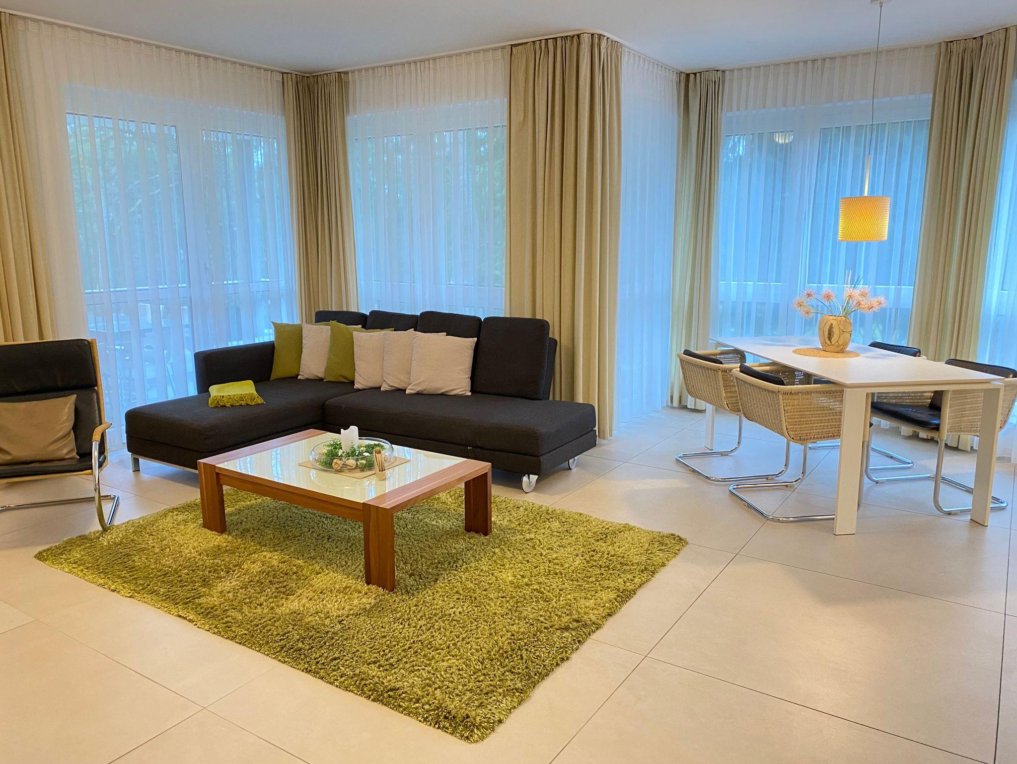 Die sehr stilvolle und hochwertig eingerichtete 3-Raumferienwohnung befindet sich im 1.OG der Villa und ist mit dem Aufzug erreichbar. Sie besteht aus einem modern eingerichteten Wohnbereich mit Couch, TV, Musikanlage und Esstisch. Vom Wohnzimmer gelangen Sie in die separater Küche mit Geschirrspüler, Mikrowelle, Herd & Backofen.