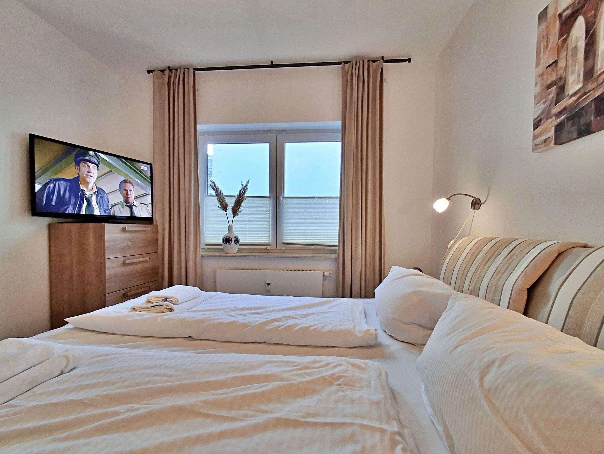 • Schlafzimmer mit großem Kleiderschrank, bequemem Doppelbett und zusätzlichem Flachbild-TV